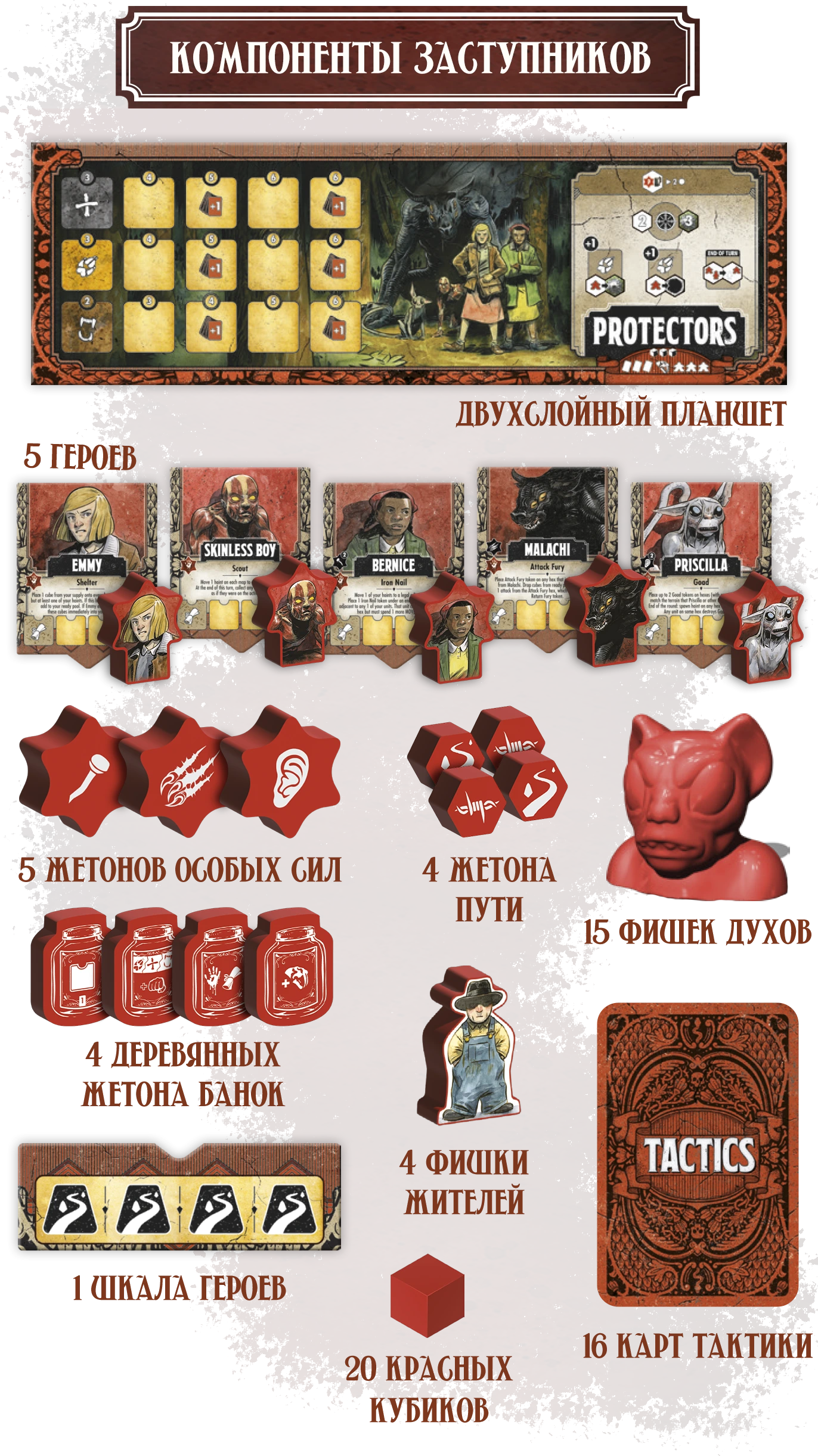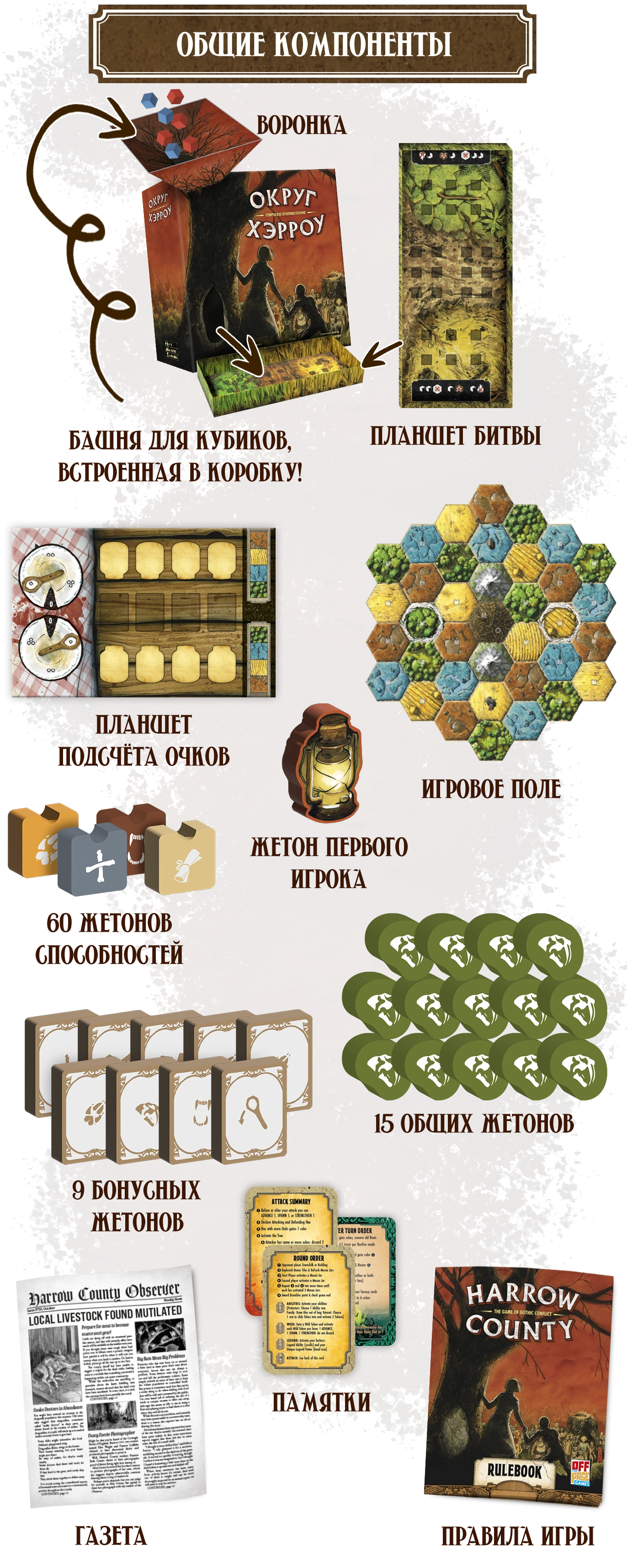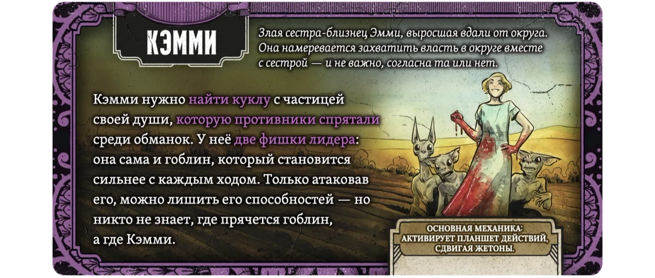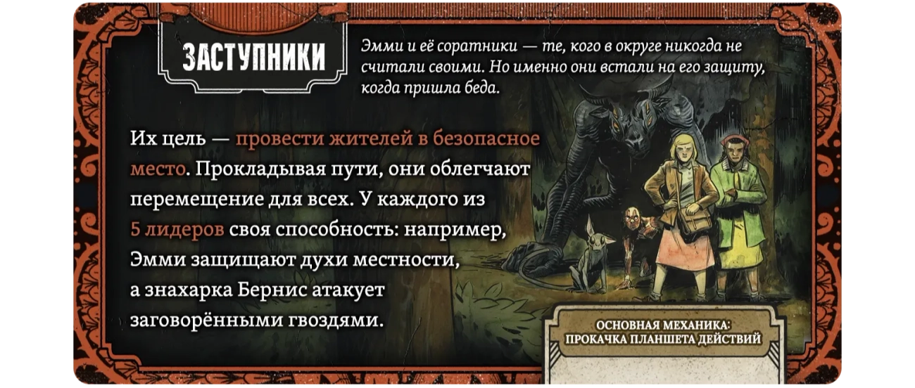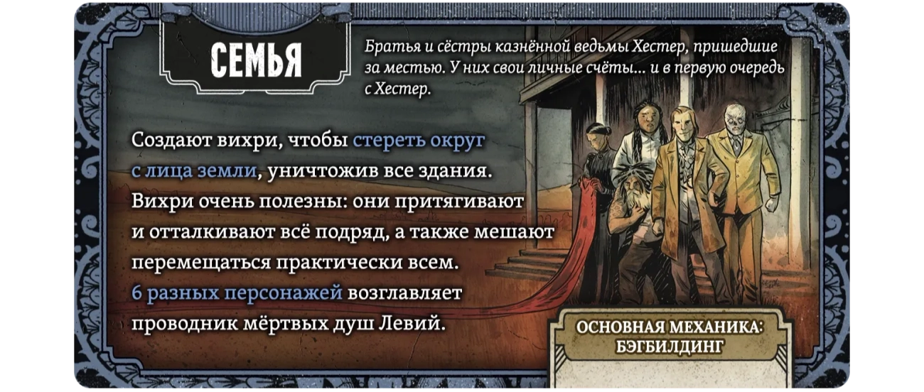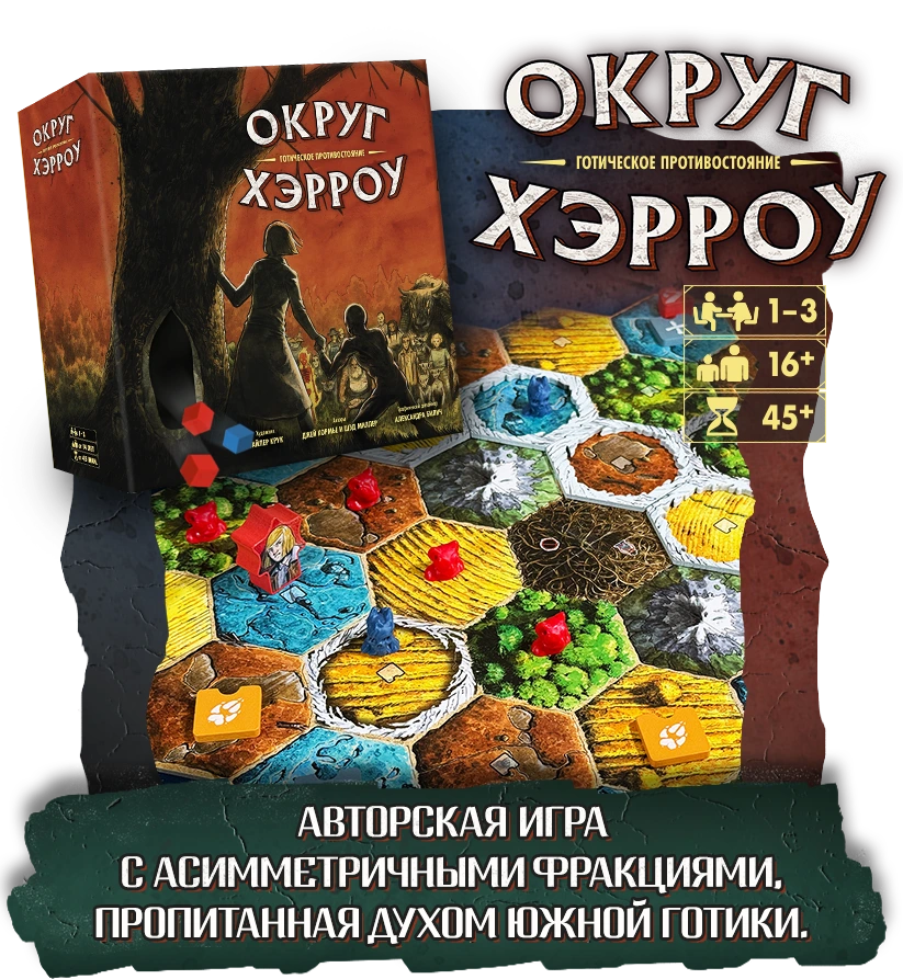 † Редкая атмосфера: сеттинг и визуальный стиль выдержаны в жанре южной готики — мрачной, фольклорной, самобытной. Такого на вашем игровом столе ещё не было!