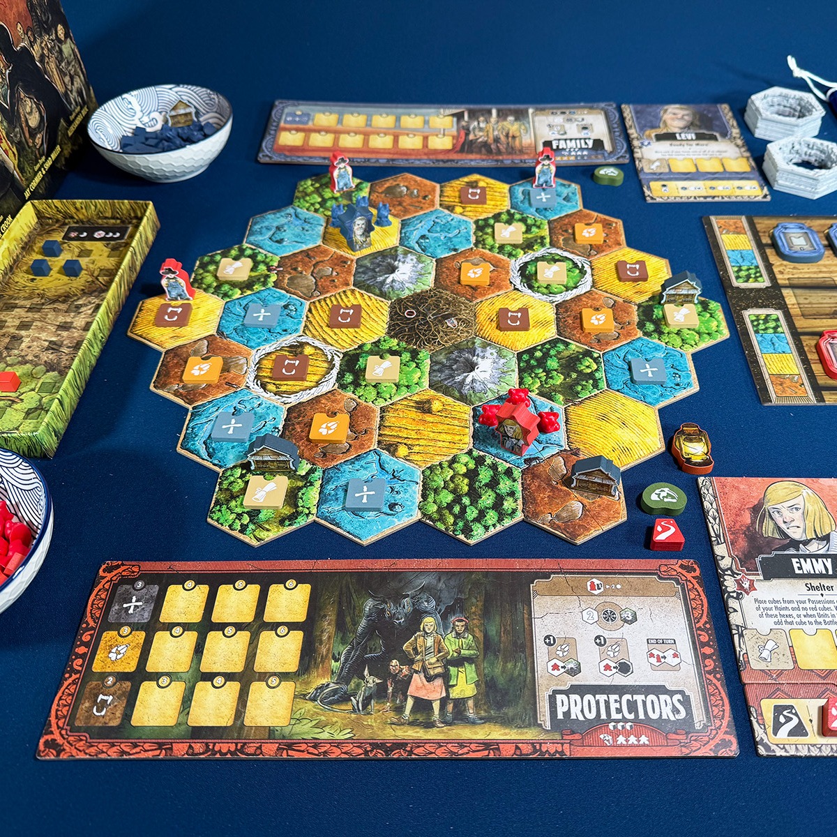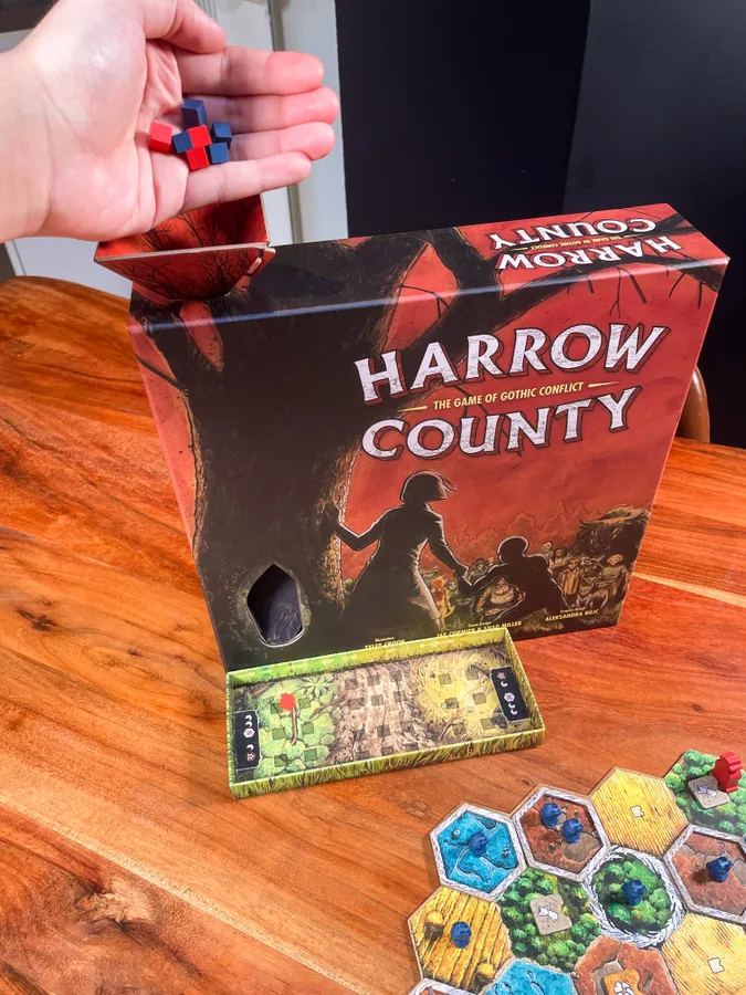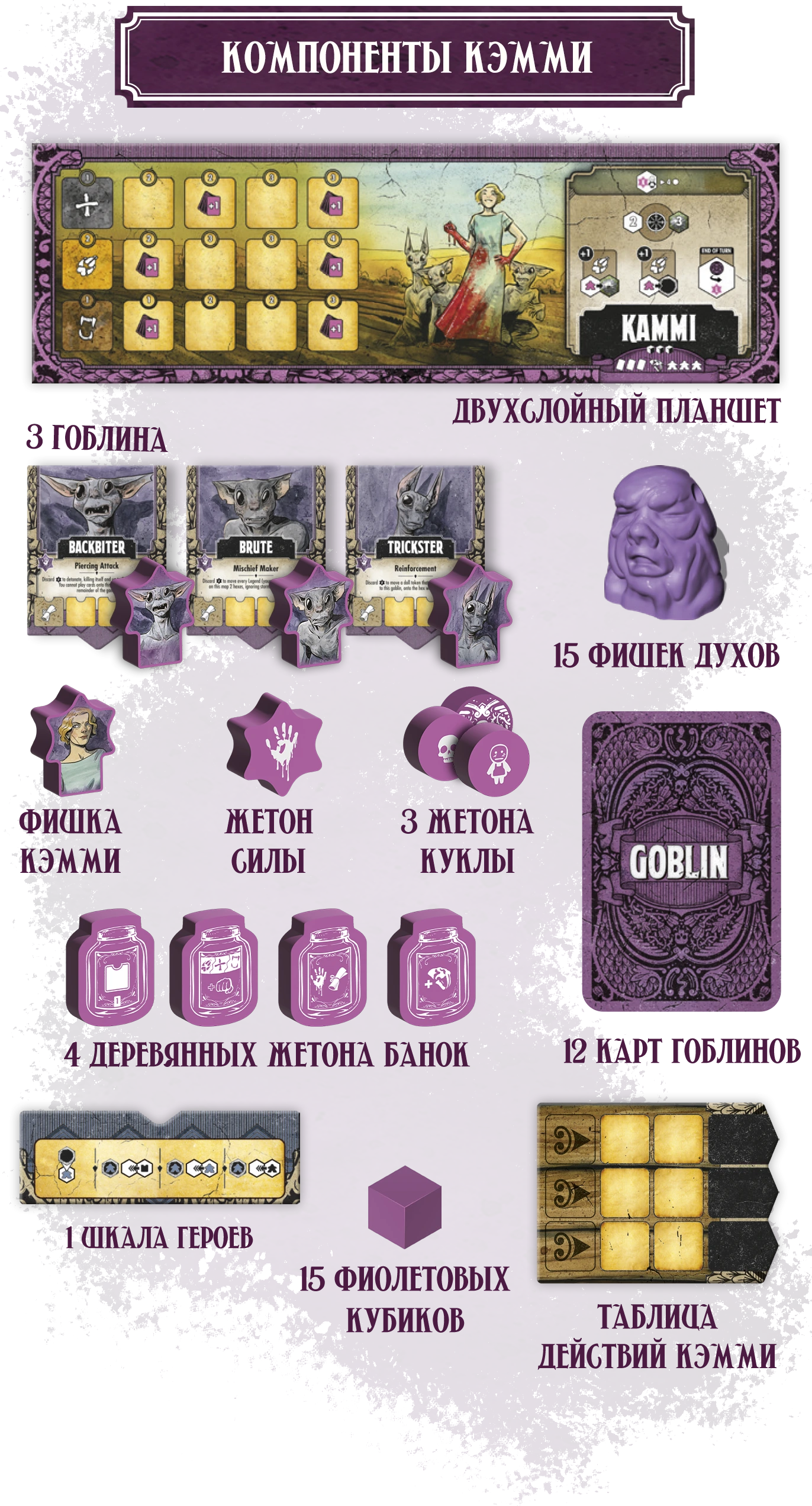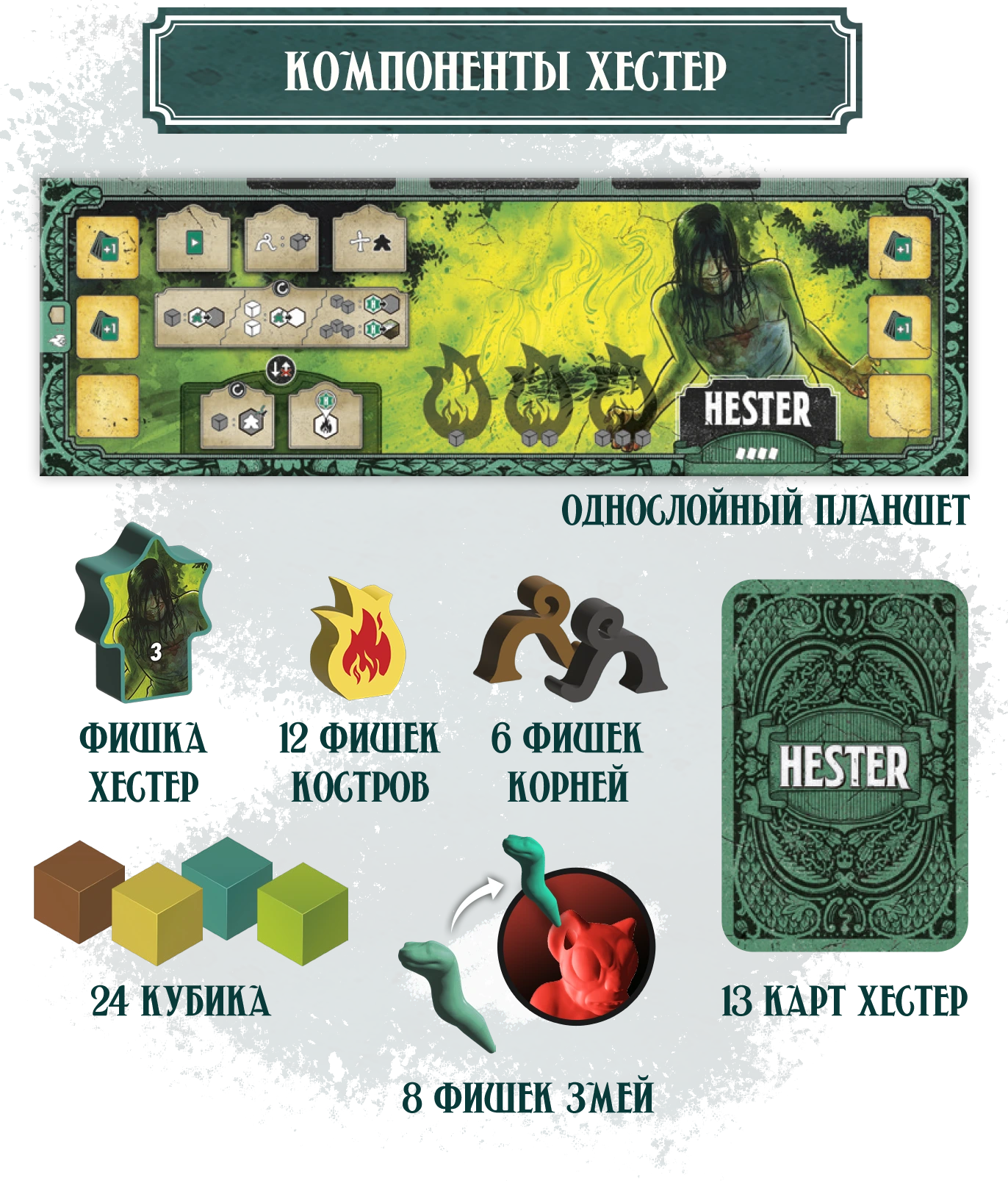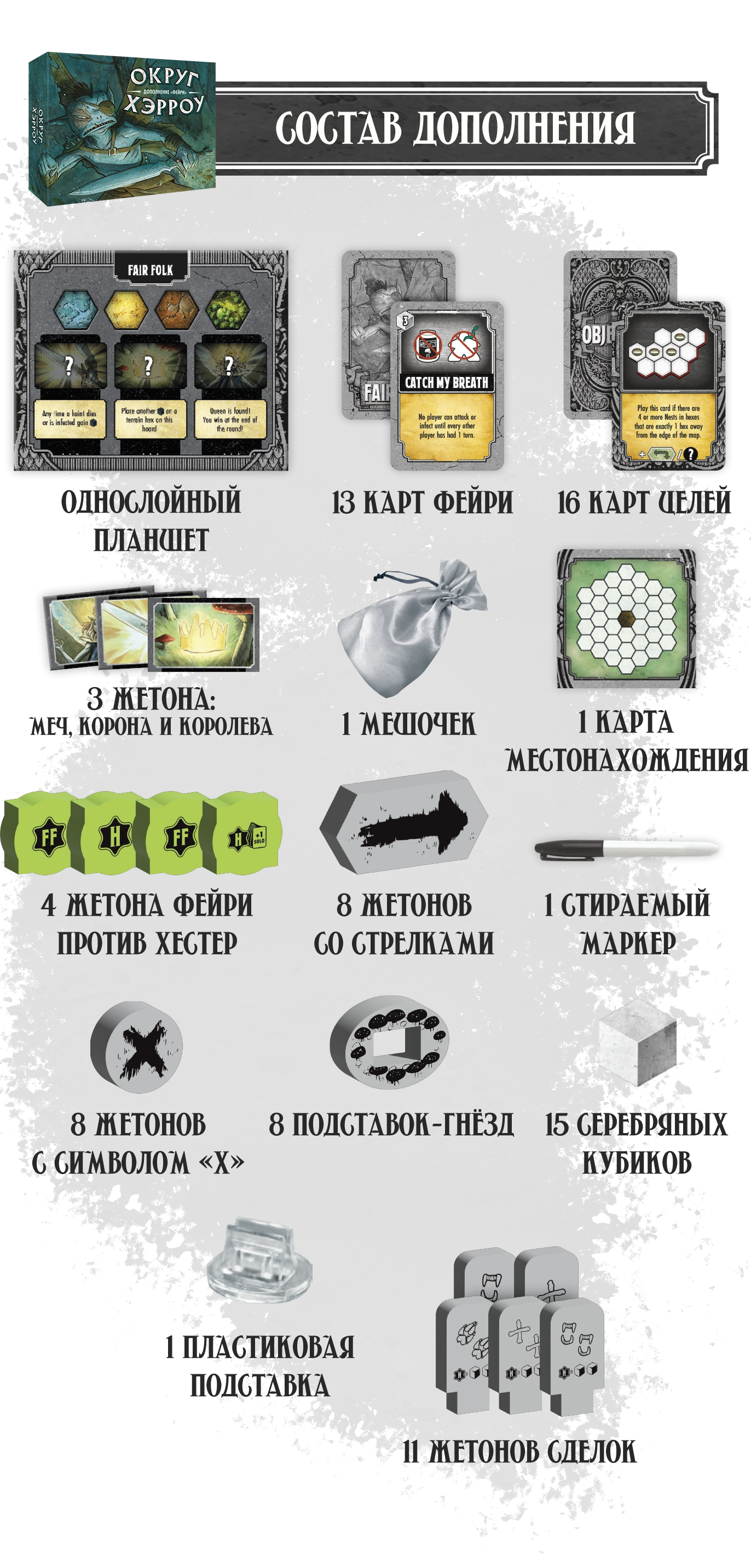 † Редкая атмосфера: сеттинг и визуальный стиль выдержаны в жанре южной готики — мрачной, фольклорной, самобытной. Такого на вашем игровом столе ещё не было!