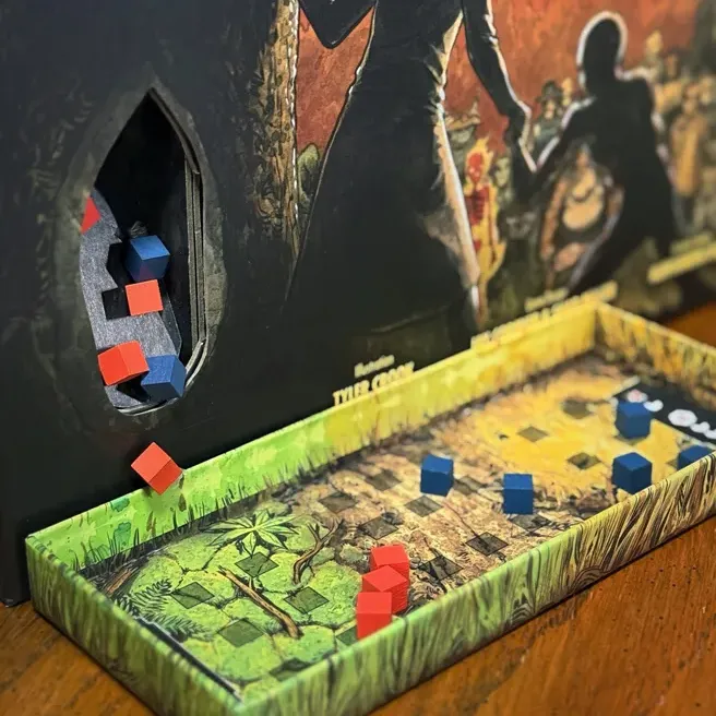 Бросайте кубики в башню-дерево, встроенную в коробку, и определяйте результаты сражения!