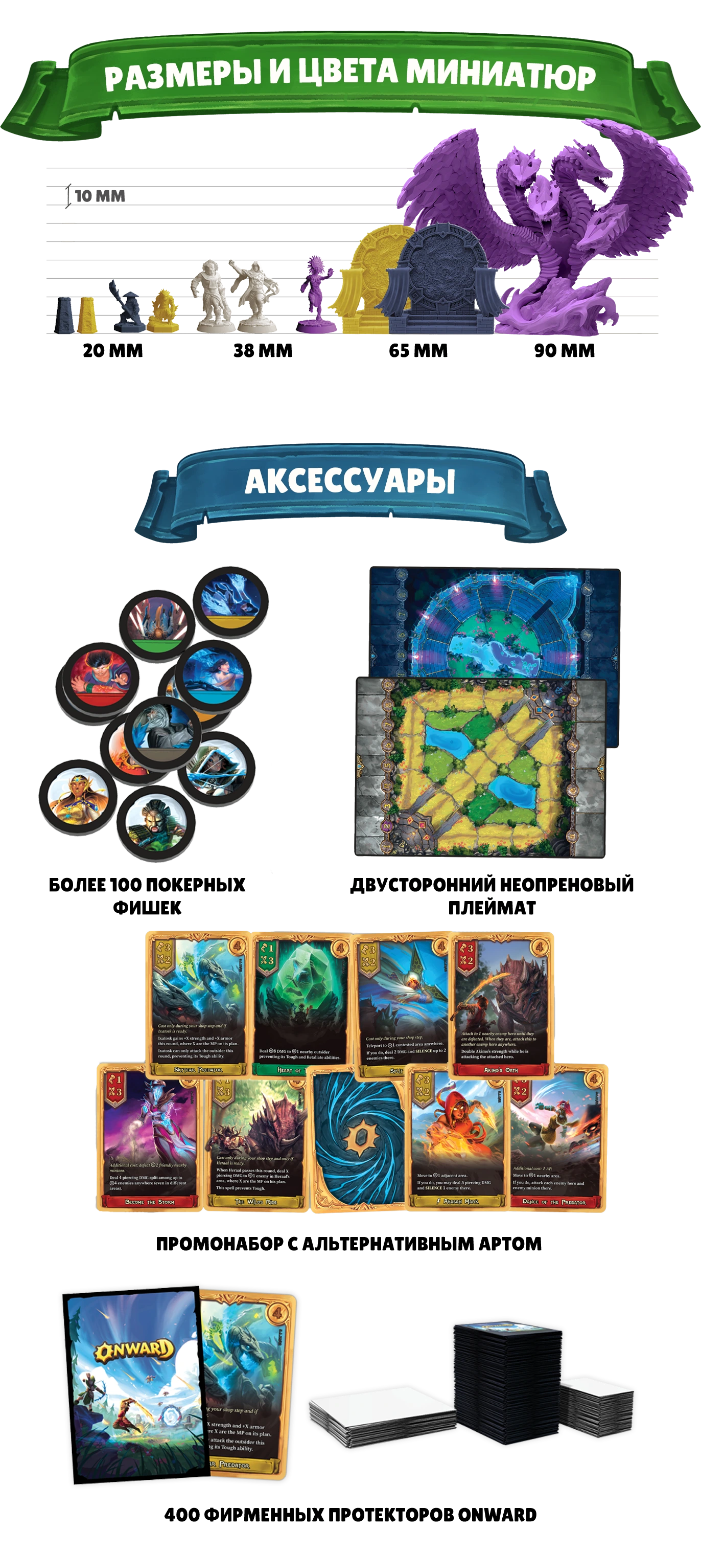 Кроме того, вы можете заказать бигбокс со всеми миниатюрами из вышедших дополнений, а также удобные аксессуары: плеймат, пластиковые фишки с металлическим сердечником и протекторы для карт.