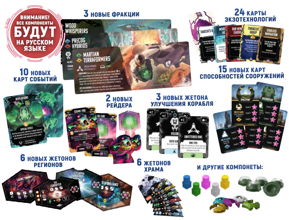 Дополнение с фокусом на построение движка. Целых 48 новых модулей! А ещё промофракции с отсылками к другим играм и три картонные промофигурки.