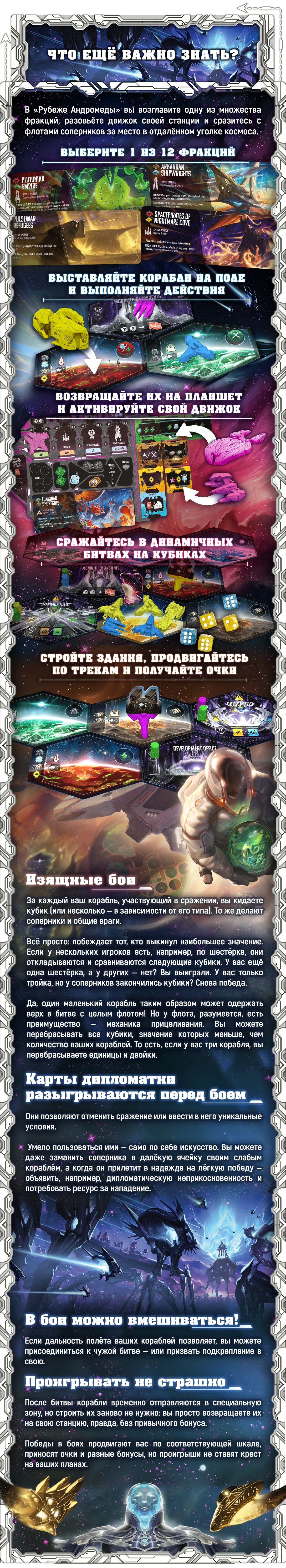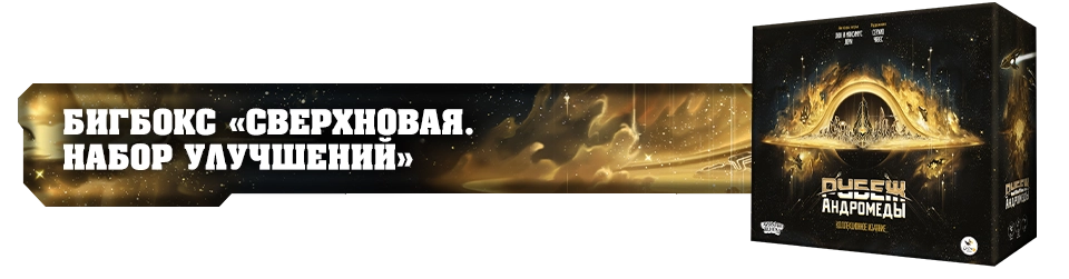 • комплект «Игровой рубеж Андромеды + бигбокс» — Dice Tower и «Галактический круиз», а также миниатюры Cosmic Frog и Cube.