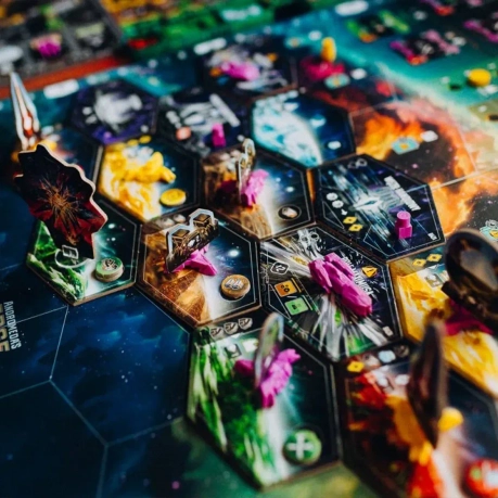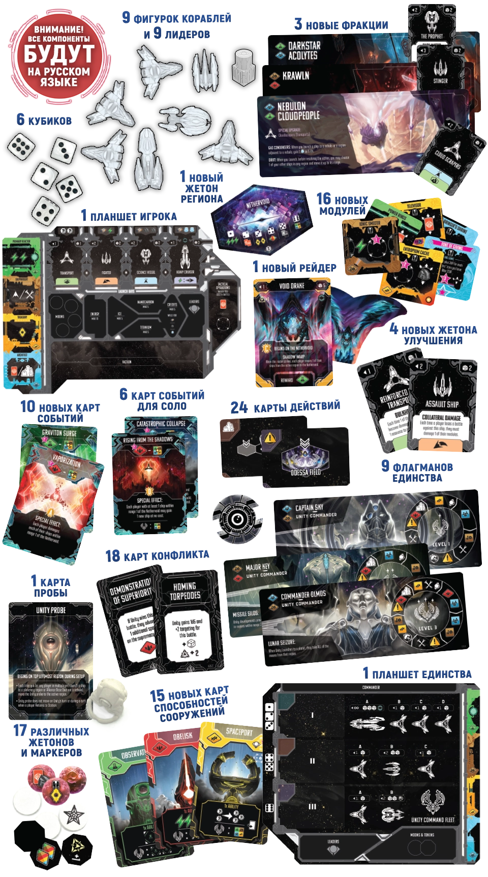Дополнение с фокусом на разнообразие. Компоненты для 5-го игрока, соло-режим, новые события, а также модули станций, жетоны поля и всё остальное!