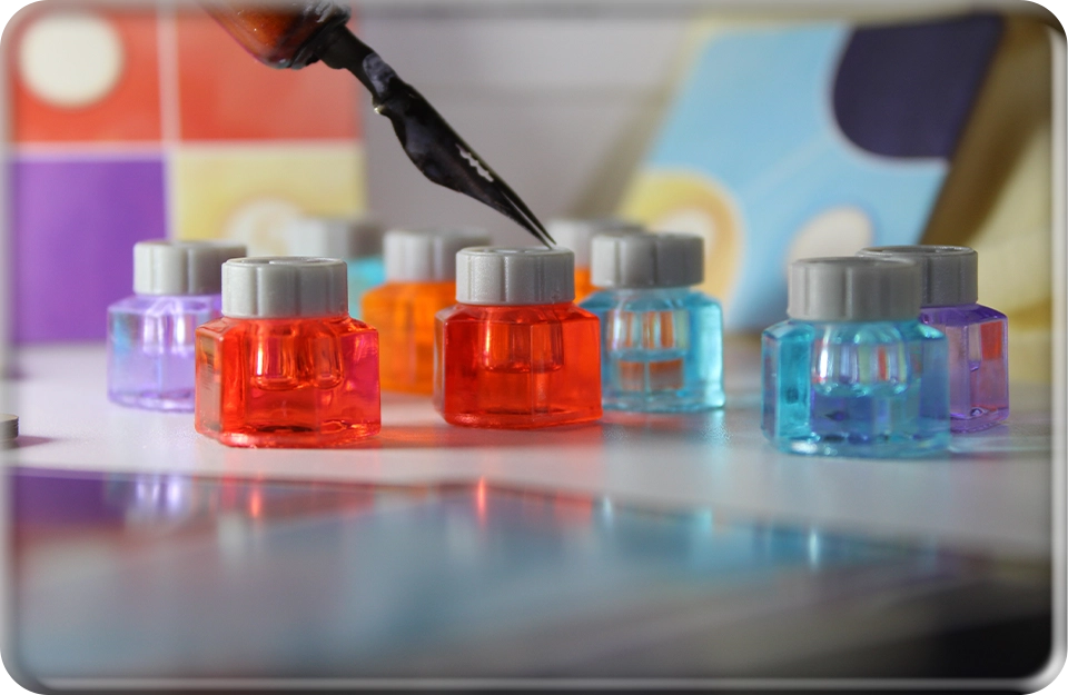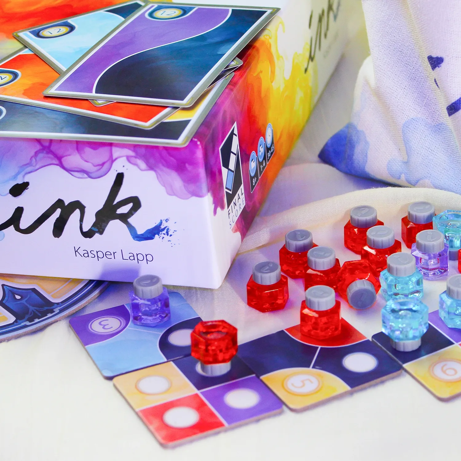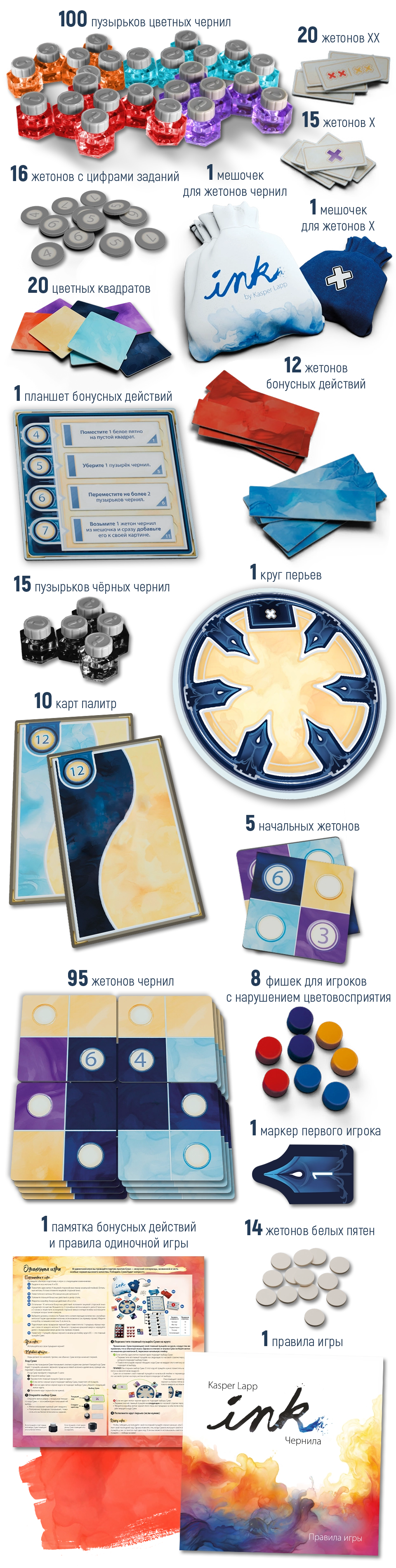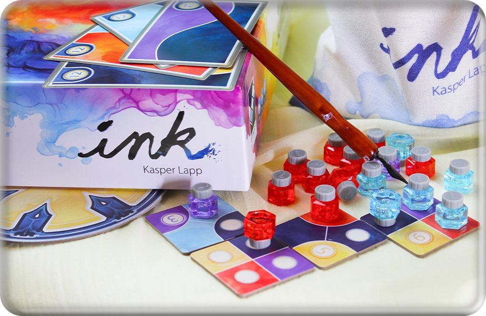 В этой игре вам предстоит создать художественное полотно и выставить на него свои пузырьки чернил. Их по 24 у каждого игрока: 12 универсальных, которые можно размещать на любых клетках, и 12 цветных.