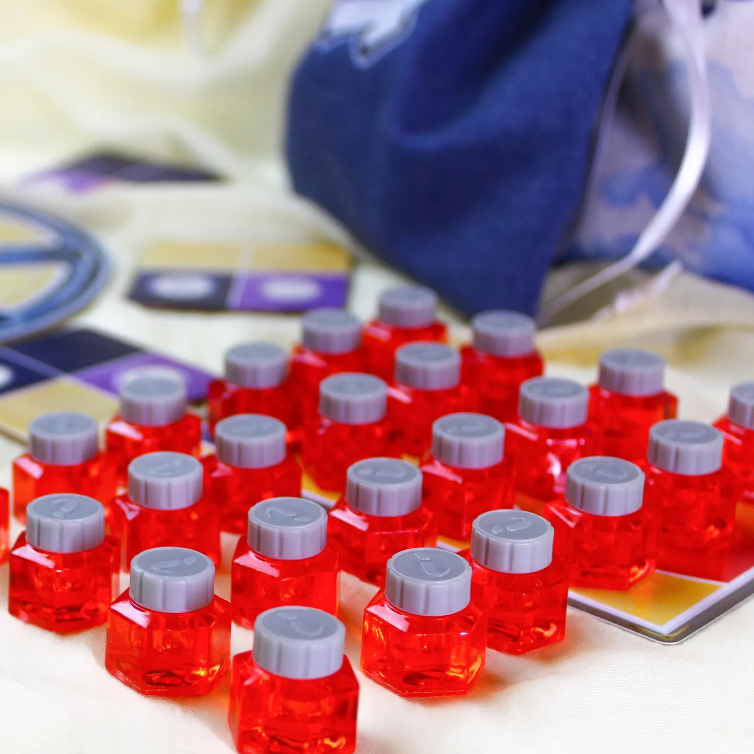 Жетон с ронделя также можно выбирать любой. Однако, если ваш пузырёк сделал полный круг, вам придётся взять жетон Х и выложить его поверх своих жетонов чернил. Закрытые клетки блокируются и больше не могут учитываться для выполнения заданий. Что такое задания? А это ваш путь к победе!