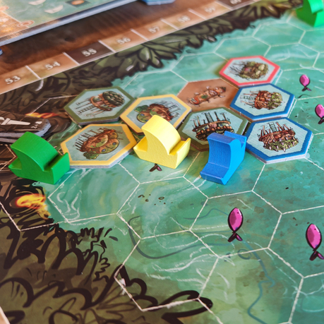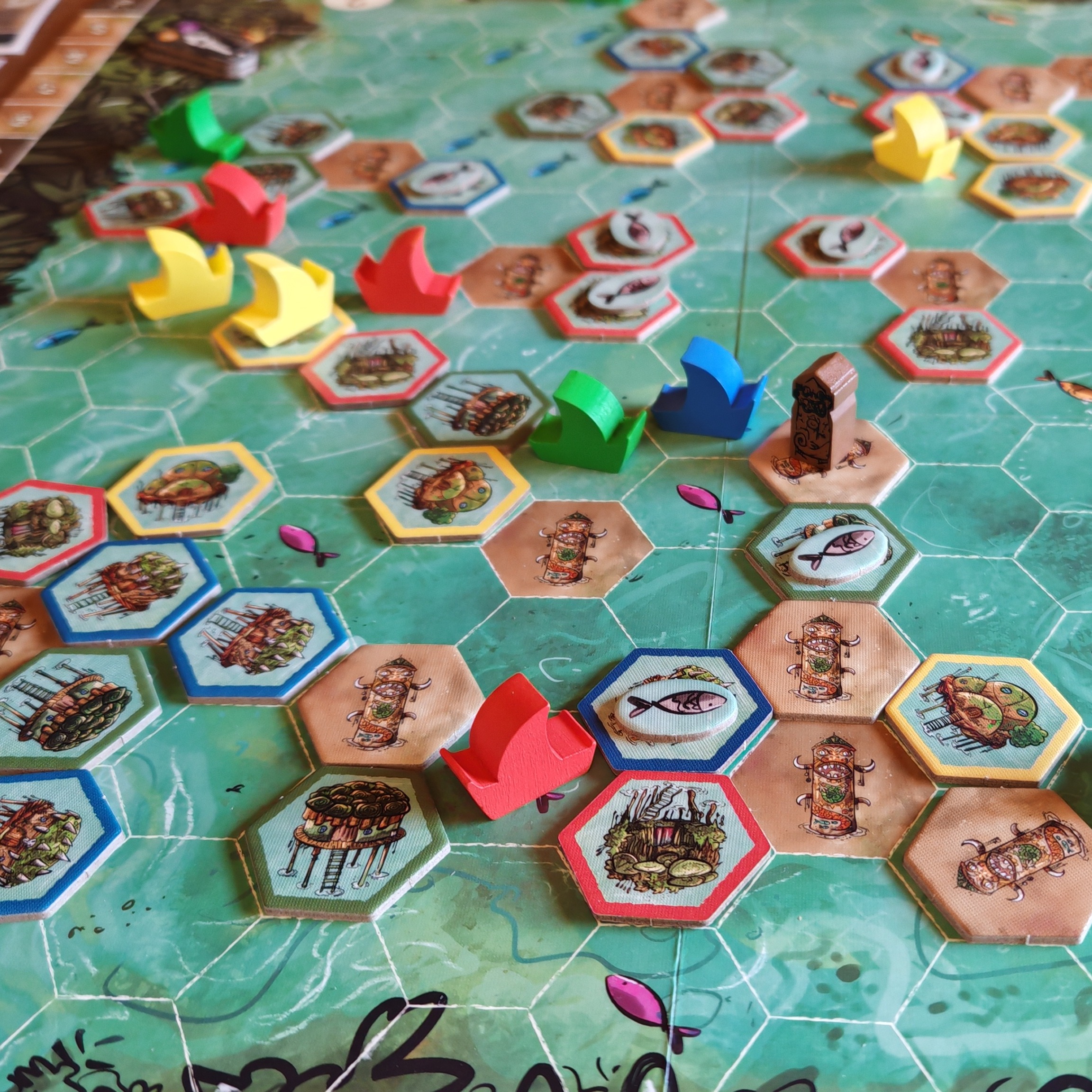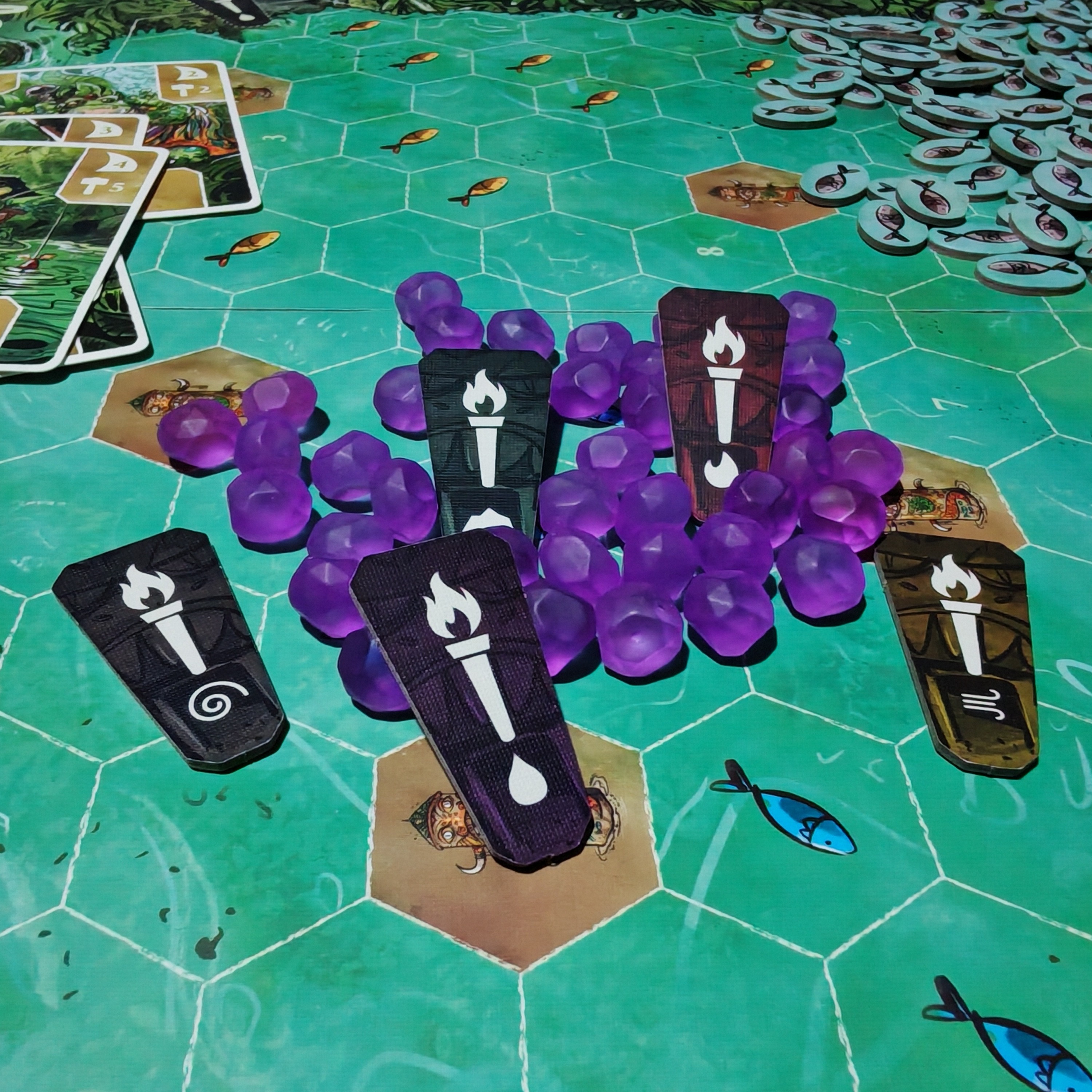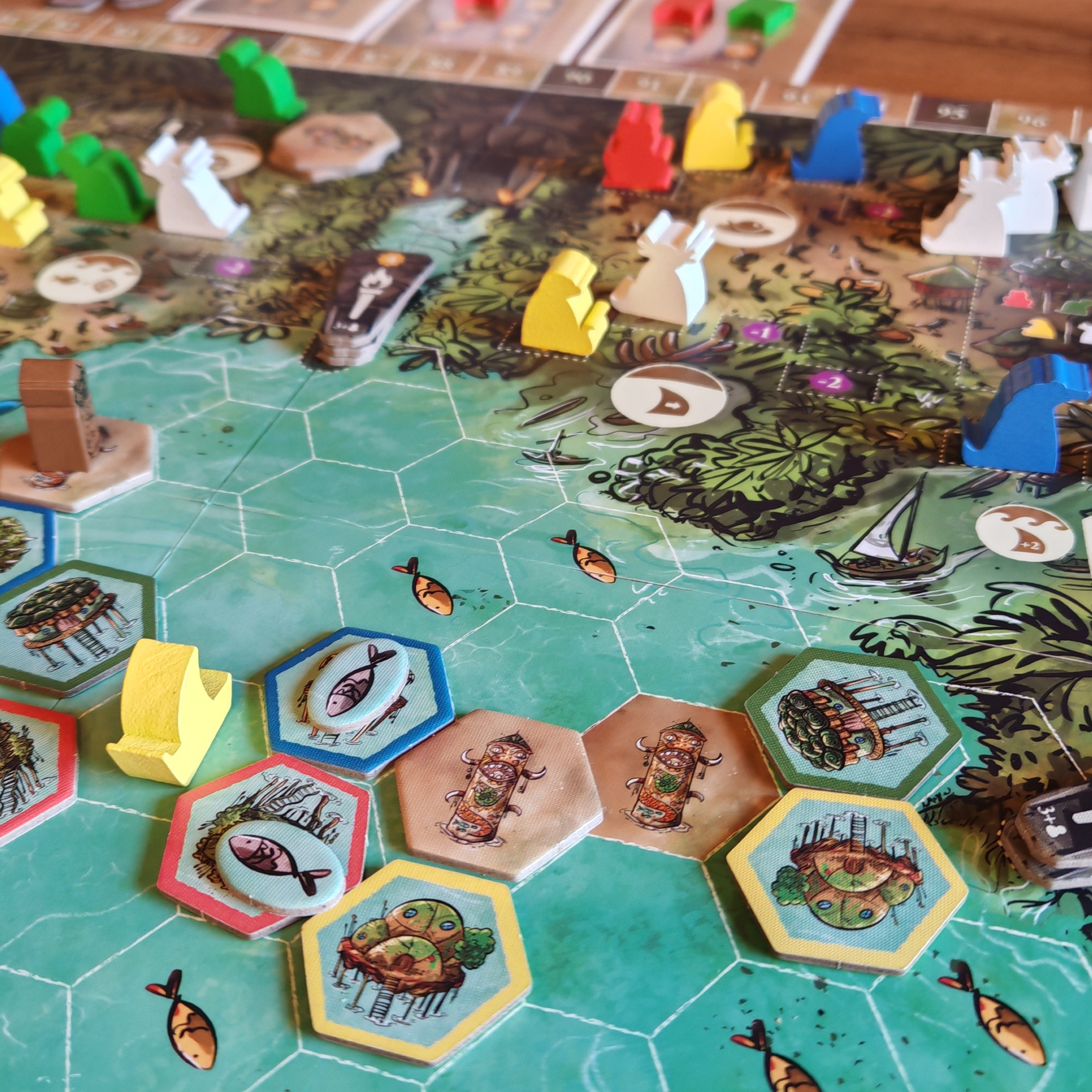 Чтобы вести своё племя к процветанию, придётся продумывать каждый ход. Сначала вы выбираете карту лидера на раунд — она определяет порядок хода, стоимость строительства, дальность плавания и особые способности. Затем строите поселения, ловите рыбу, разыскиваете древние храмы, торгуете и проводите празднества.