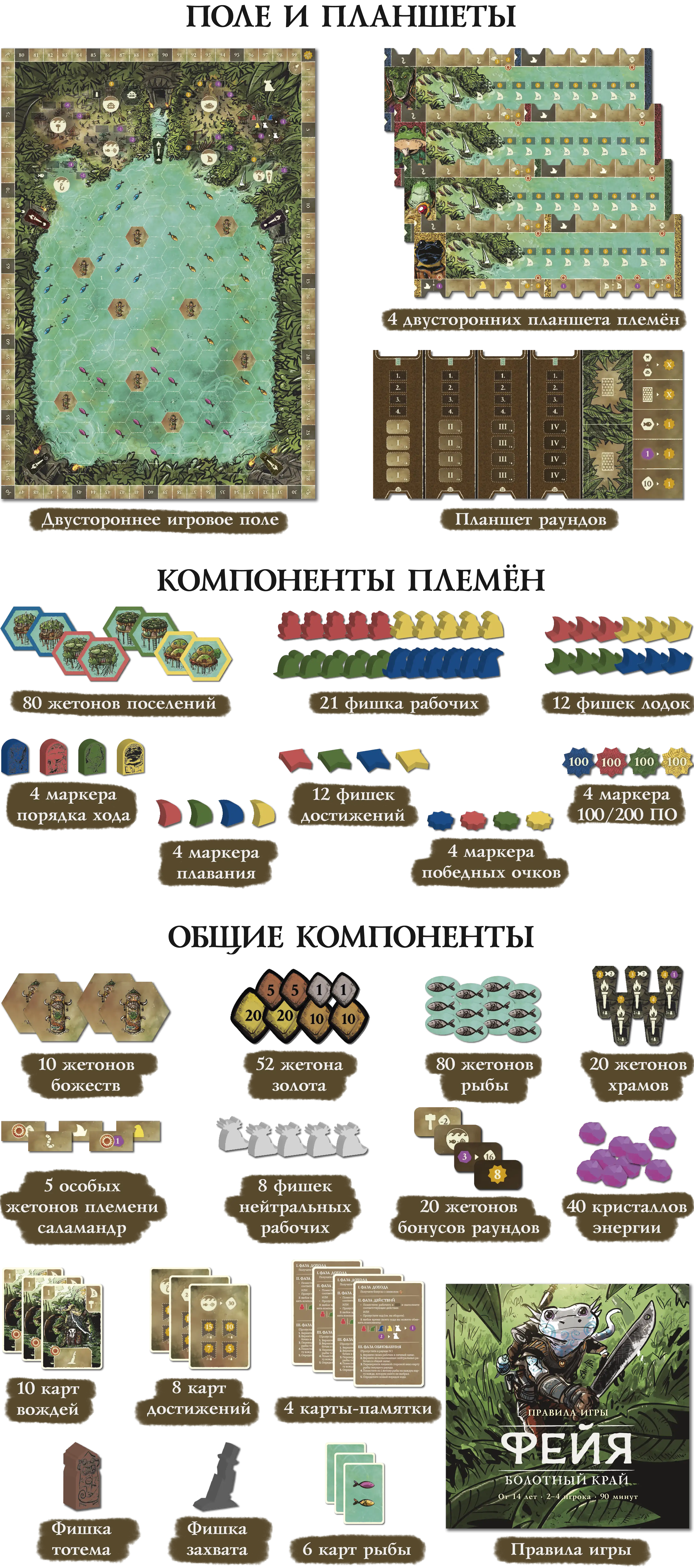 Размер и количество карт в игре «Фейя. Болотный край»: 63 × 88 — 18 шт., 44 × 67 — 12 шт., 120 × 80 — 4 шт.