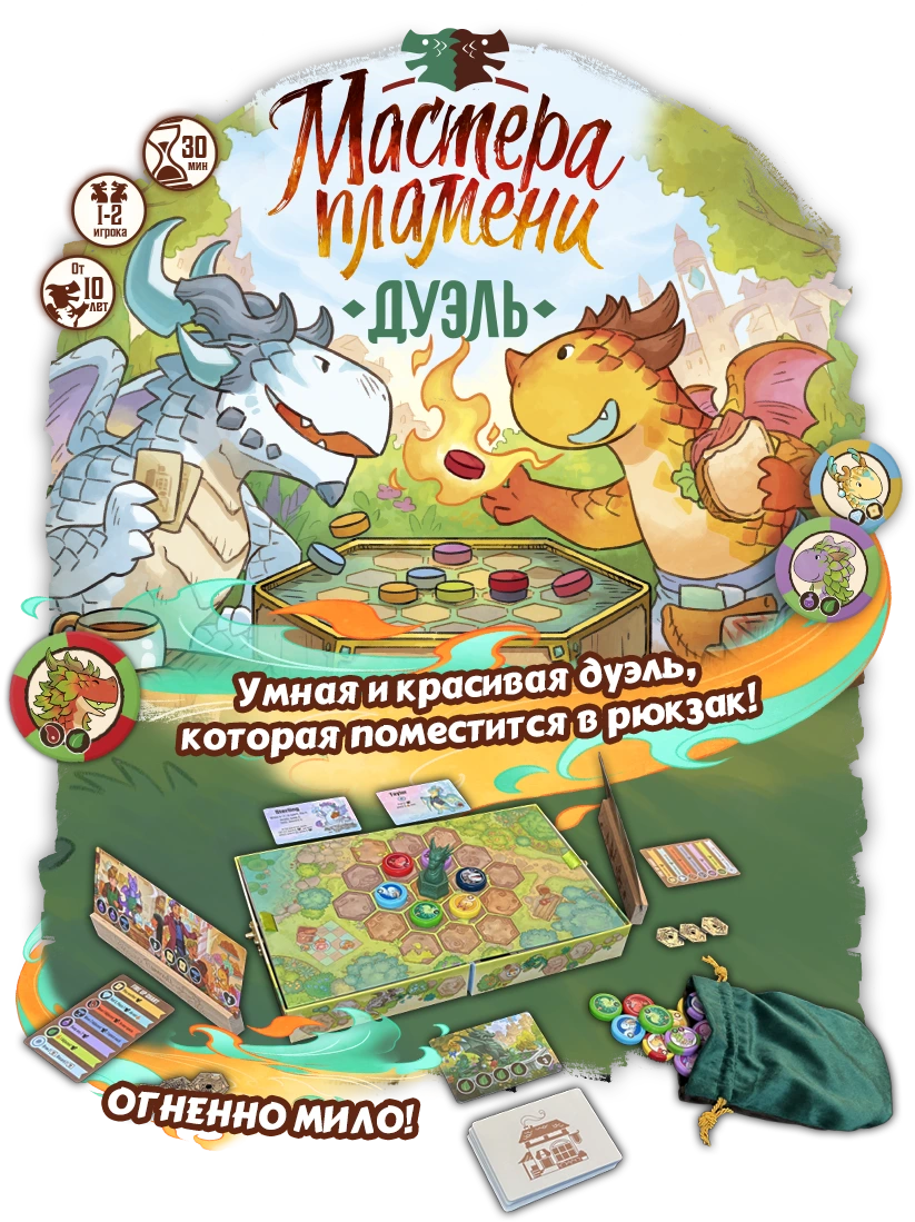 Друзья, мы открываем предзаказ на потрясающе затягивающую игру для двоих «Мастера пламени. Дуэль». Да, некоторые из вас уже знакомы с очаровательными дракончиками из этой вселенной! Для вас мы привезли дополнение к оригинальной игре — «Драконы и драконы» и набор промокарт. Если же вы слышите о «Мастерах пламени» впервые, рассказываем: