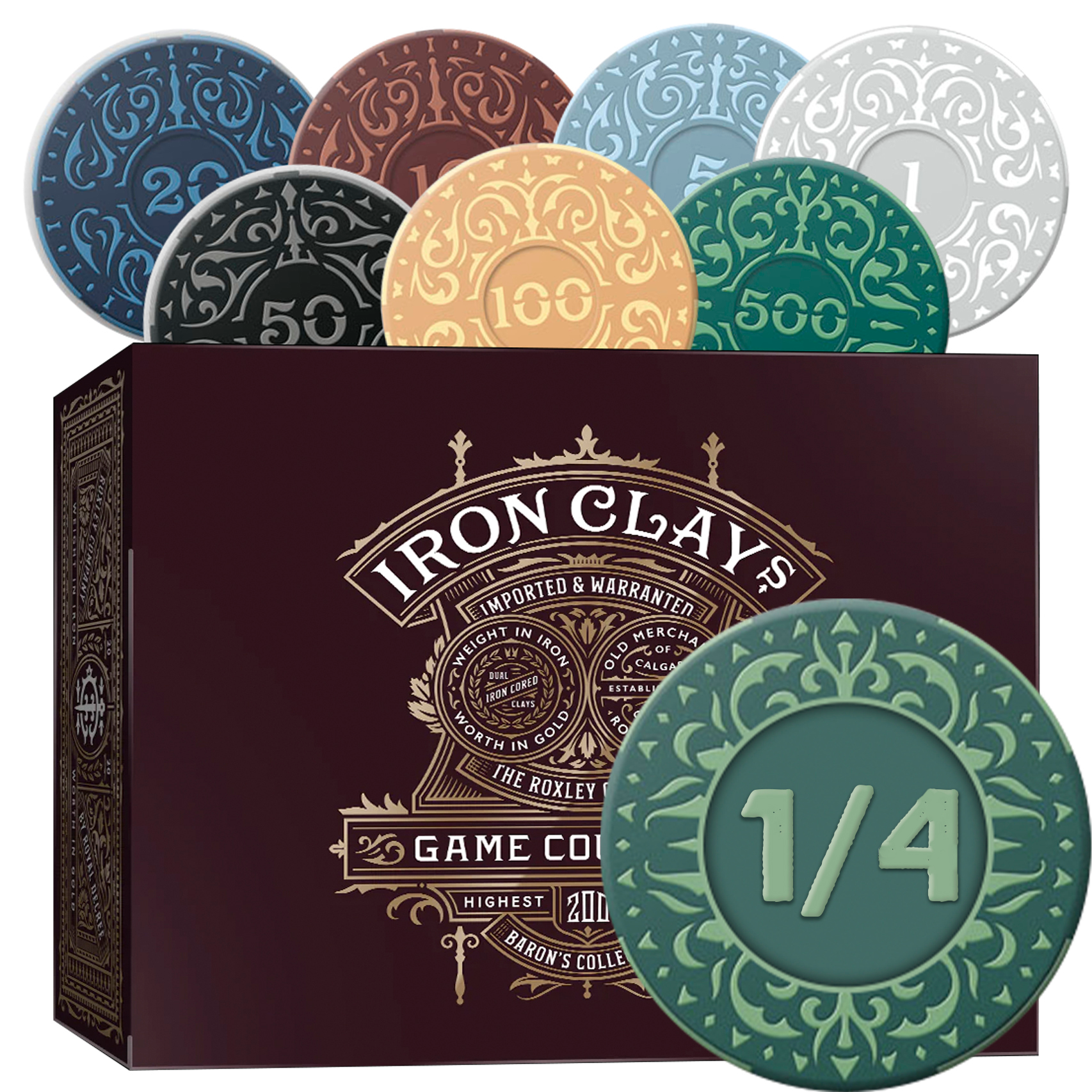 Набор оригинальных фишек Iron Clays от компании Roxley Games включает 200 фишек различных номиналов. Такой набор прекрасно подойдёт для любых экономических стратегий и игр еврошколы. Просто замените любые картонные монеты или купюры фишками Iron Clays — и ваши партии станут атмосфернее, а подсчёт денег или победных очков в игре удобнее.