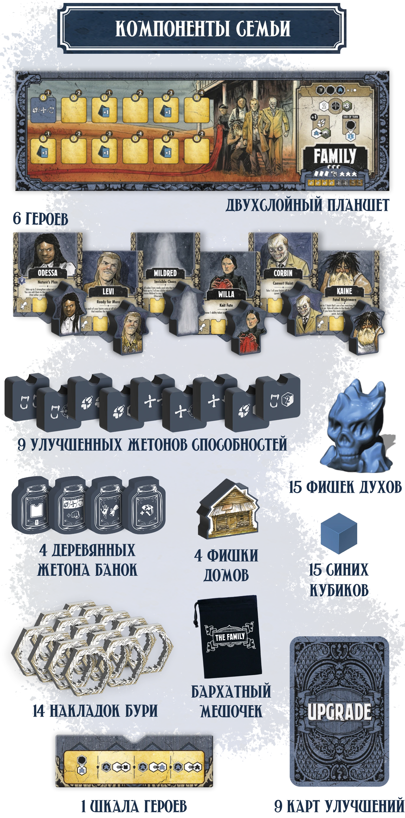 † Редкая атмосфера: сеттинг и визуальный стиль выдержаны в жанре южной готики — мрачной, фольклорной, самобытной. Такого на вашем игровом столе ещё не было!