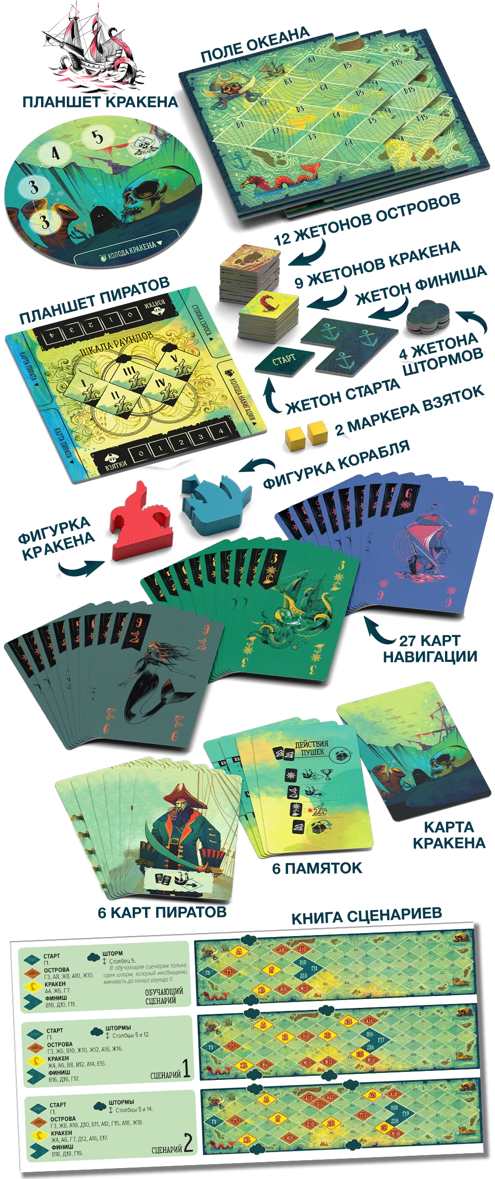 В «Парусе» вы прочувствуете на себе все невзгоды пиратской жизни и попытаетесь дать отпор кракену, чтобы выбраться из опасного путешествия живыми. Партия начинается с подготовки океана — вы выберете любой сценарий и разложите жетоны на игровом поле.