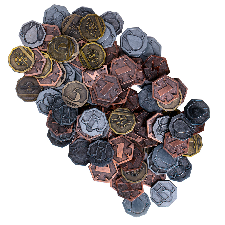 Стильные металлические монетки разной формы и цвета станут настоящим украшением игрового стола во время партии в игру «Плотина».