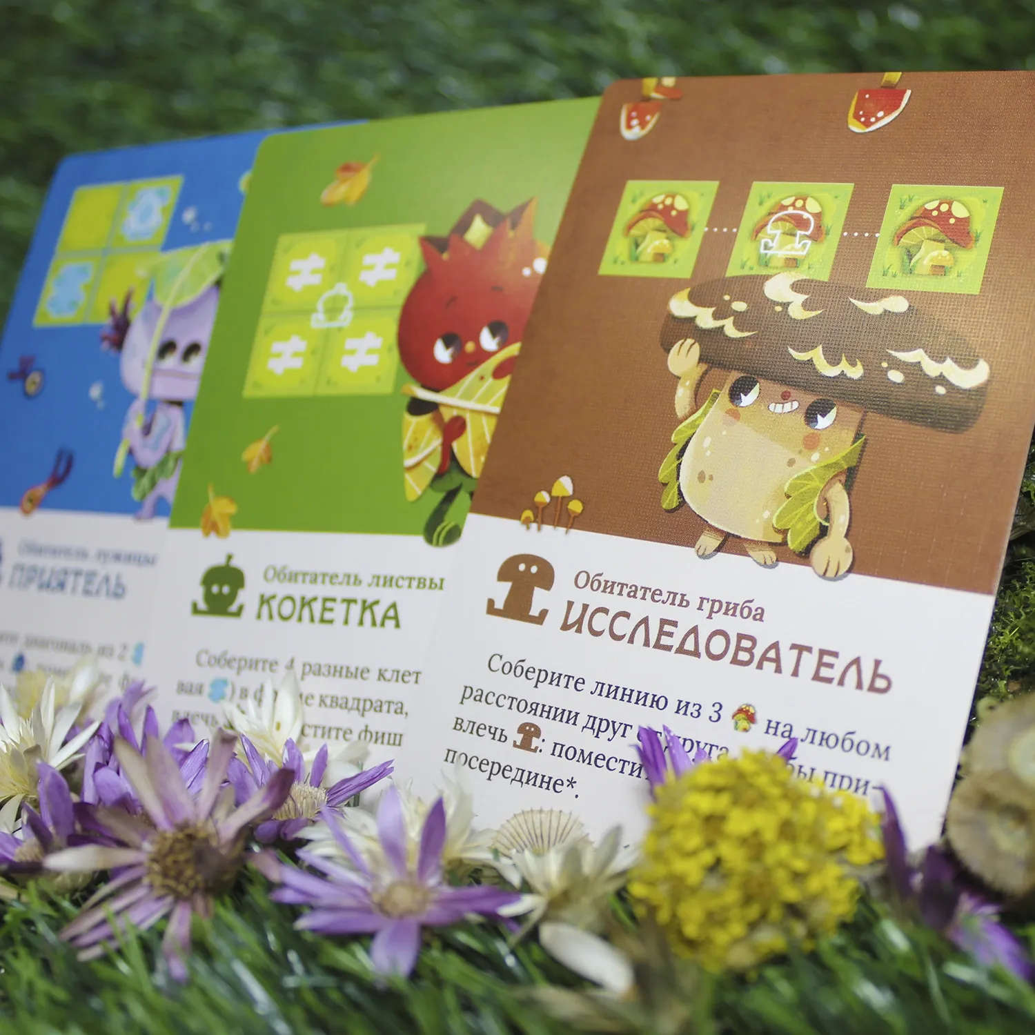 Остальные обитатели (насекомые под листьями, грибами, в каплях росы) — появляются по особым правилам, которые определяются случайной картой в начале партии (по одной на каждый тип).