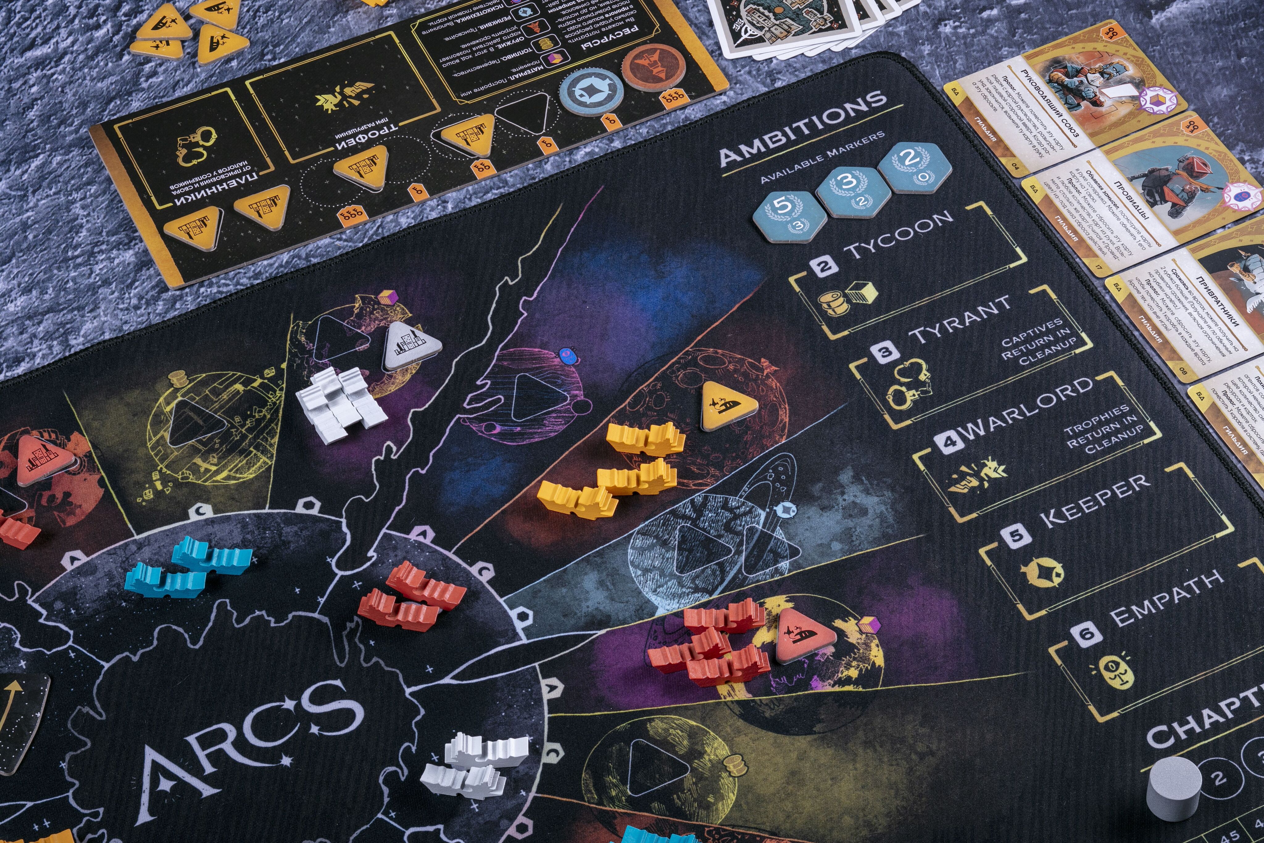Приятный на ощупь и удобный в использовании неопреновый плеймат, компоненты и карты приятно класть и удобно брать. Плеймат прошит по краям, у него нет стыков, как у разложенного поля. Размер совпадает с игровым полем.