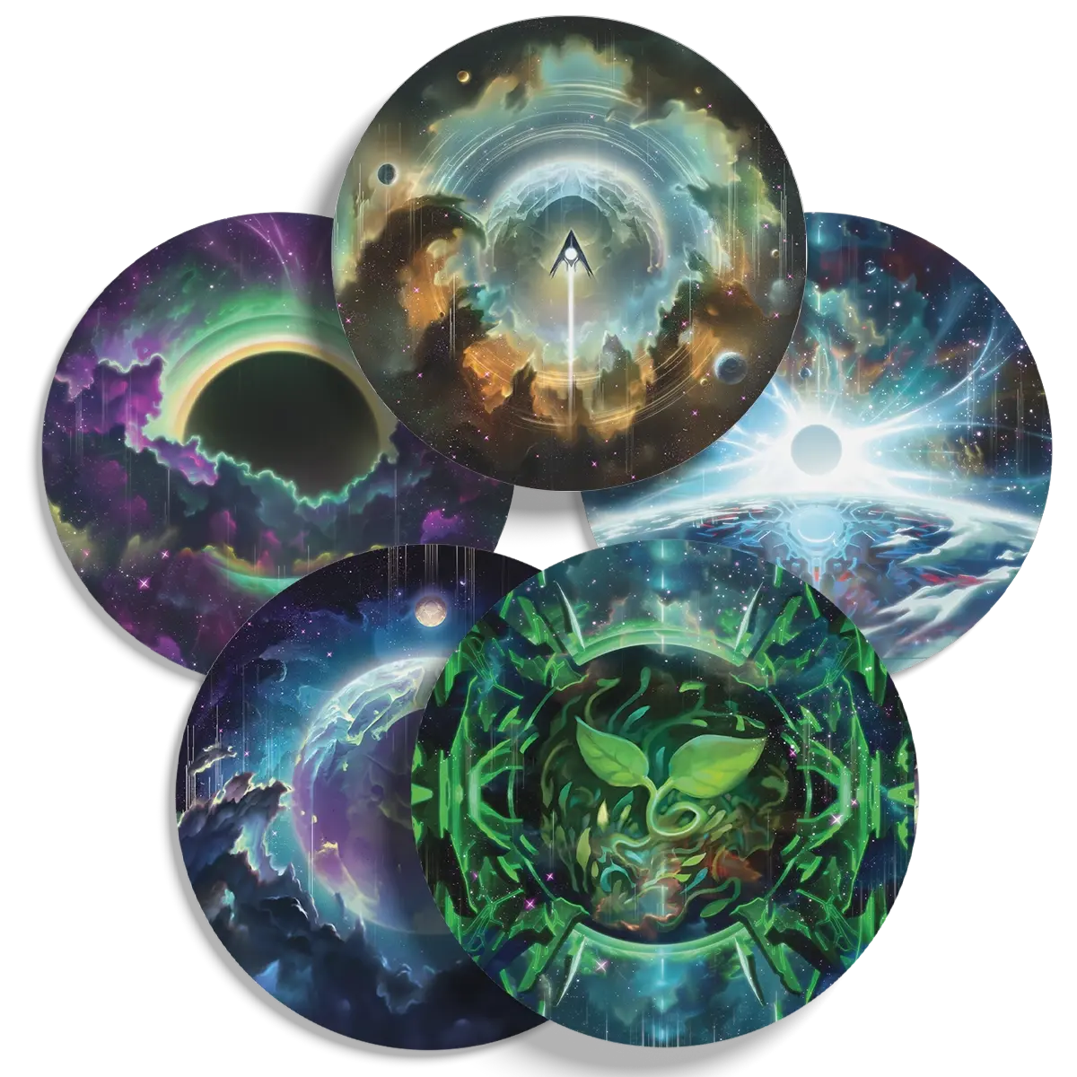 Пять подставок под напитки диаметром 100 мм каждая с иллюстрациями Серджио Чавеса из игры «Рубеж Андромеды». Подставки будут изготовлены из мелованного картона толщиной 1,5 мм. С обратной стороны на подставках изображен логотип издательства Cardboard Alchemy.