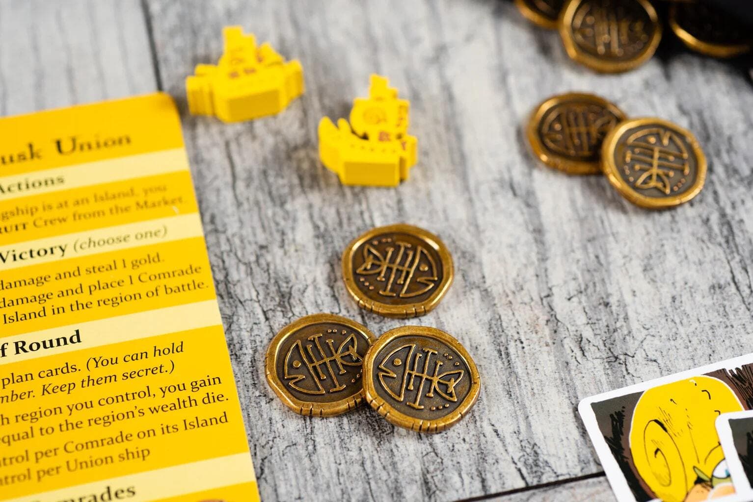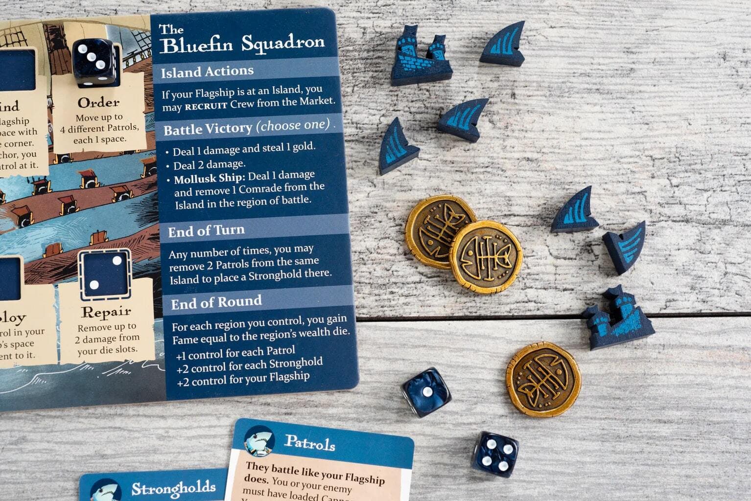 - 9 Printed Wooden Figures for the base game. All the ships for the four factions, plus Patrols and Strongholds for the Bluefin Squadron!