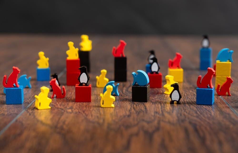 • 25 custom markers (5x blue fish, 5x red foxes, 5x yellow primates, 5x black penguins);