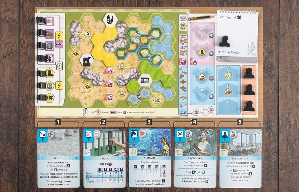 В настольной игре Ark Nova («Арк Нова») не так много доступных действий, но используются они интересным образом – эффективность того или иного действия зависит от того, где располагается его карта, и карты перемещаются между слотами при использовании. Так вы можете и планировать свои действия, и знаете, что одно и то же действие с мощным эффектом несколько раз подряд выполнить нельзя – нужно подождать, пока карта этого действия снова доберётся до нужной позиции.