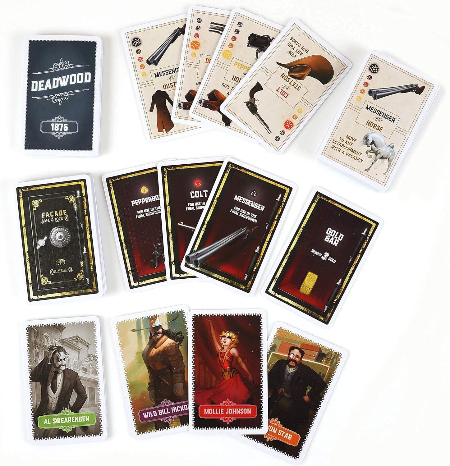 В Deadwood 1876 вы разыгрываете карты из своей руки, чтобы попытаться отнять сейфы у других игроков. В сейфах бывают значки, золото или оружие для ограблений. Ближе к концу игры игроки со значками получают дополнительные ходы. После последнего хода команда с наибольшим количеством золота перейдет к финальному ограблению. Там товарищам по команде придется сражаться друг с другом насмерть, используя оружие. Последний выживший - победитель!