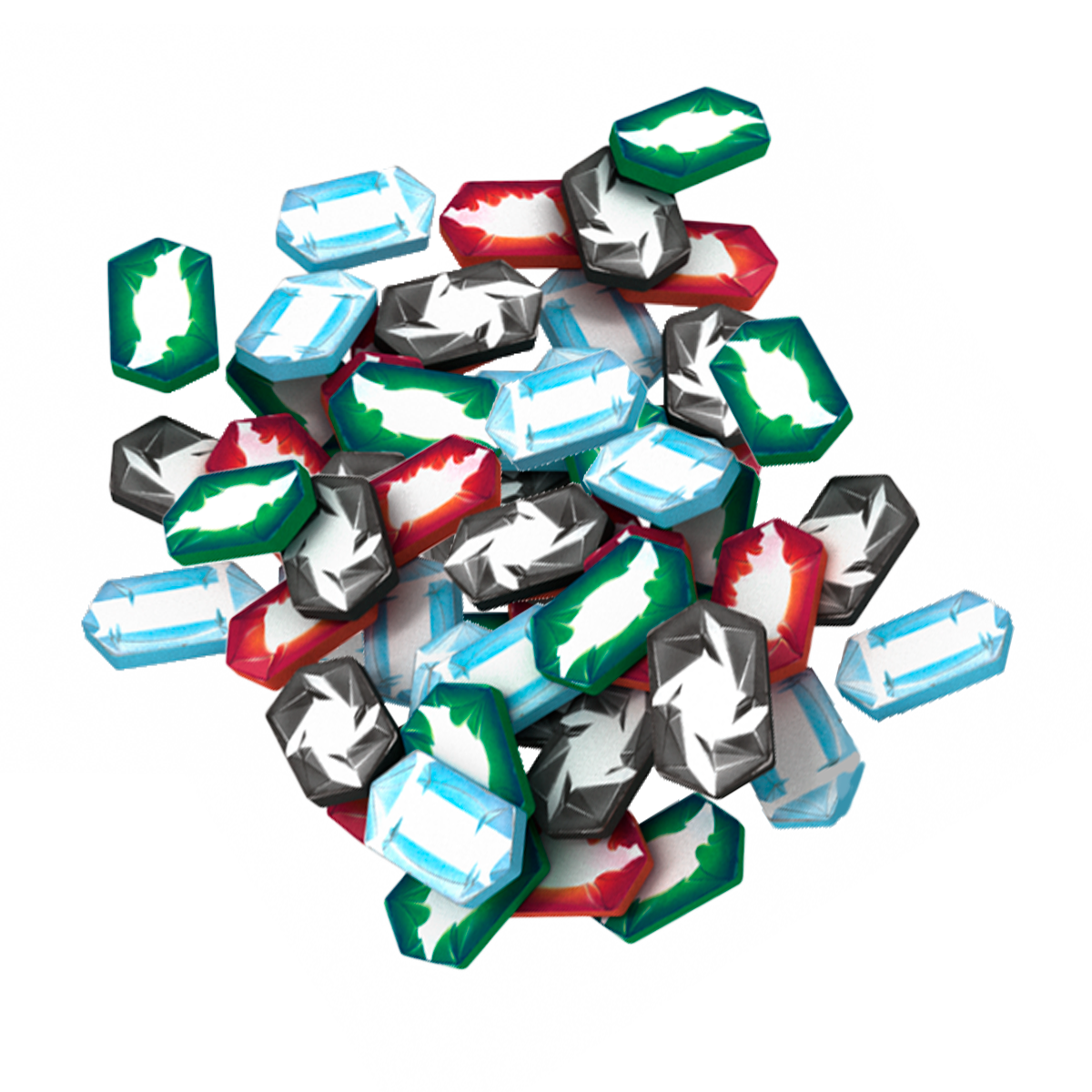 Набор компонентов из натурального дерева заменяет картонные жетоны эфир-камней из базовой игры. Всё аккуратно обработано и стилистически вписывается в оформление.
