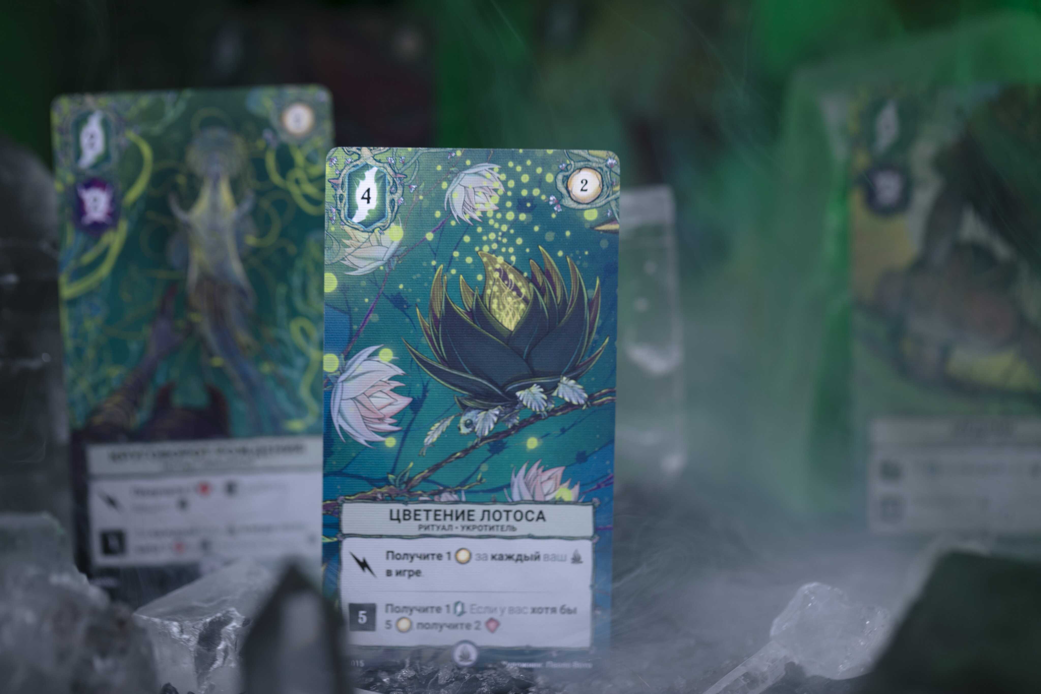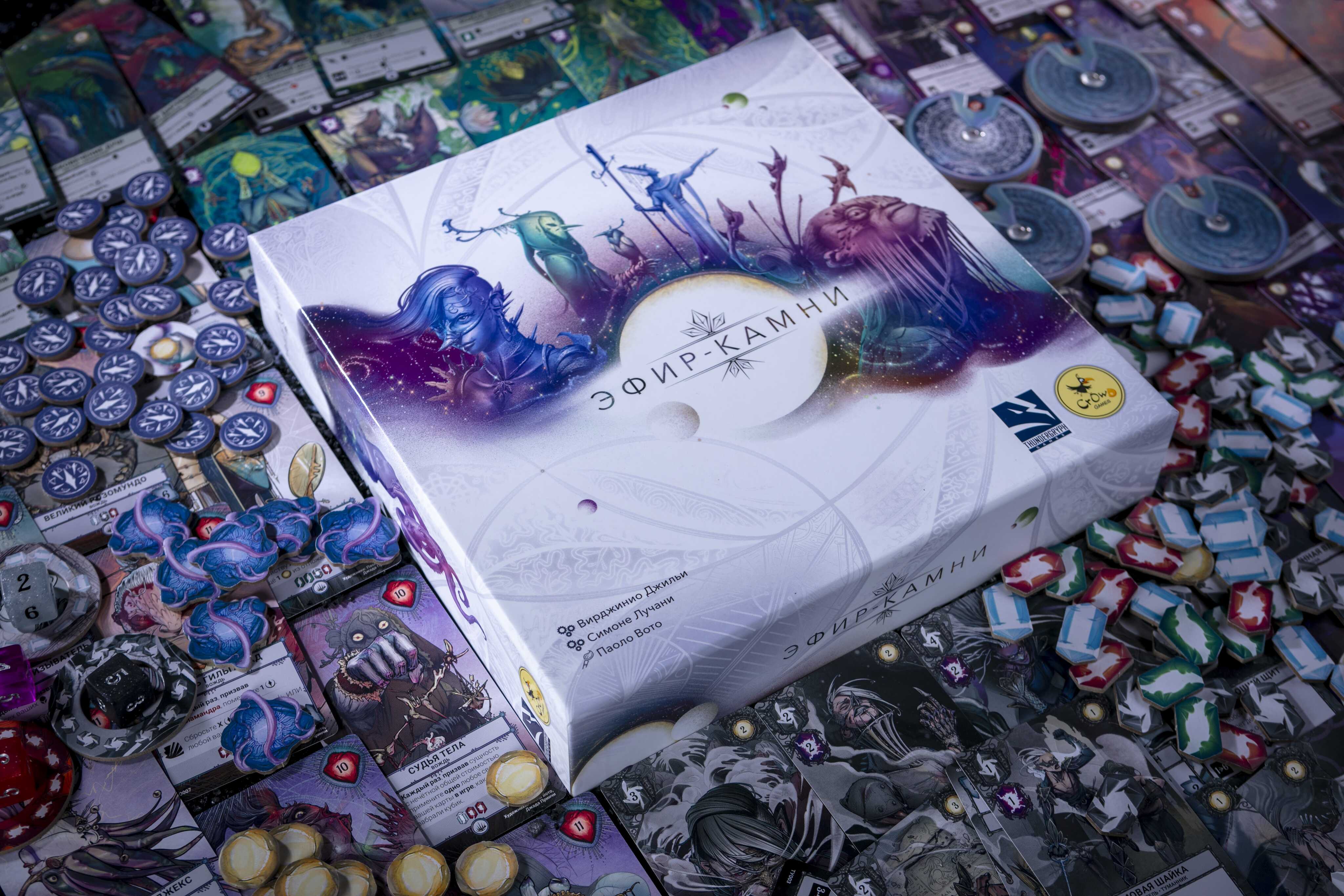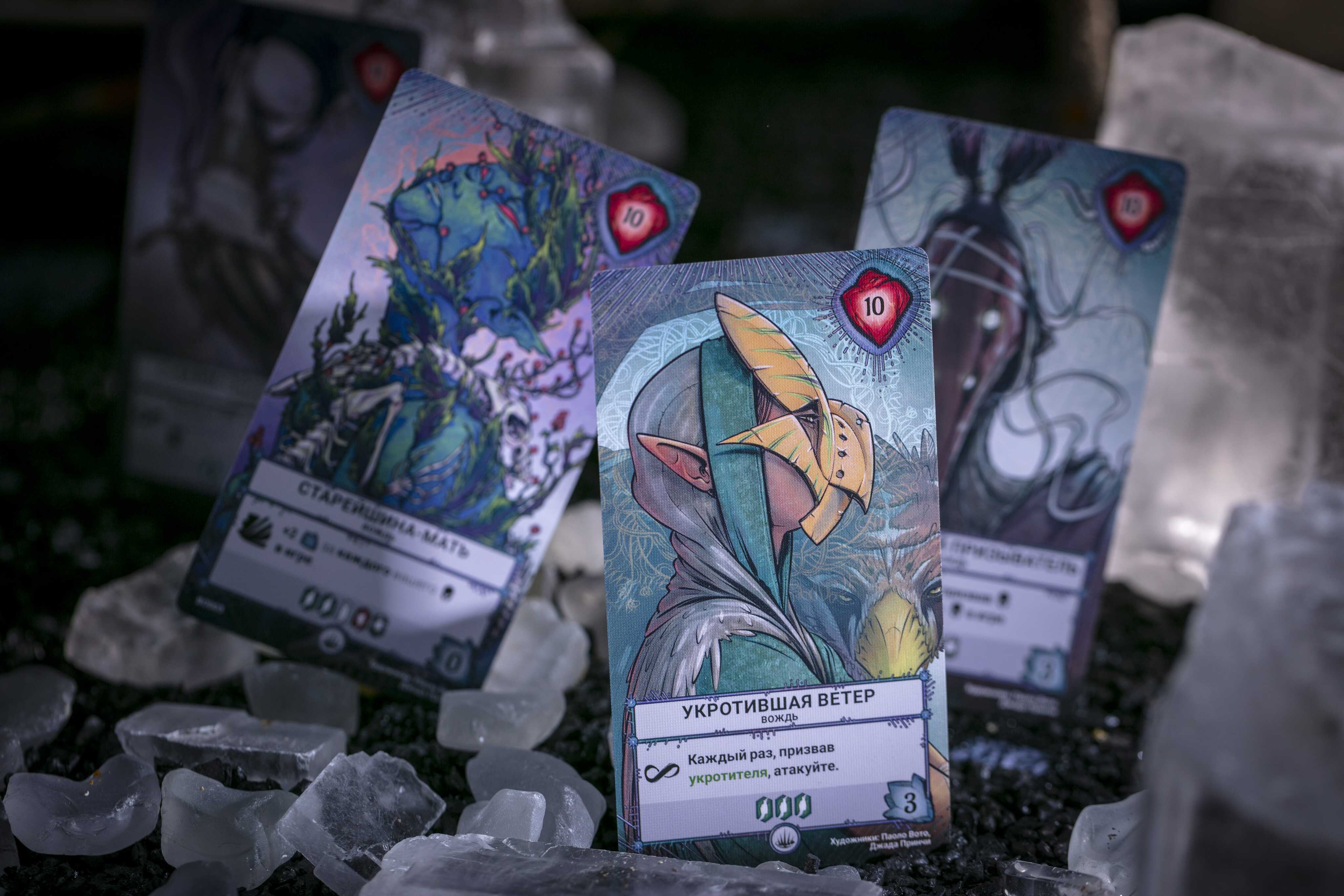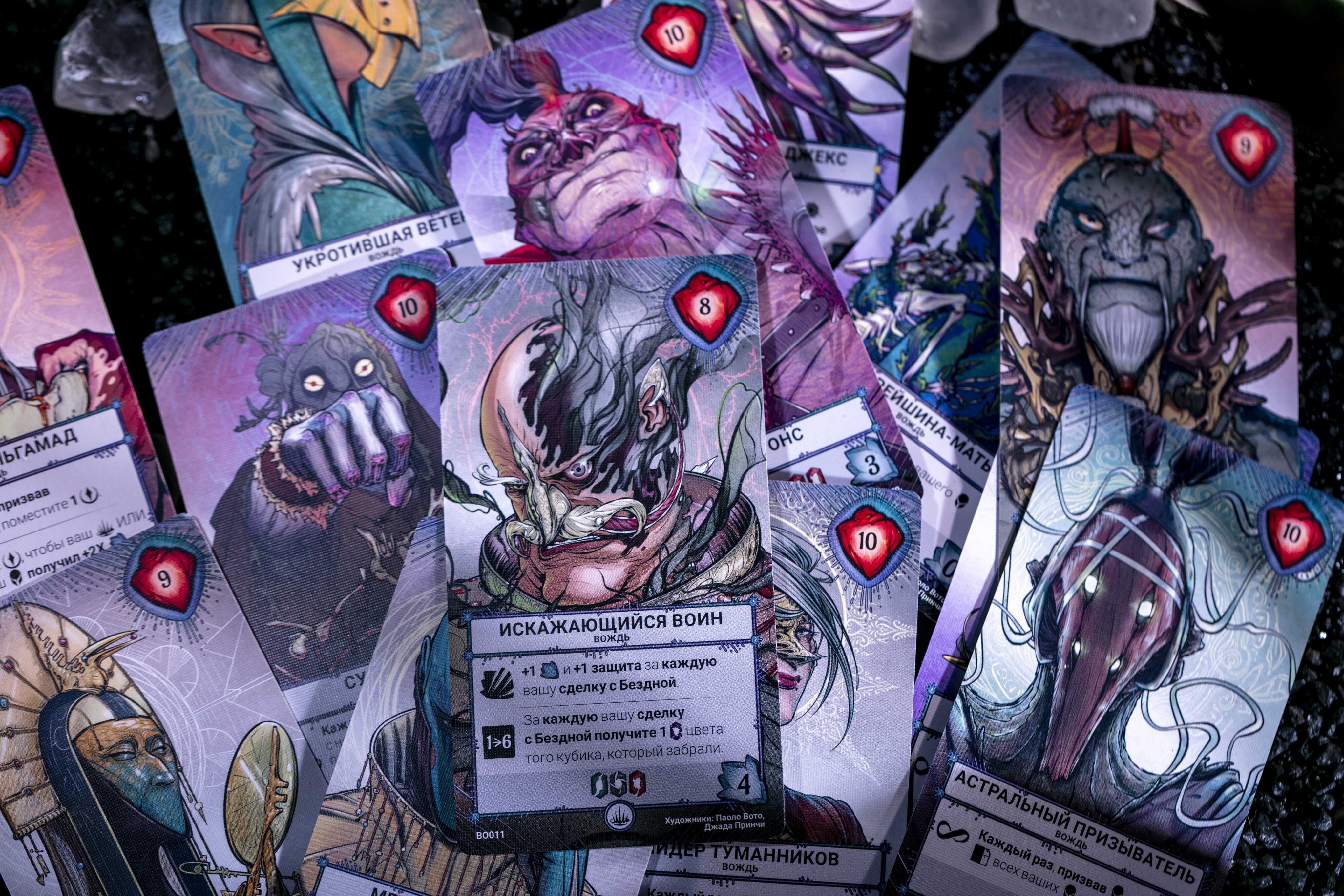 В начале — драфт сущностей и выбор вождя с уникальной способностью: именно они определяют вашу стратегию на всю игру. Для первой партии можно использовать готовые наборы. Затем вы будете по очереди забирать кубики с рынка, получая эфир-камни, разыгрывать карты с эффектами и атаковать угрозы, чтобы получить награды, очки и усиливать свою колоду.