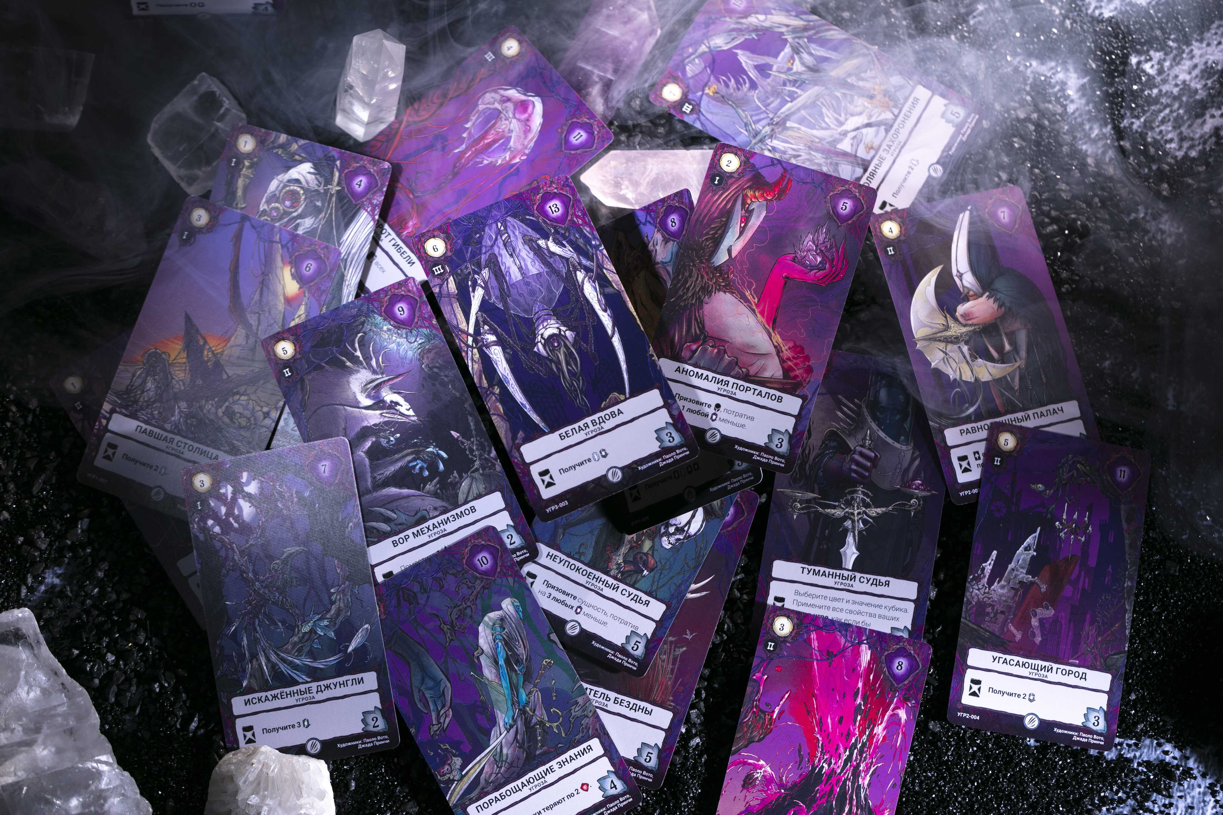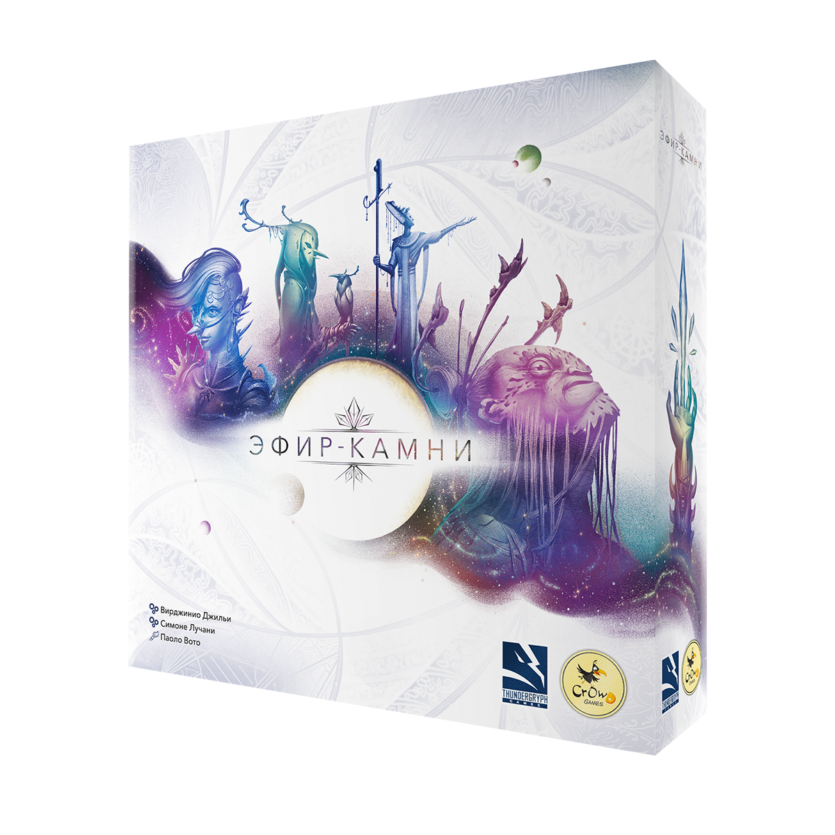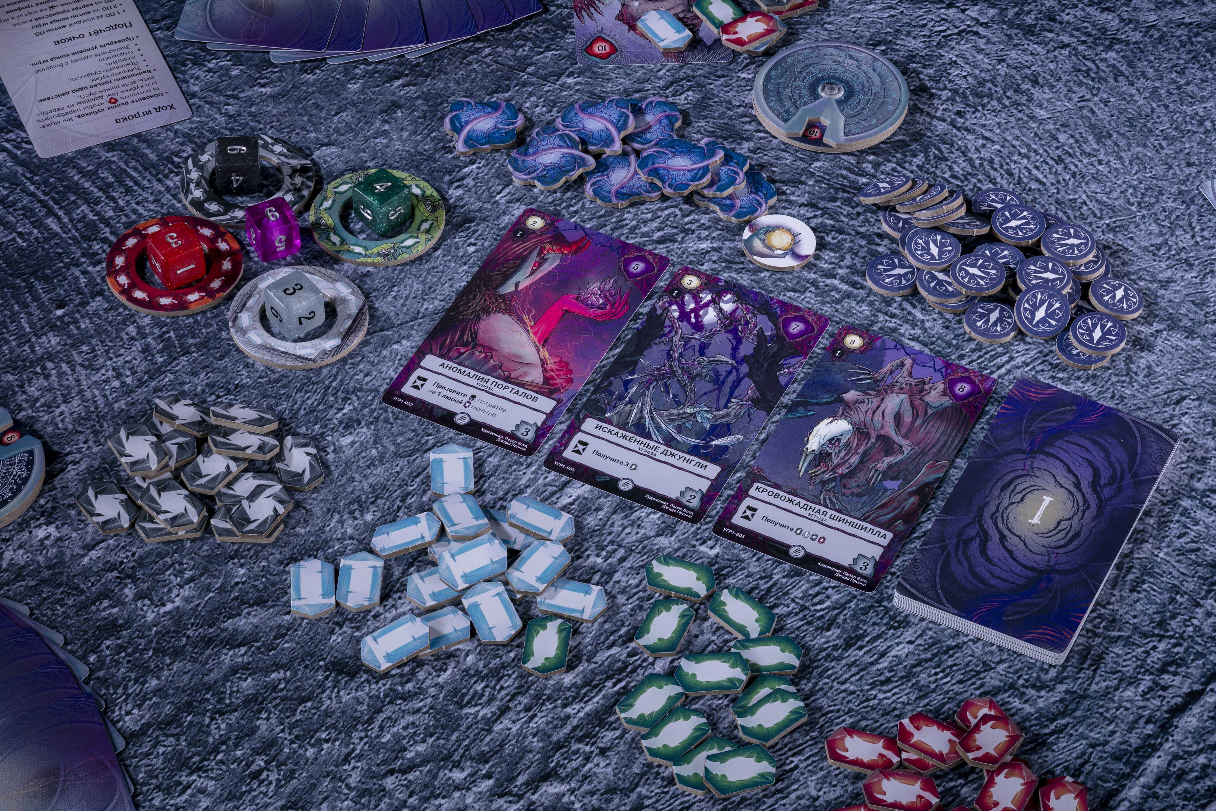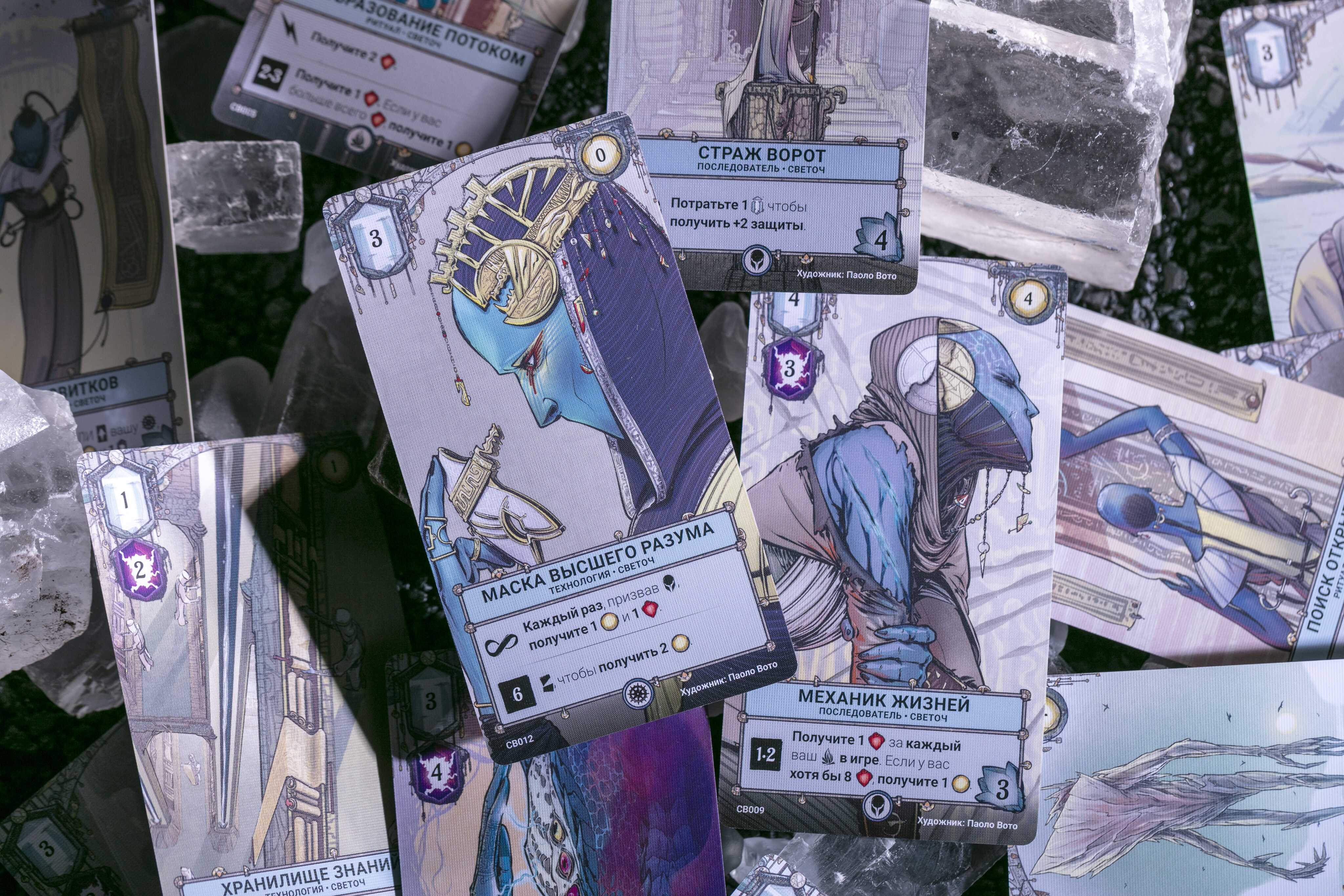 В начале — драфт сущностей и выбор вождя с уникальной способностью: именно они определяют вашу стратегию на всю игру. Для первой партии можно использовать готовые наборы. Затем вы будете по очереди забирать кубики с рынка, получая эфир-камни, разыгрывать карты с эффектами и атаковать угрозы, чтобы получить награды, очки и усиливать свою колоду.
