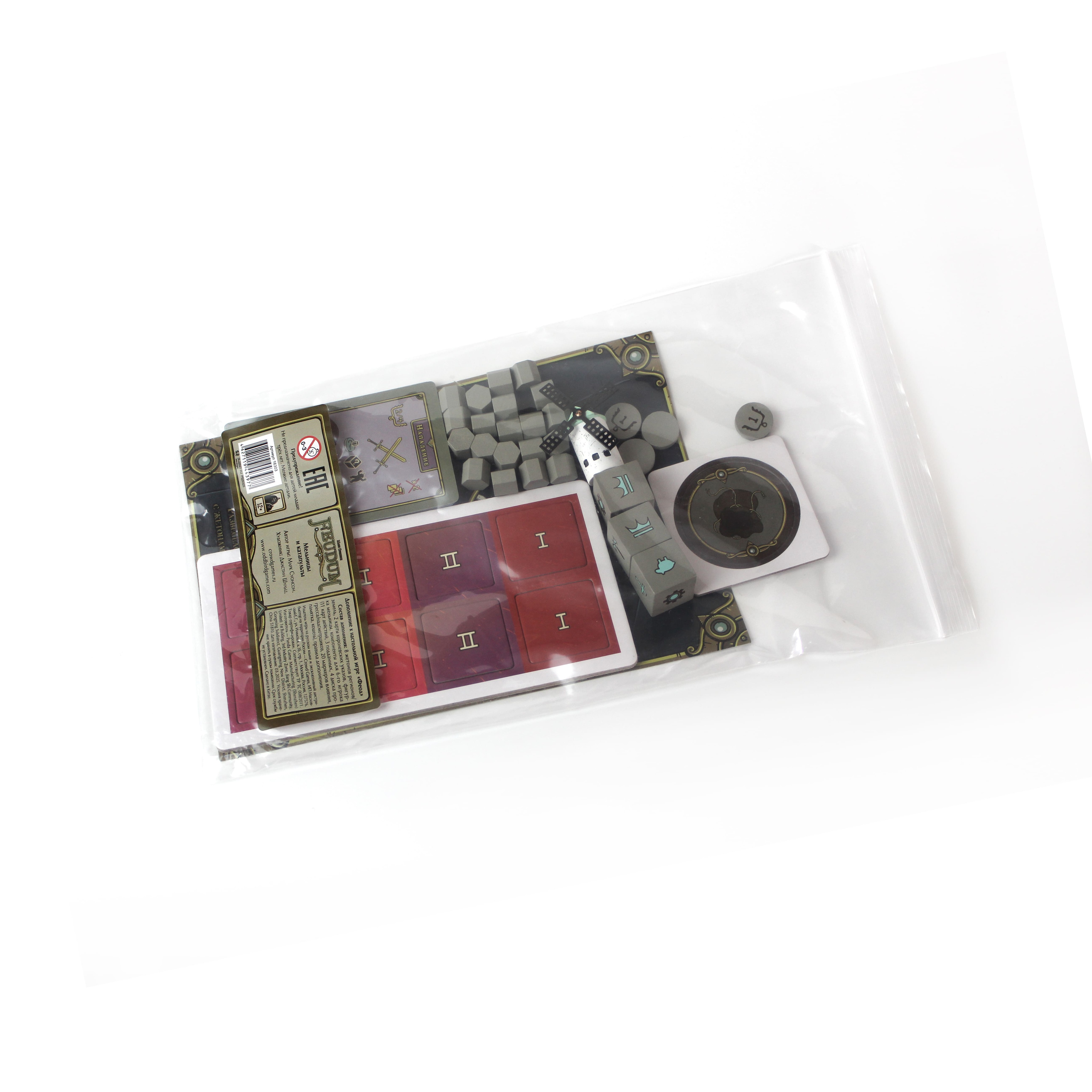 Дополнение «Феод. Мельницы и катапульты» содержит всё необходимое для игры в «Феод» вшестером, что мы рекомендуем делать лишь опытным феодалам. Также в состав дополнения входит фигурка мельницы и жетоны регионов с изображением мельницы и катапульты. Гостеприимные лопасти мельницы привлекают в вашу вотчину озорной ветерок, прихватывающий с собой 3 разных ресурса по вашему выбору из любого региона на поле. Жетон катапульты позволяет соорудить настоящую осадную машину, стреляющую по феодам, подданным и монстрам… кусками селитры. Катапульта добавляет вам +1 к атаке, проводимой в пределах 2 клеток от своего жетона. Наконец, в этом дополнении вы найдёте 2 новые карты королевских указов: мандат даёт королевскую неприкосновенность при наличии мельницы или катапульты, а хартия приносит очки в конце игры за мельницы/катапульты.
