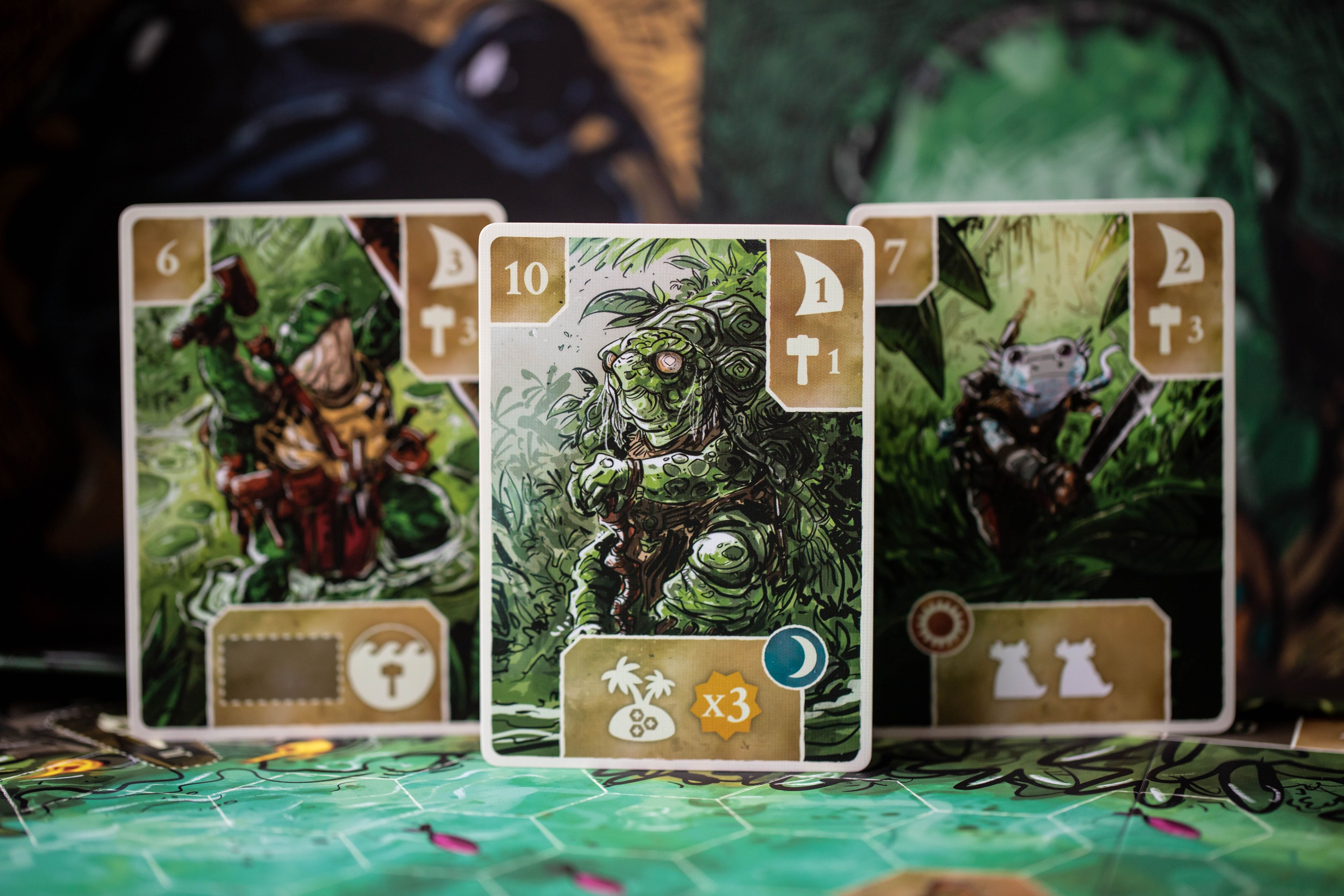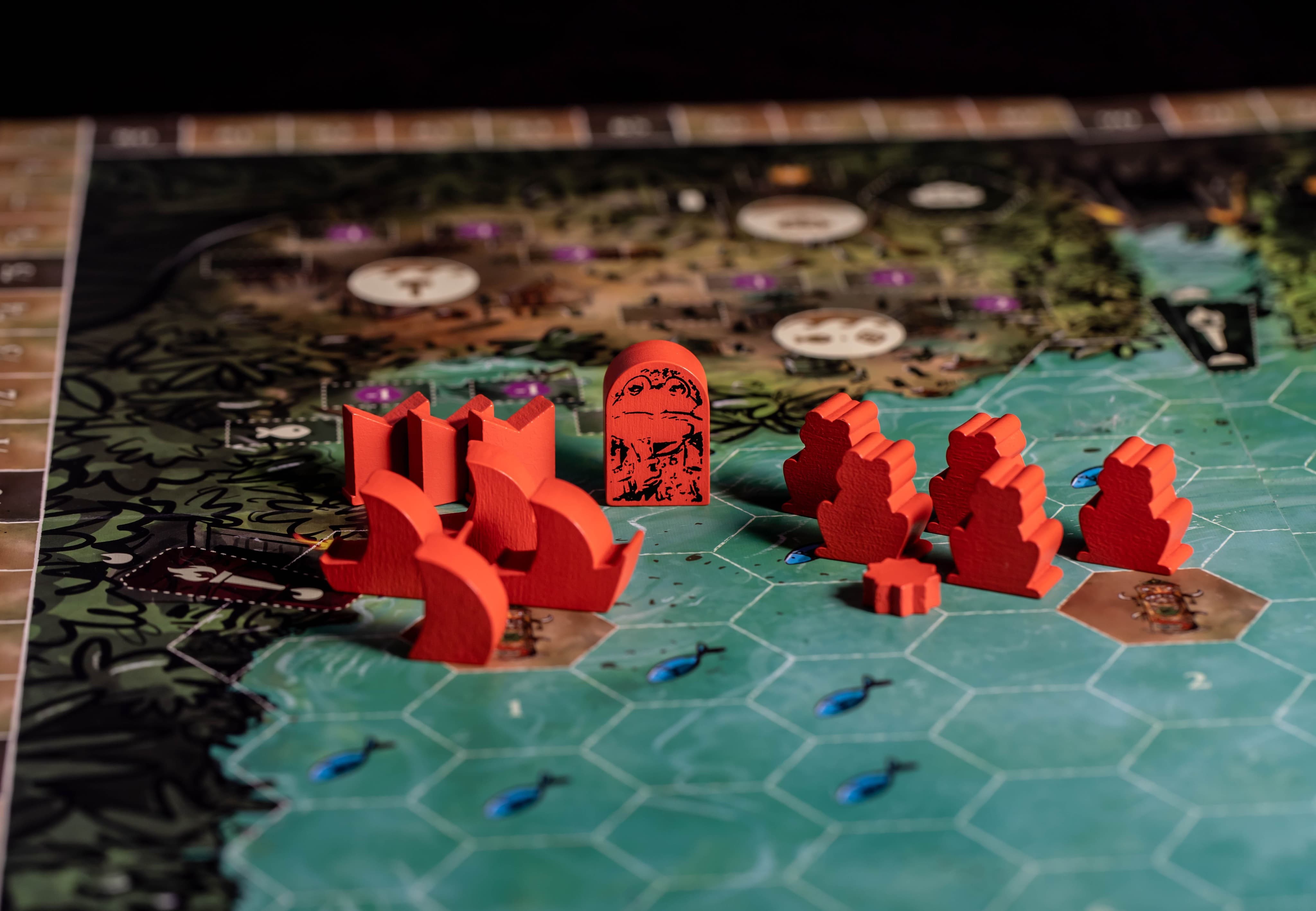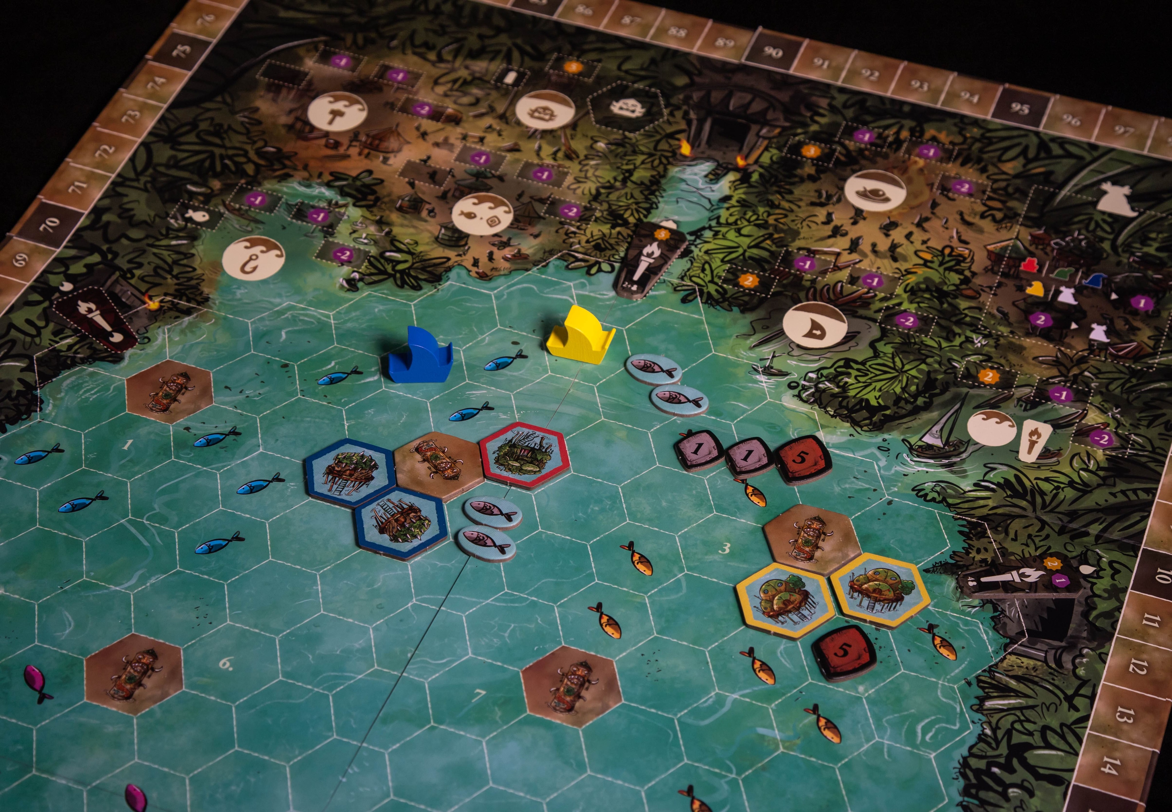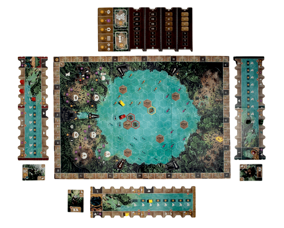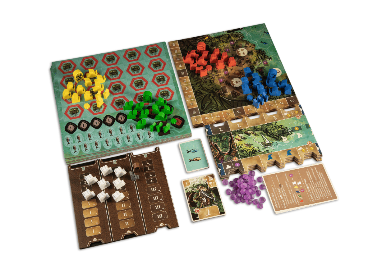 Чтобы вести своё племя к процветанию, придётся продумывать каждый ход. Сначала вы выбираете карту лидера на раунд — она определяет порядок хода, стоимость строительства, дальность плавания и особые способности. Затем строите поселения, ловите рыбу, разыскиваете древние храмы, торгуете и проводите празднества.