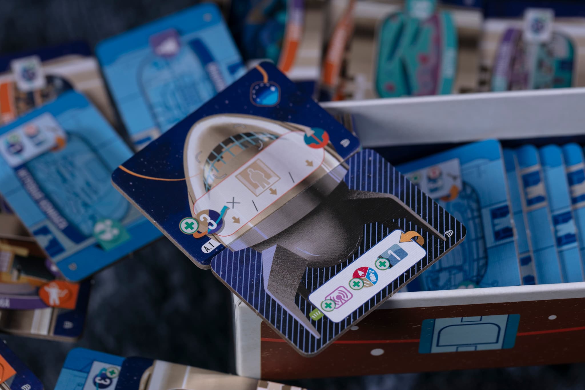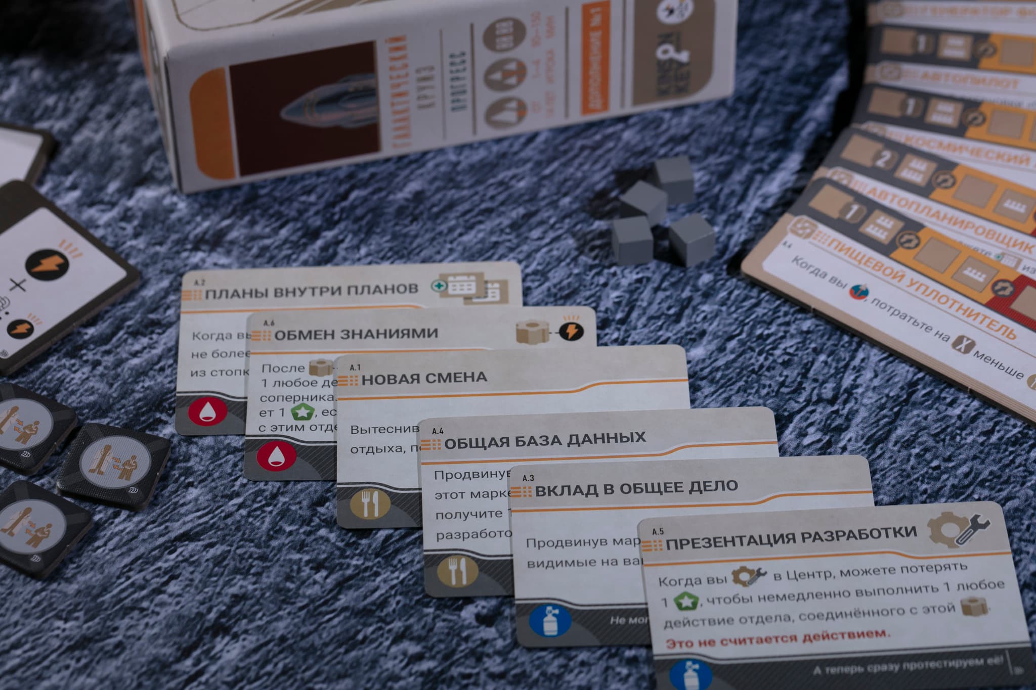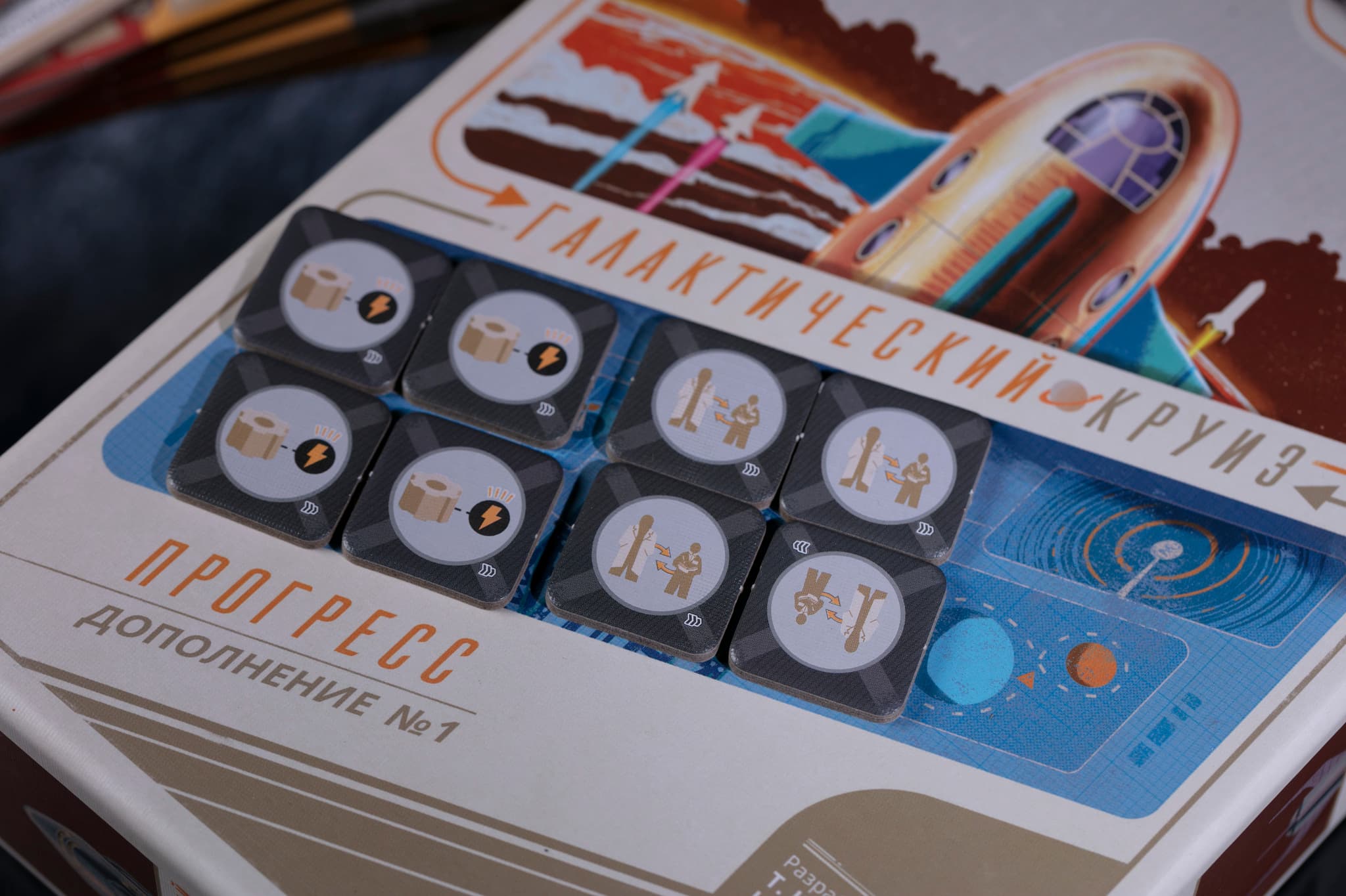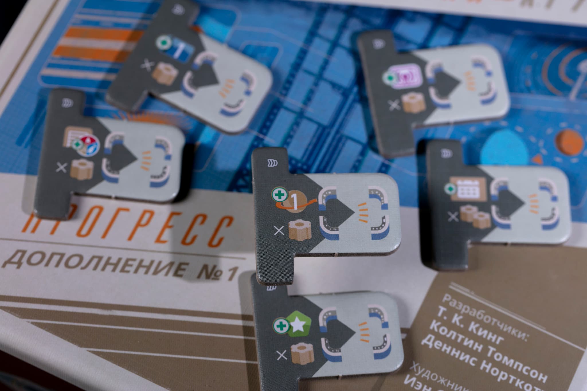 Кроме того, в дополнении есть новые карты планов, новые жетоны улучшений, рубки и двигателя, а также специалистов. Карты планов можно замешать в колоду базовой игры, жетоны рубки и двигателя — в соответствующие стопки, а жетоны улучшений позволяют заменить серые жетоны на пусковой башне.
