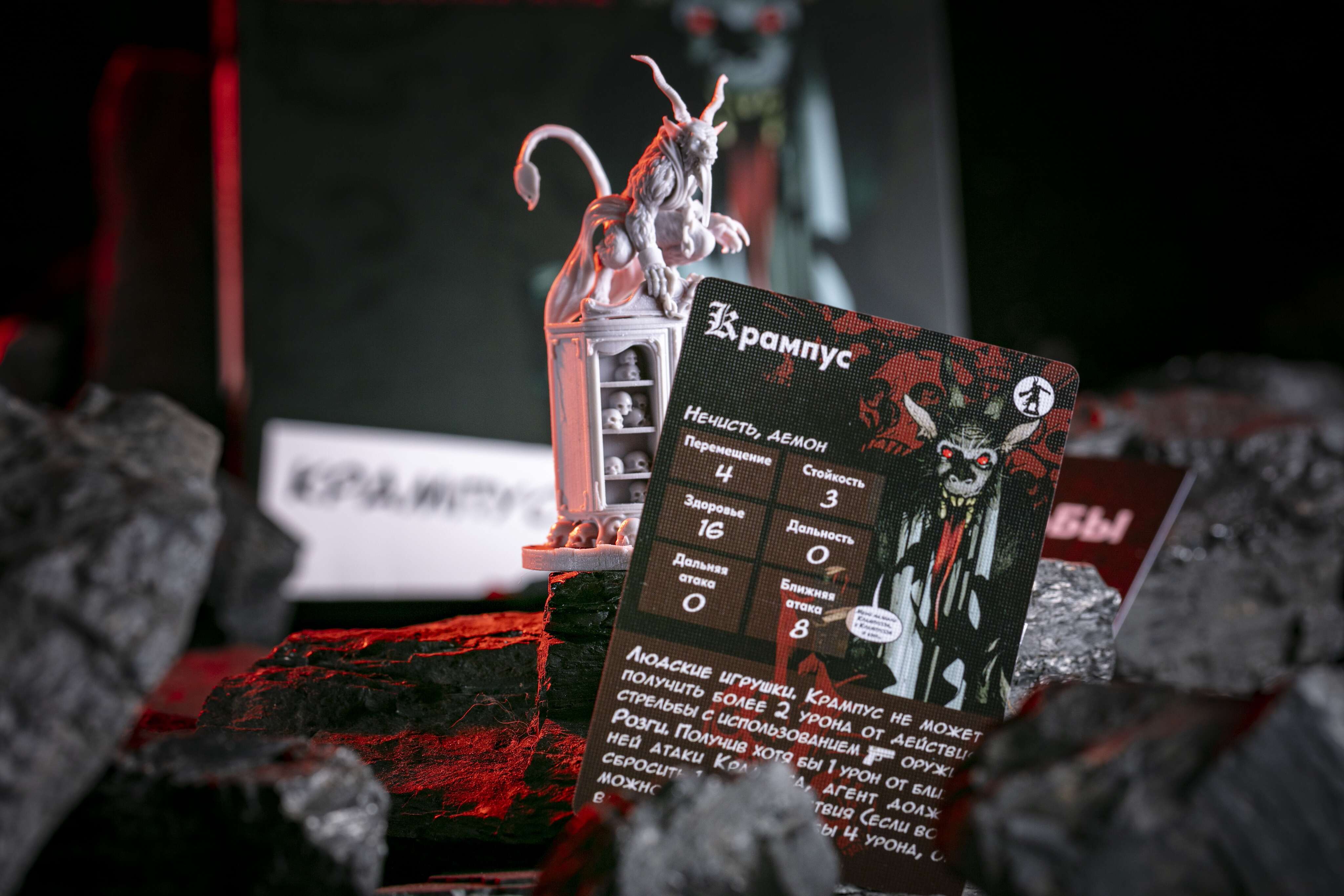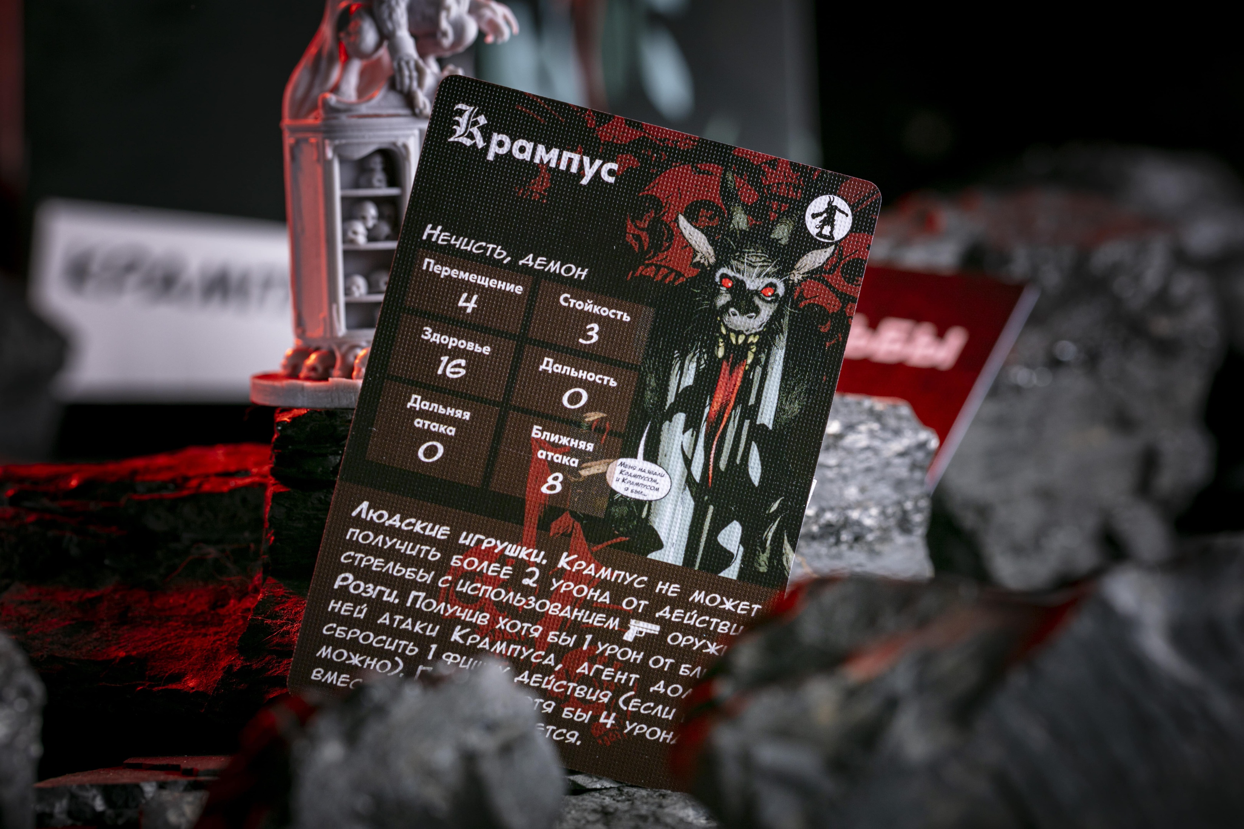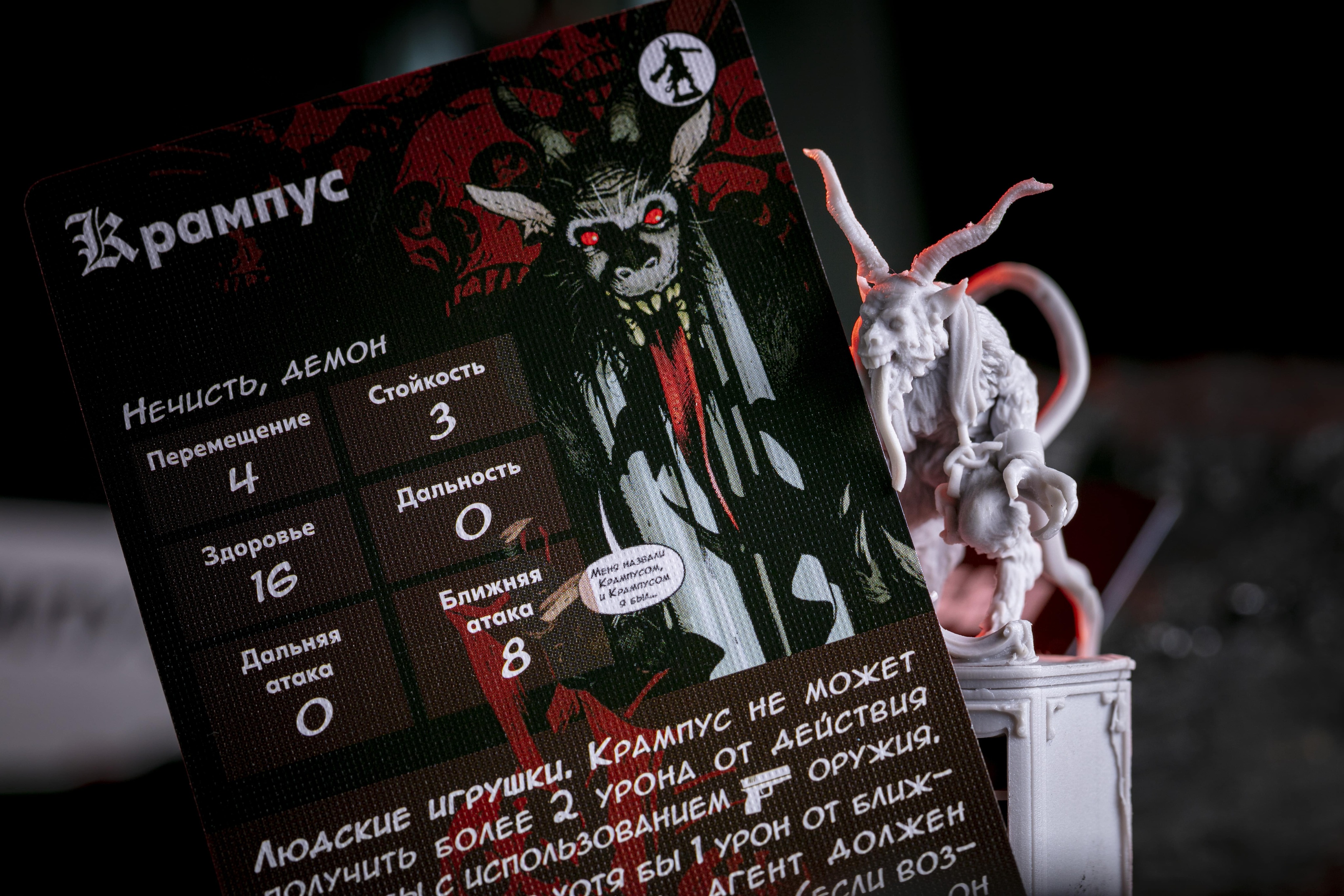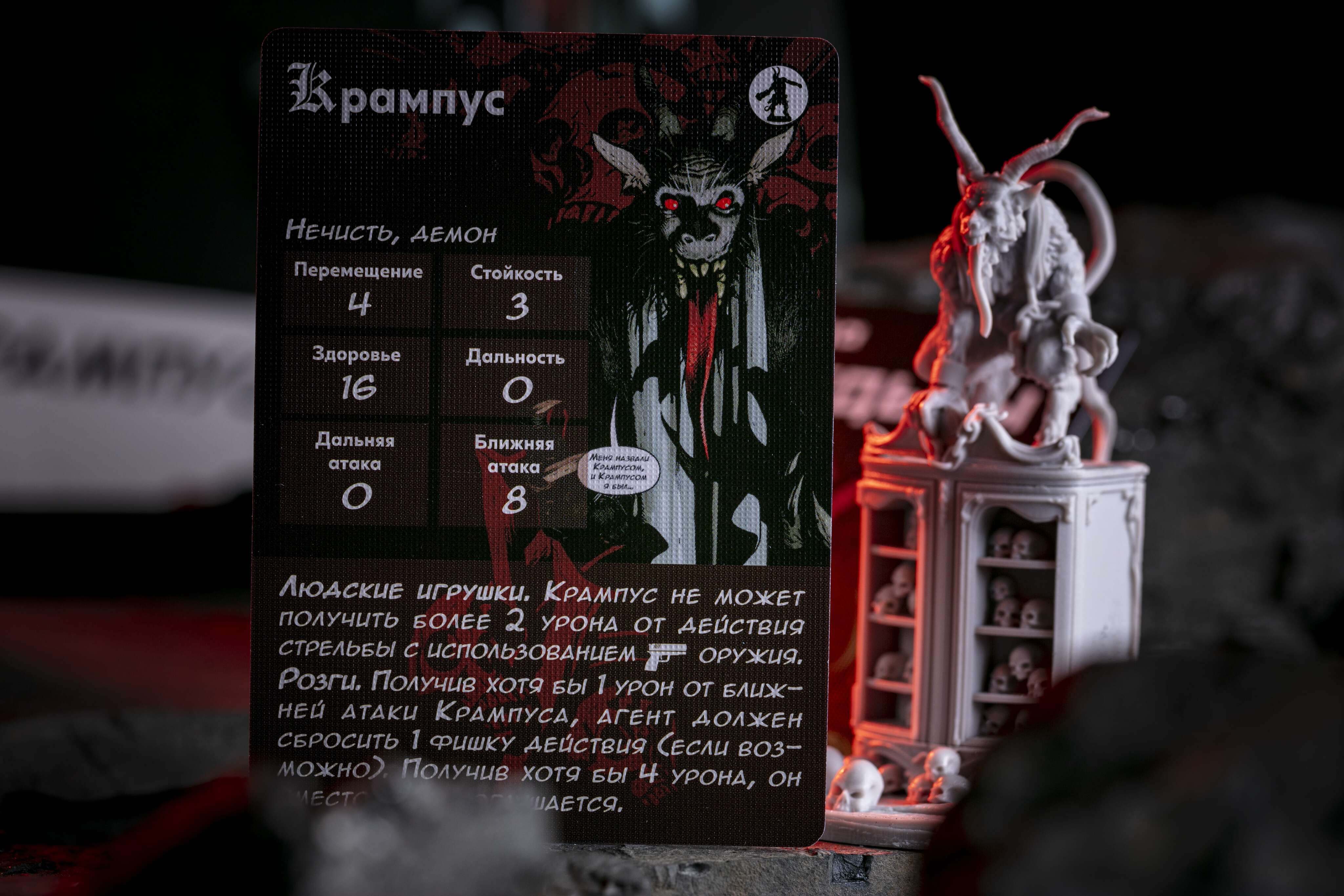 Вильгельм Шульце с пренебрежением относится к человеческому оружию, называя его «людскими игрушками», поэтому 2 урона здоровью — это максимум, который сможете нанести ему с помощью огнестрельного оружия. Крампус с удовольствием использует «Розги»: получая хотя бы один урон от его ближней атаки, вы должны сбросить одну фишку действия. Получив сразу четыре урона, вы немедленно оглушены. Крампус — коварный и хитрый противник с очень высокой скоростью перемещения, которого лучше не выводить из себя.