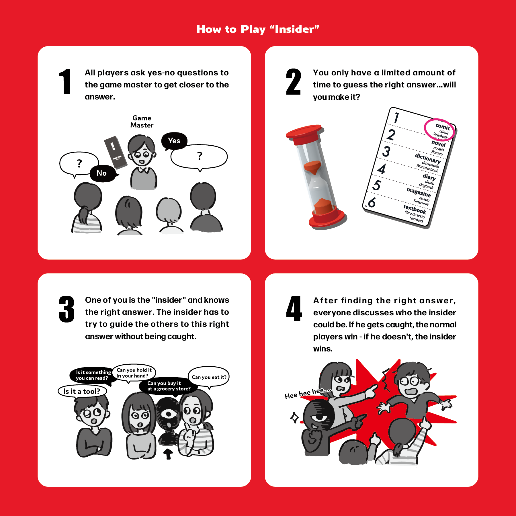 Партия в настольную игру Insider («Инсайдер») начинается с простого: ведущий загадывает слово, остальные задают ему вопросы, на которые он может отвечать только «да», «нет» или «не знаю». У игроков всего пять минут, чтобы отгадать слово — иначе все проигрывают. Однако в этом есть подвох: среди игроков есть Инсайдер, который уже знает правильный ответ и тайно направляет обсуждение в нужную сторону.