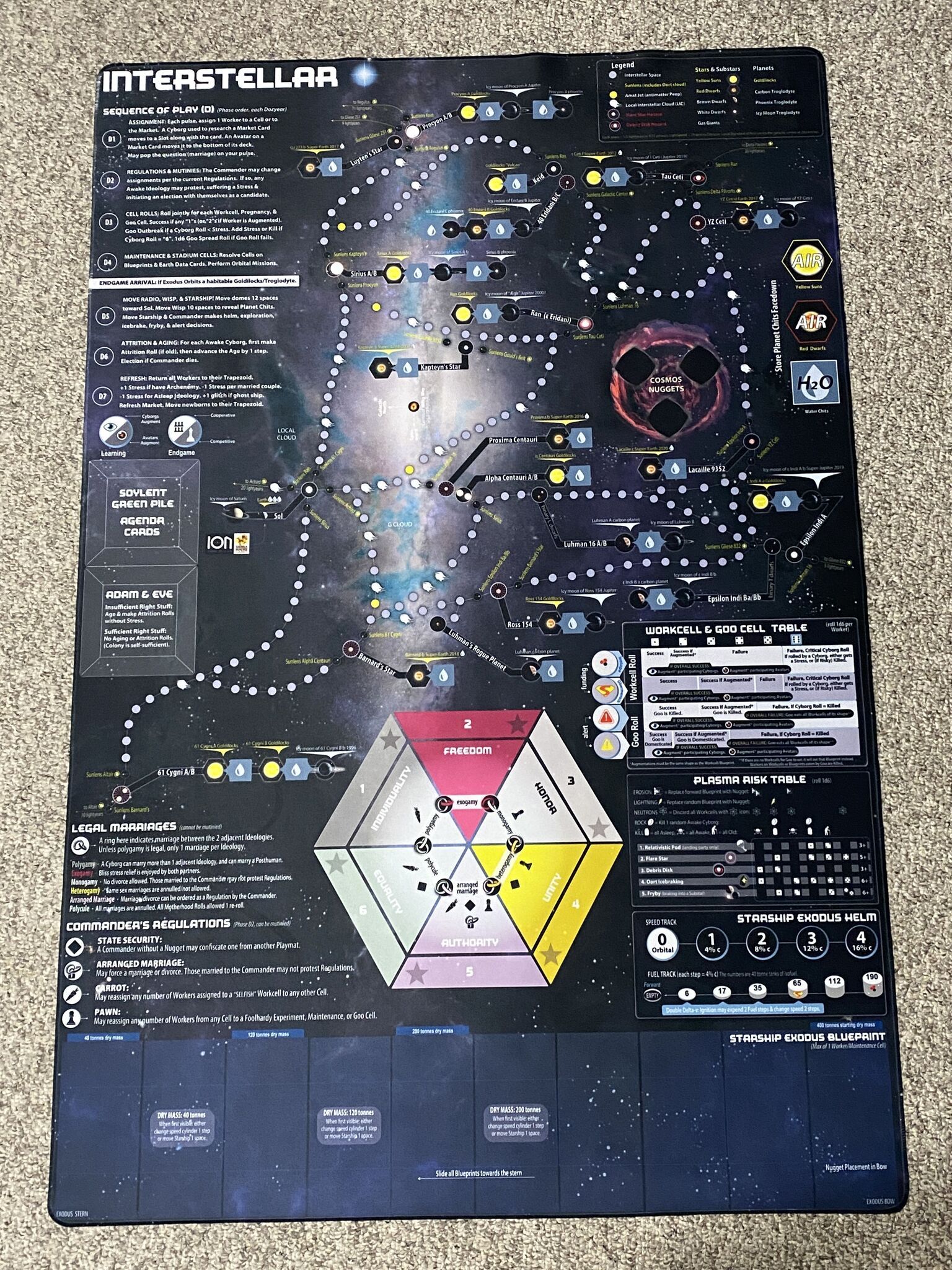 Каждый игрок в настольной игре Interstellar («Интерстеллар») управляет семью гибридами, обладающими особыми способностями. В течение партии вы будете размещать рабочих, выполнять действия, развивать технологии, необходимые для терраформирования, колонизации и обеспечения жизнедеятельности корабля. Решения, которые вы принимаете, повлияют на здоровье экипажа, стабильность миссии и шансы на успех.