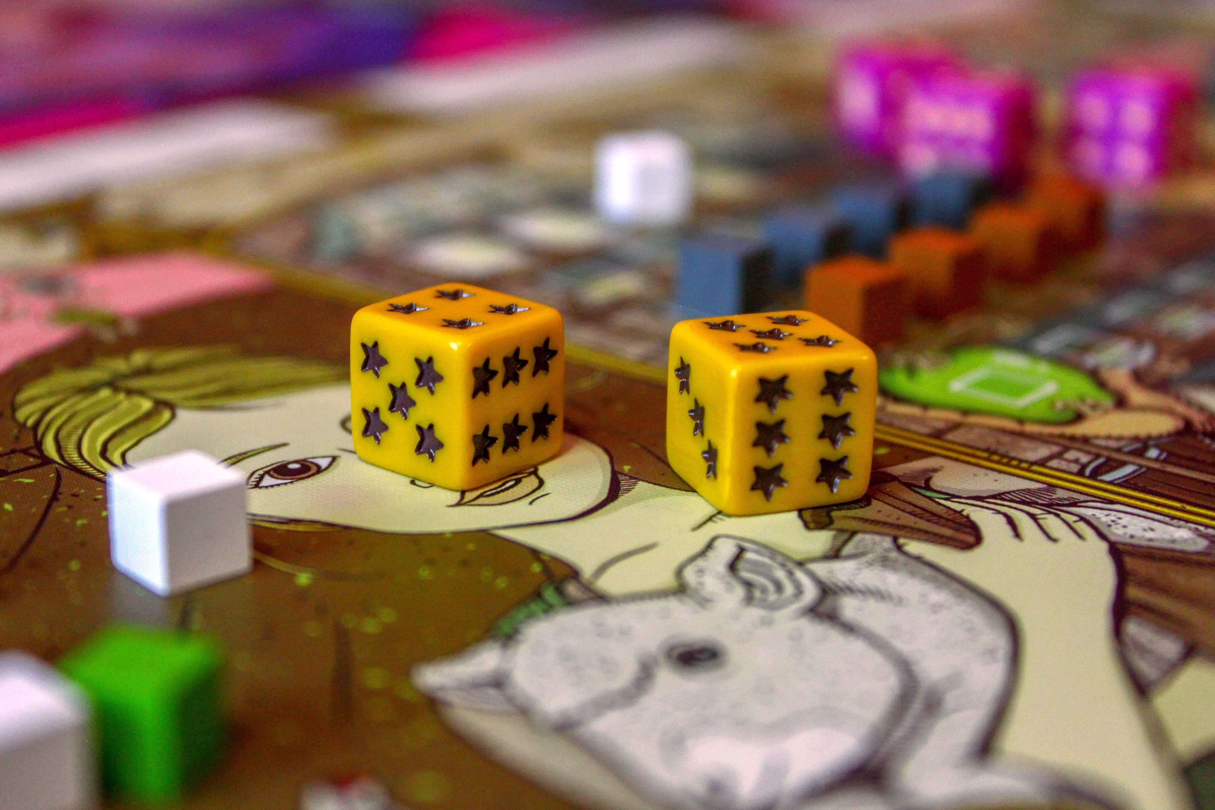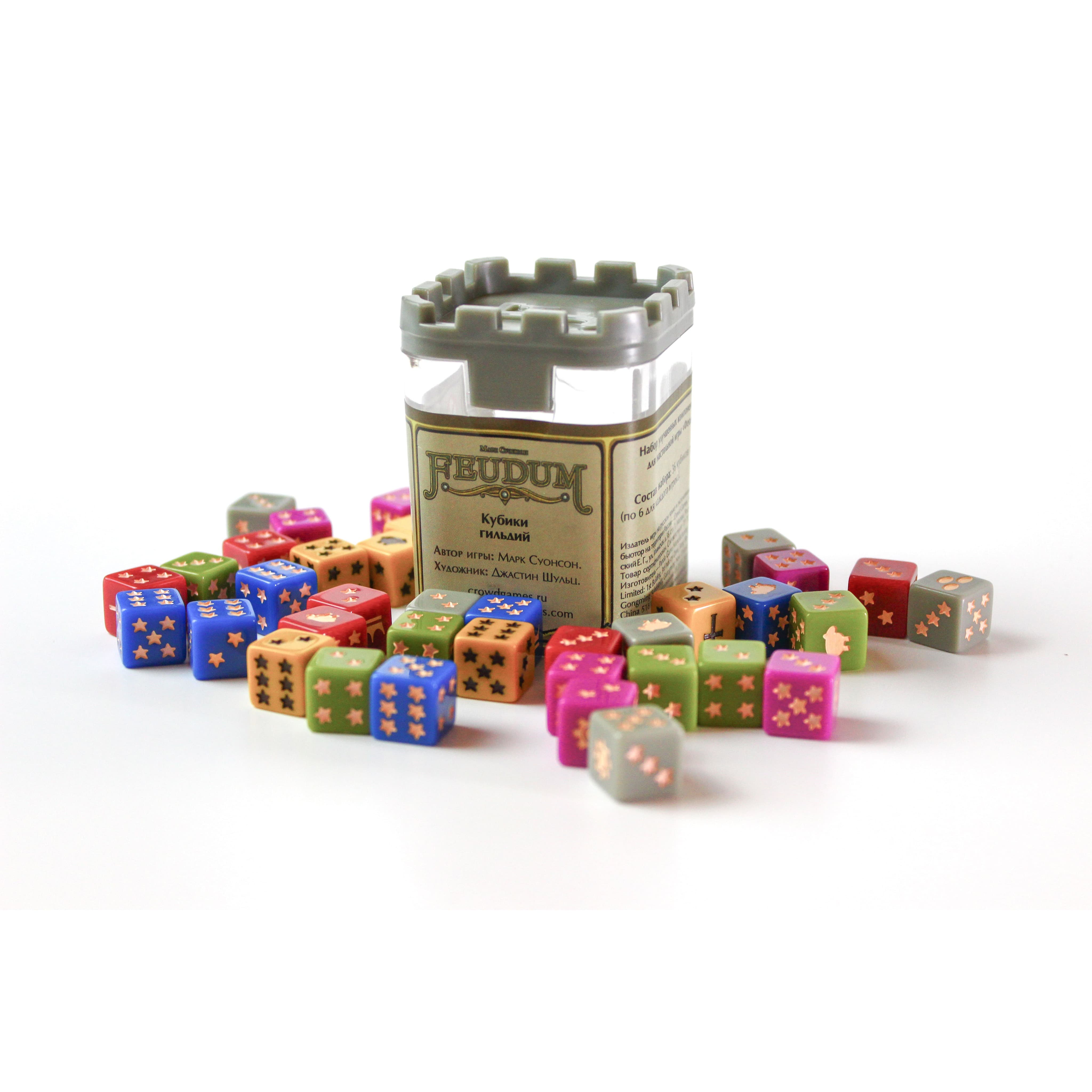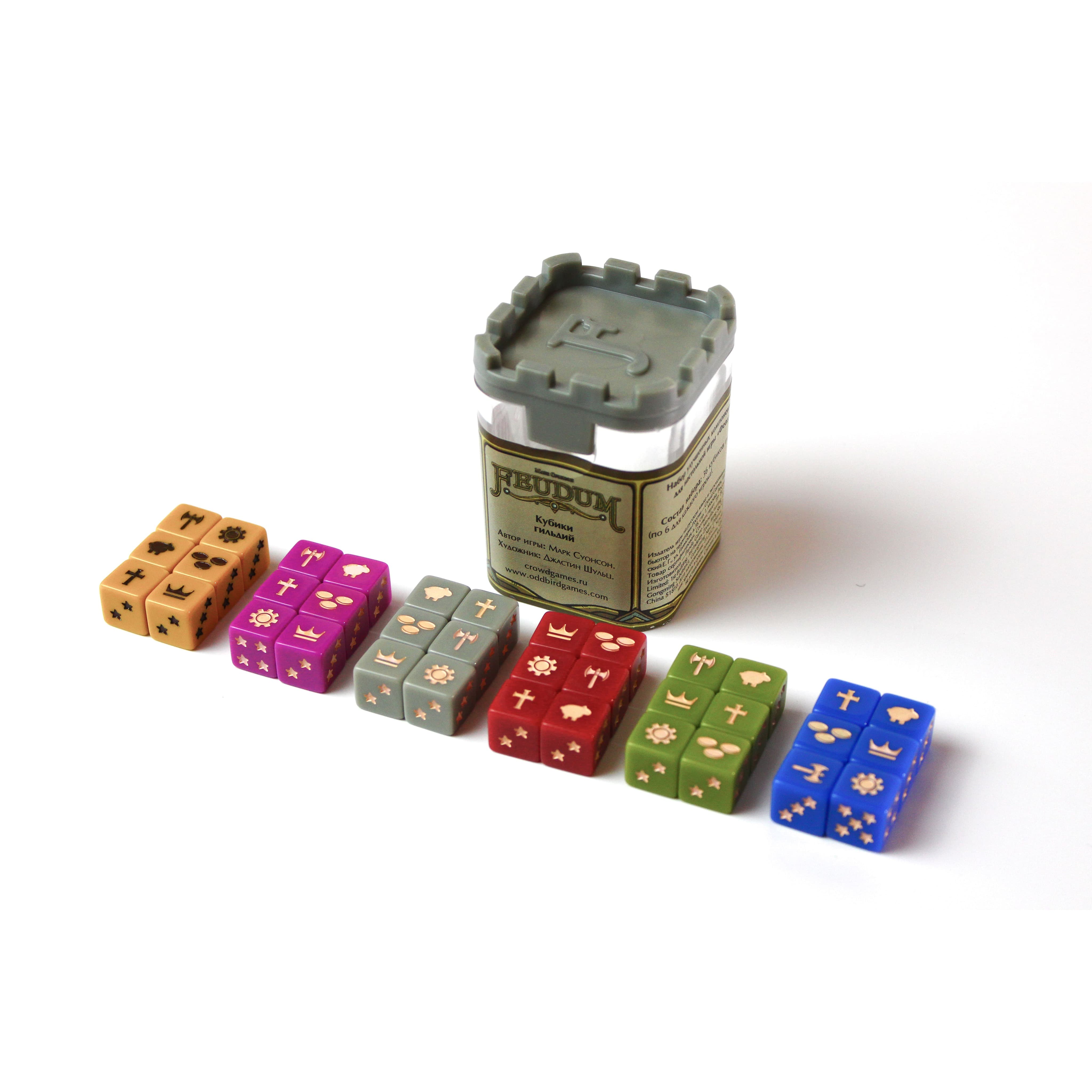 Удобный и красивый набор из 36 кубиков, по 6 кубиков каждого цвета игрока, упростит отслеживание вашего положения в каждой гильдии. Теперь ваши феодальные посиделки станут комфортнее!
