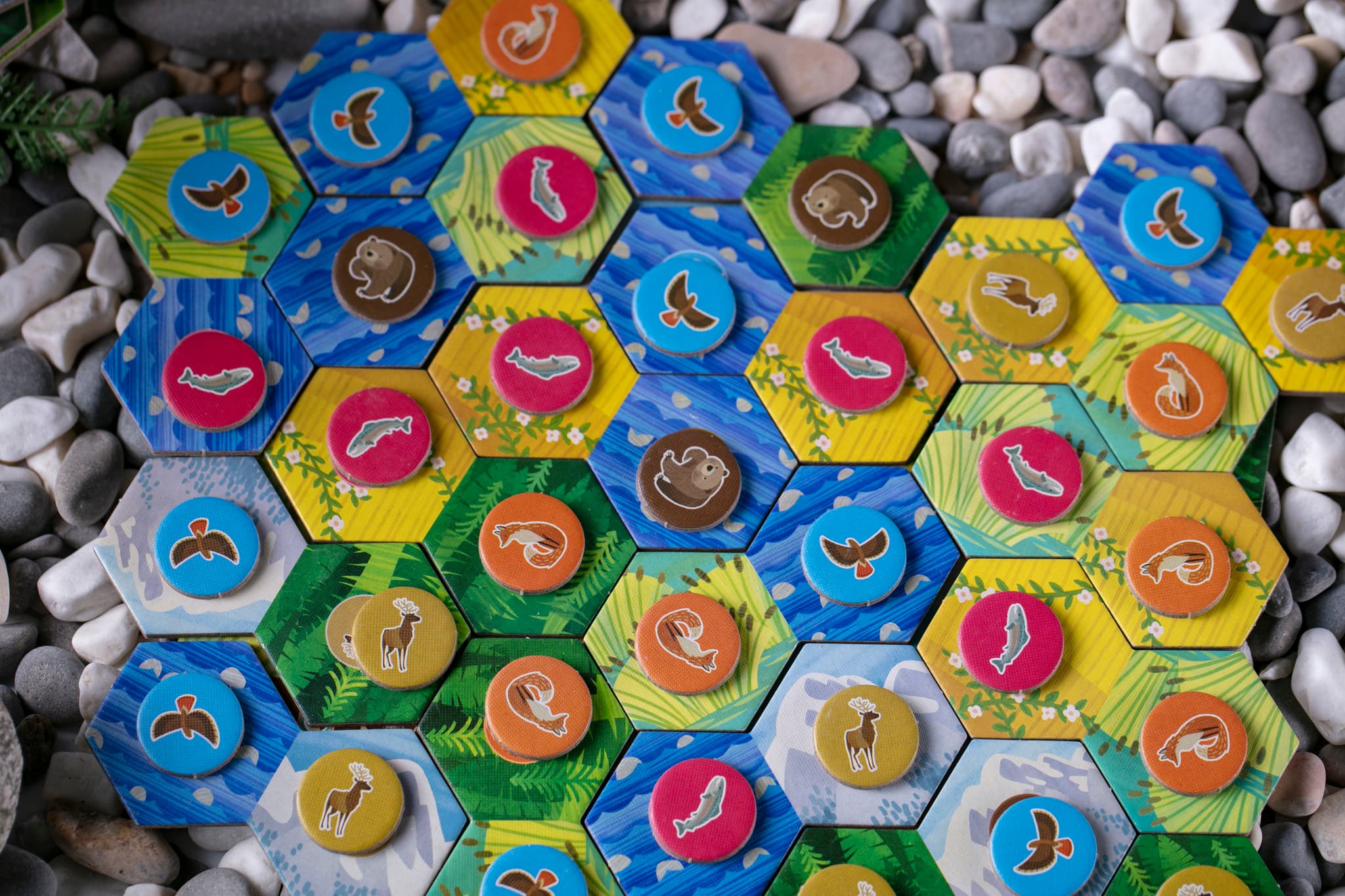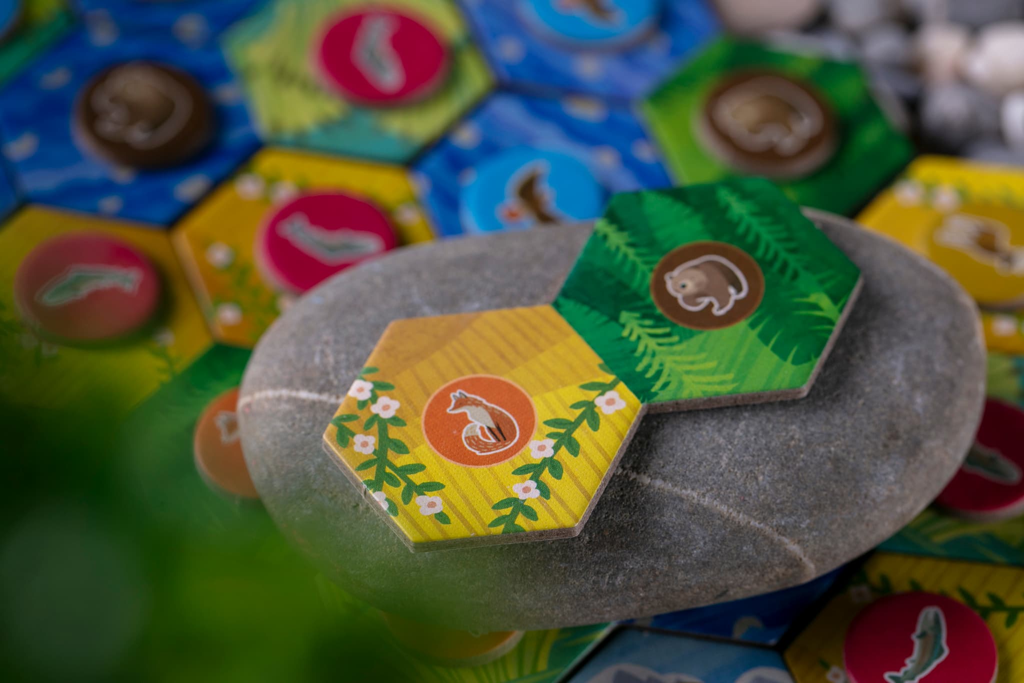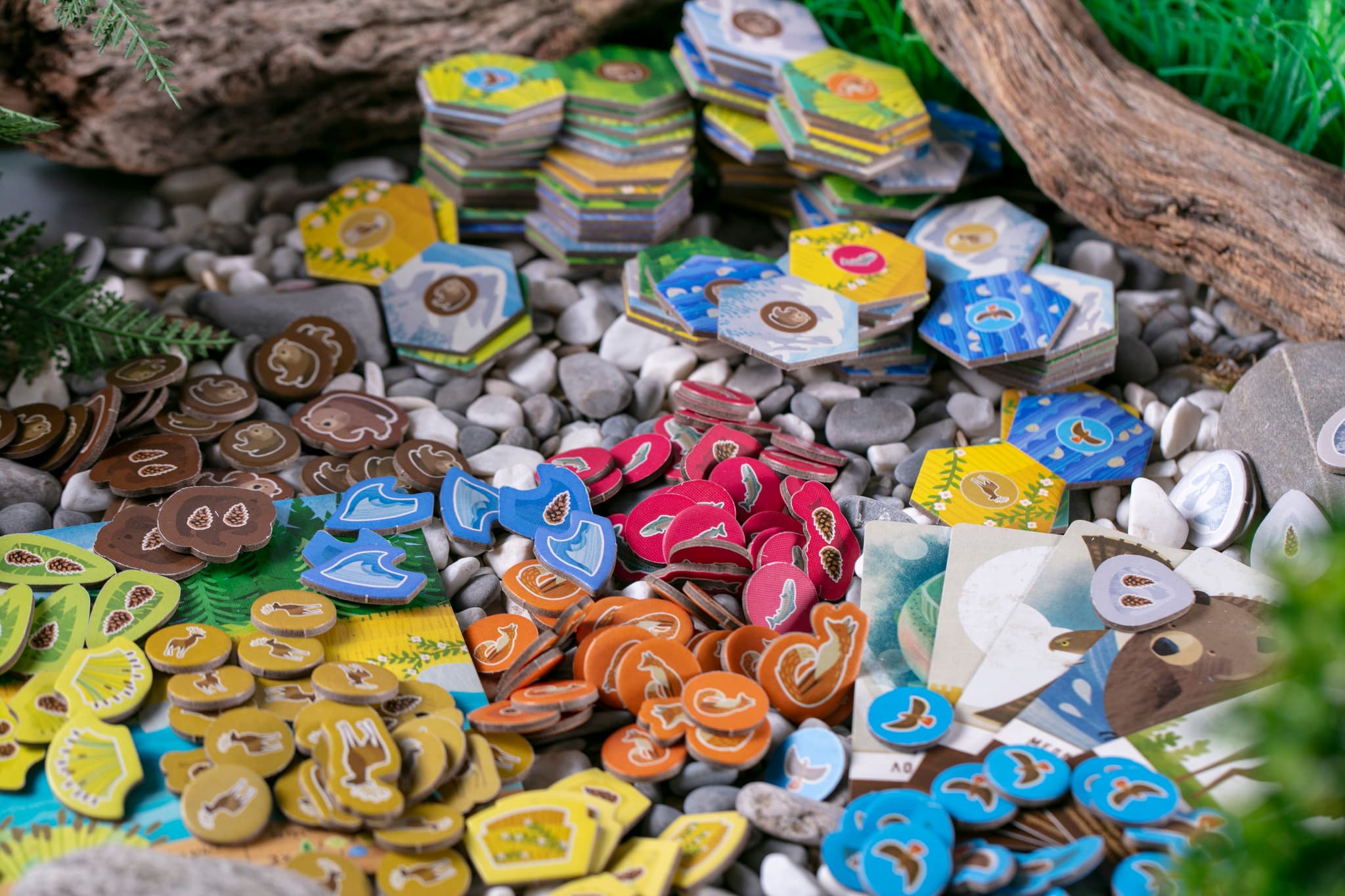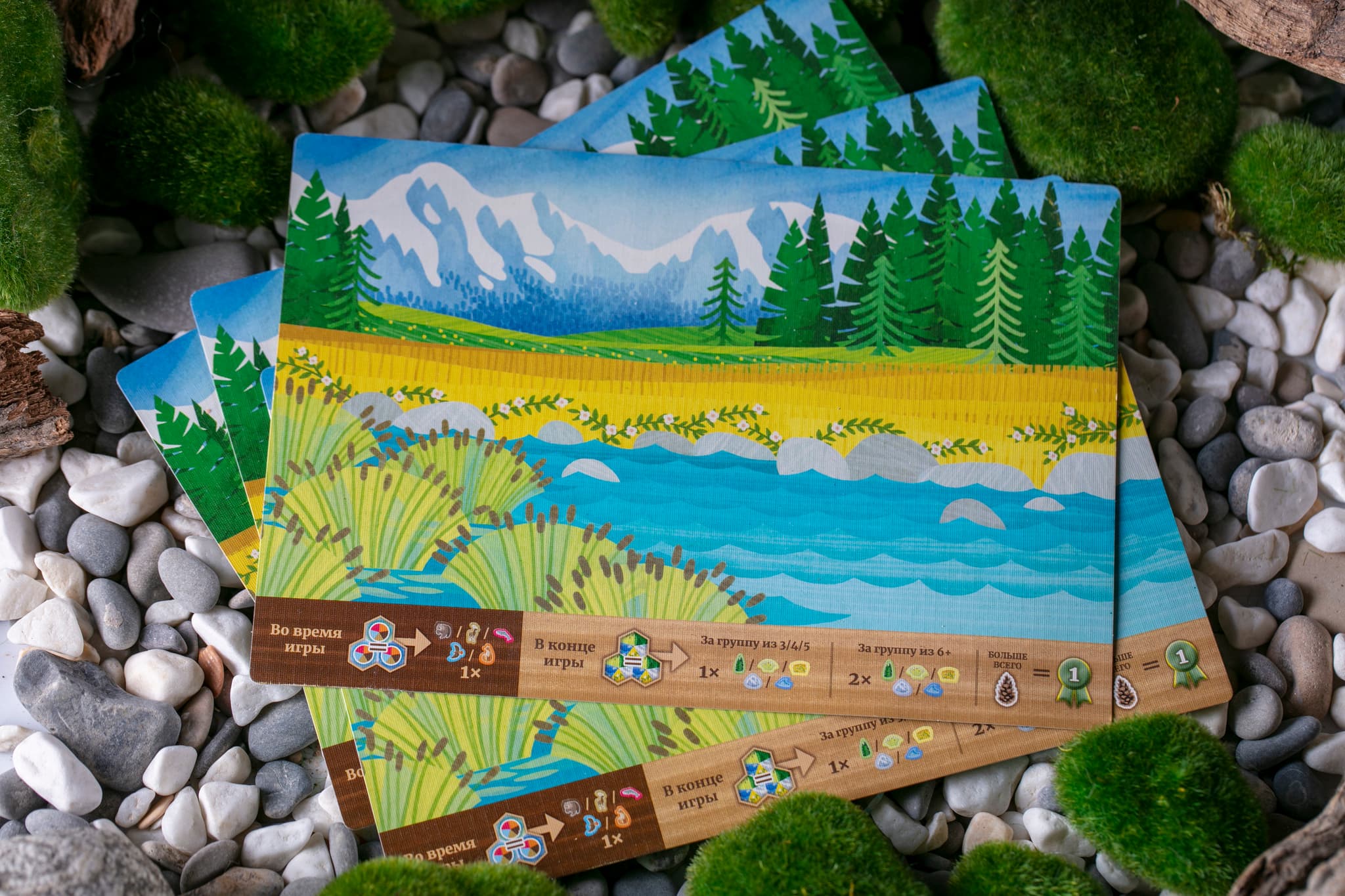 Это яркая и увлекательная игра для детей, которые только начинают знакомство с настольным миром. Здесь каждый игрок создаёт собственную экосистему: размещает жетоны местности, собирает группы животных и зарабатывает победные очки в виде милых шишечек. Партия длится всего десять ходов, а каждый из них — это маленький, но важный выбор, развивающий внимание, логическое и пространственное мышление.