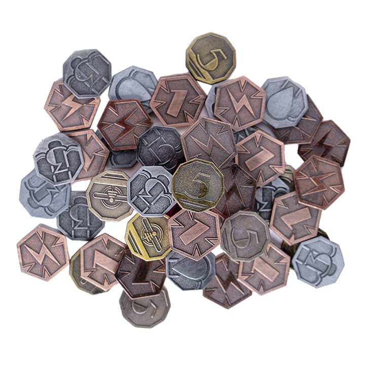 Стильные металлические монетки разной формы и цвета станут настоящим украшением игрового стола во время партии в игру «Плотина».