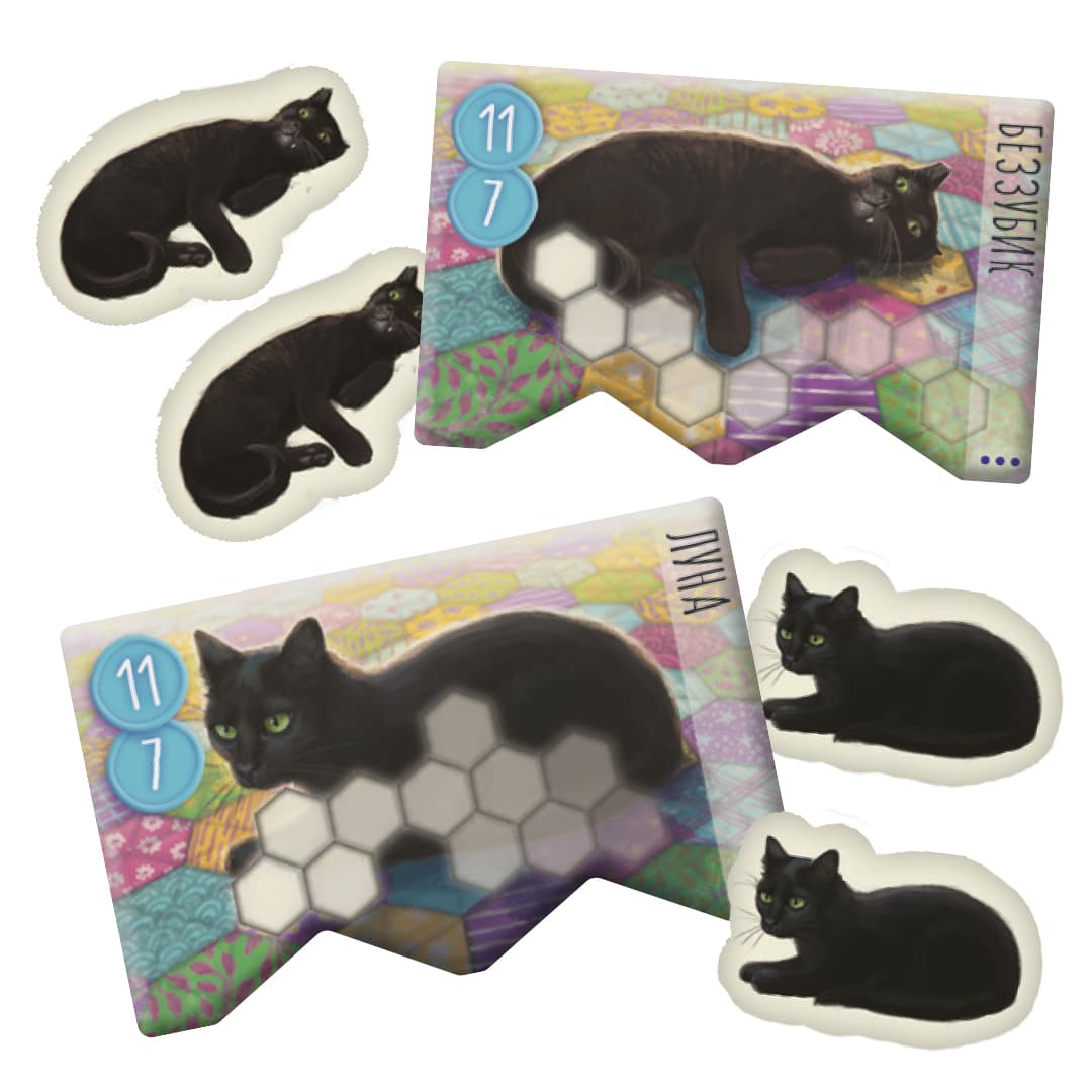Луна позволит игрокам посоревноваться за самую большую группу лоскутов на одеяле, а Беззубик — за самую длинную цепочку лоскутов. Как в понимаете, жетоны этих котиков будут переходить от игрока к игроку в течение партии. Но в финале они останутся только у тех, кто сумел собрать самые масштабные узоры.