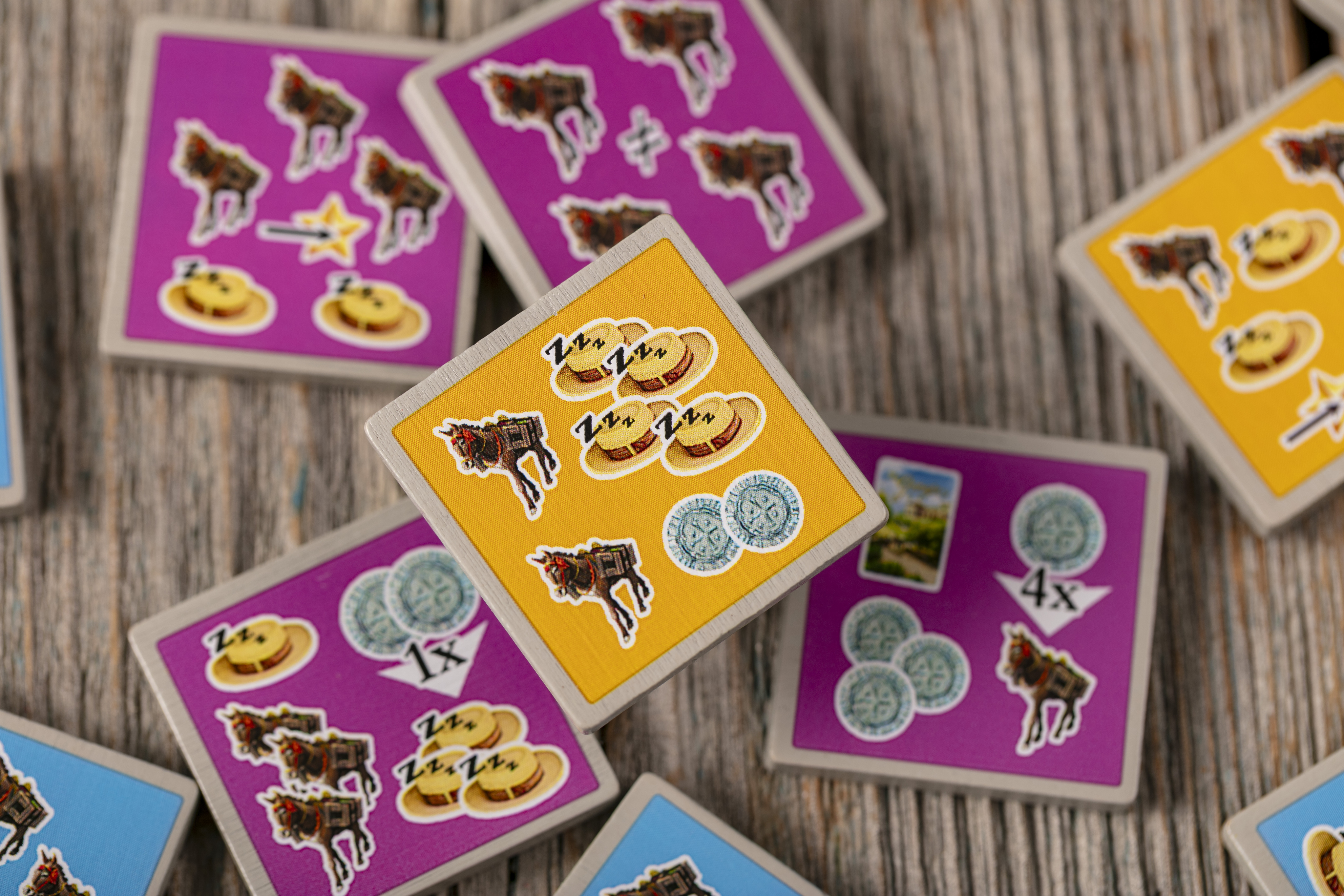 - 12 жетонов ослиной песни (по 4 синих, оранжевых и фиолетовых),