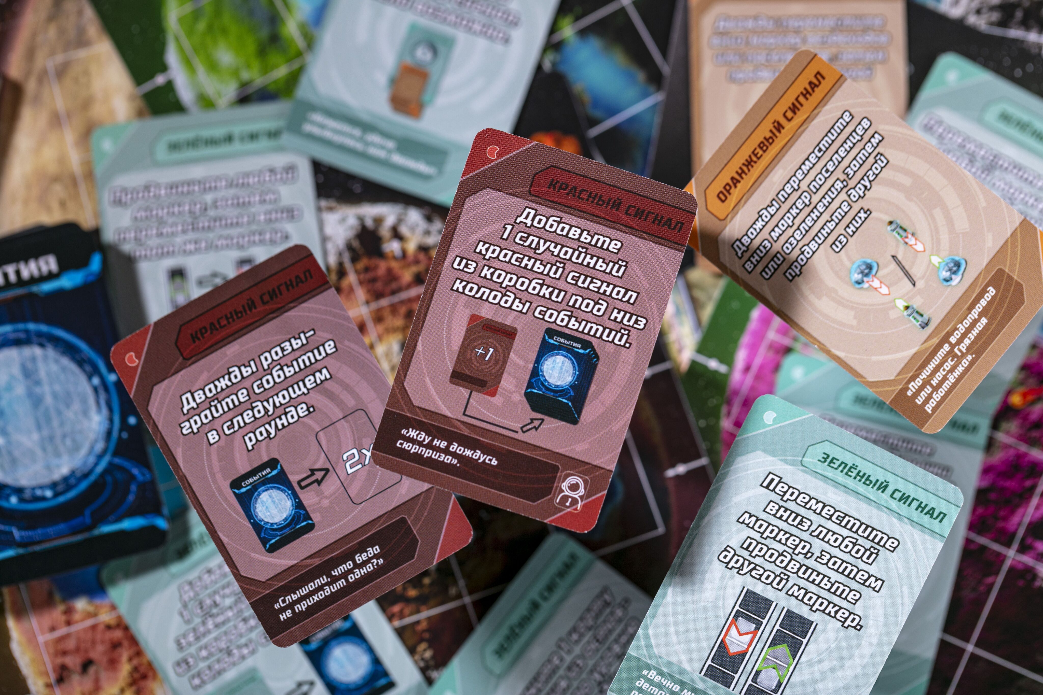 - 27 карт событий (9 с зелёным сигналом, 9 с оранжевым сигналом, 9 с красным сигналом)