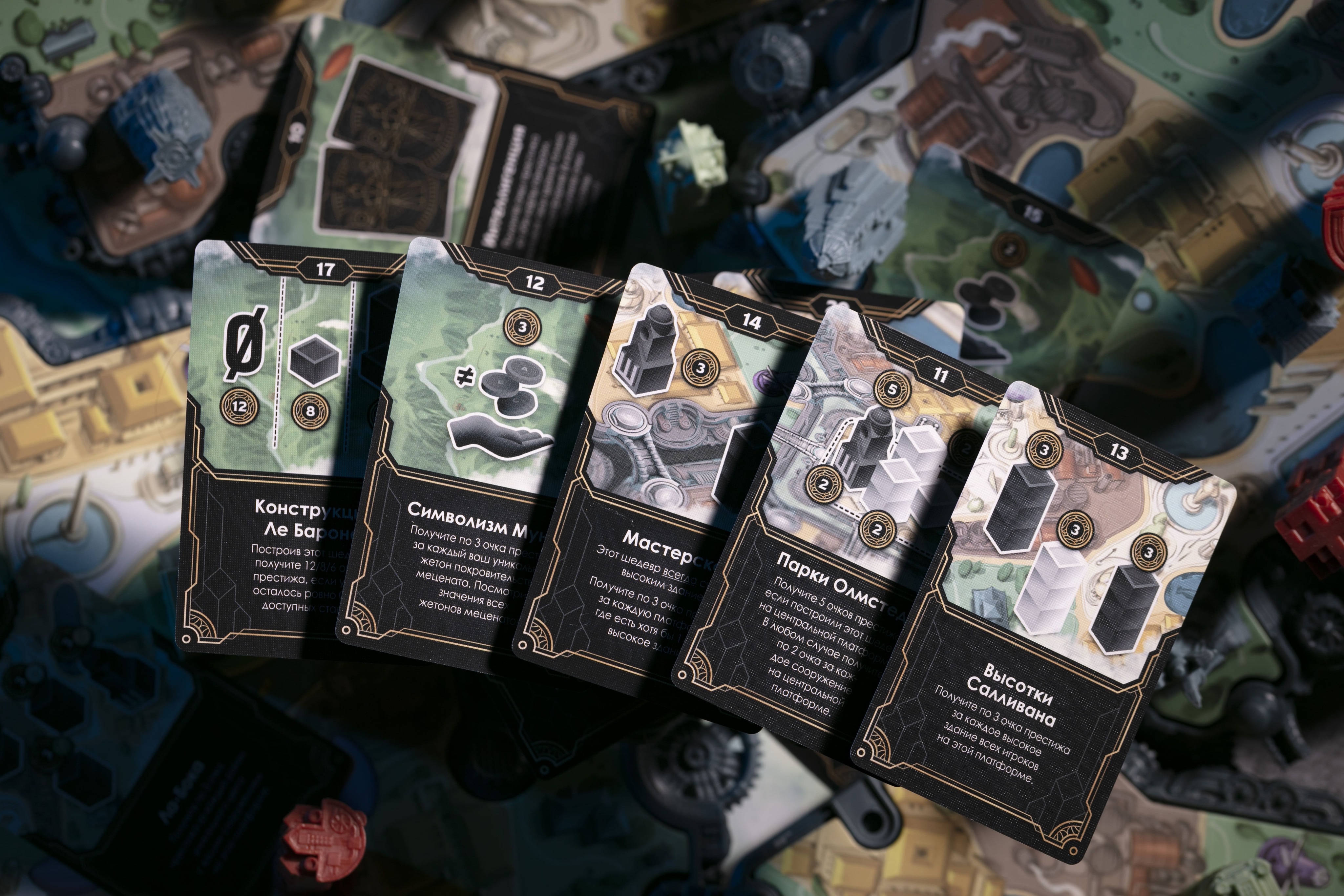 Начиная торги, вы размещаете здание с номером в одном из районов; номер определяет величину вашей ставки. Необычность этой системы заключается в том, что, перебивая вашу ставку, соперники начинают торговаться уже за соседние районы, а не первоначальный. Торги продолжаются, пока не спасуют все, кроме одного участника, который построит здание и получит награду района. Этот аспект добавляет совершенно новый слой планирования: например, иногда выгодно начать аукцион, даже не рассчитывая на победу, чтобы заставить соперника переплатить за необходимый ему соседний район. Игра прекрасно масштабируется: это тот редчайший случай, когда аукцион может проводиться даже вдвоём! Благодаря большому количеству карт целей и жетонов наград игра остаётся захватывающей на протяжении множества партий, каждый раз открывая новые возможности для тактических решений.