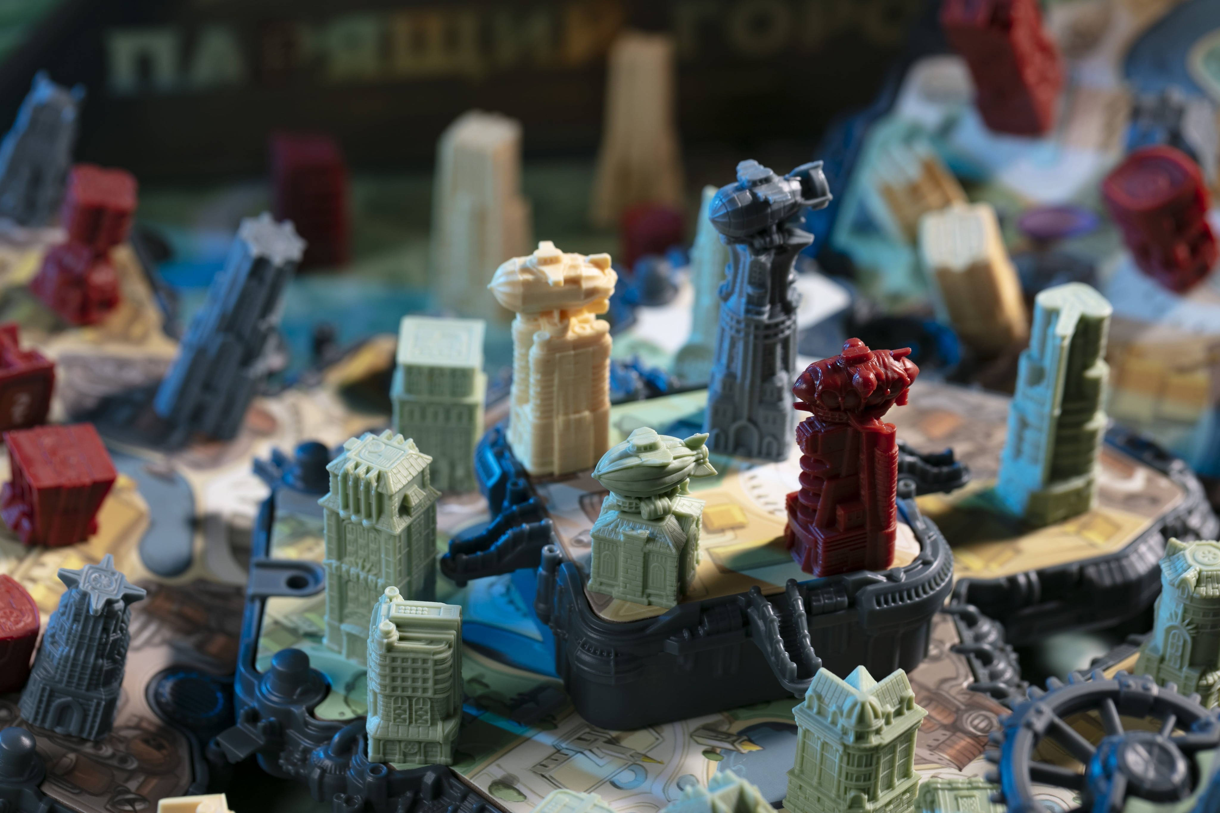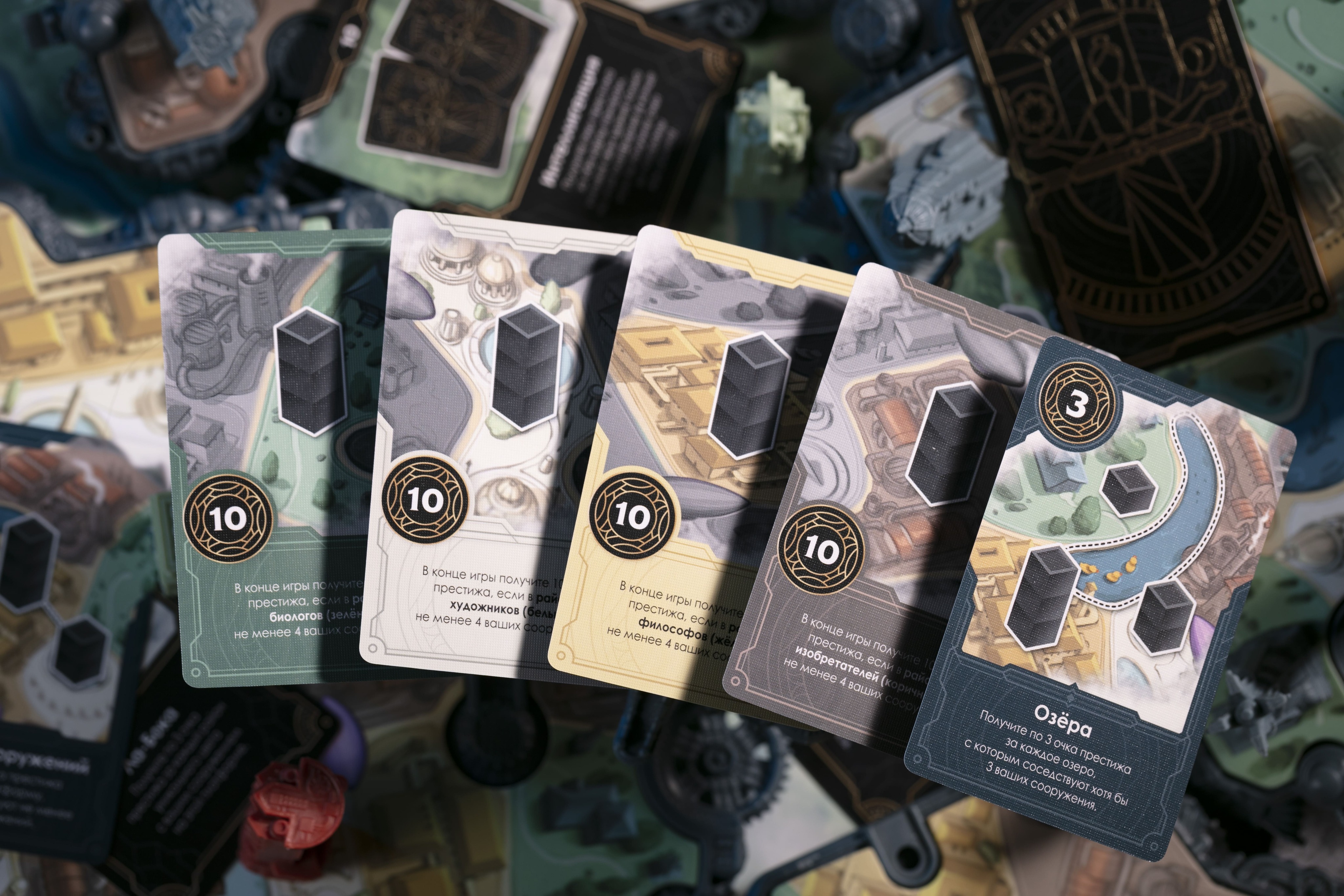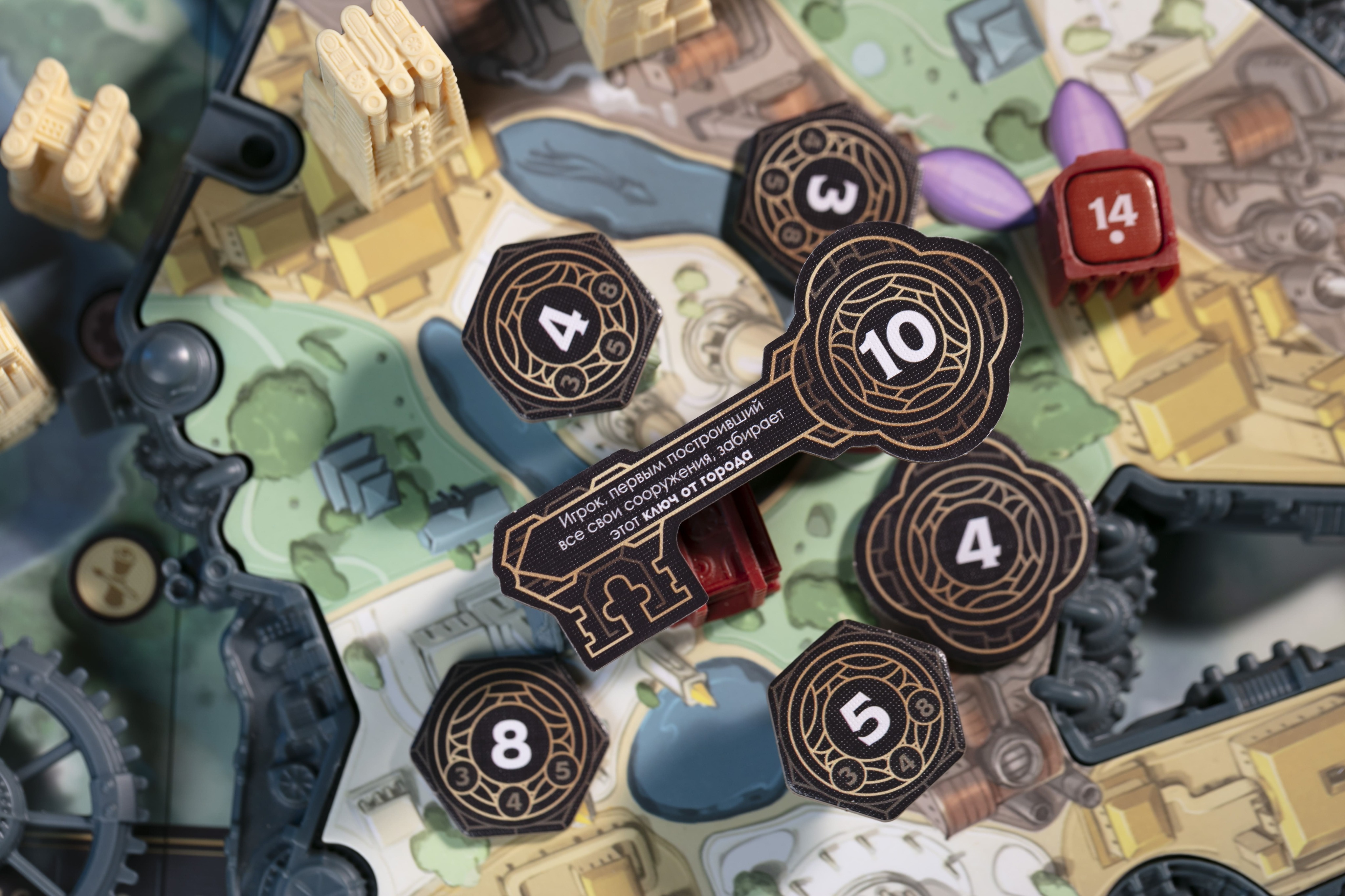 Начиная торги, вы размещаете здание с номером в одном из районов; номер определяет величину вашей ставки. Необычность этой системы заключается в том, что, перебивая вашу ставку, соперники начинают торговаться уже за соседние районы, а не первоначальный. Торги продолжаются, пока не спасуют все, кроме одного участника, который построит здание и получит награду района. Этот аспект добавляет совершенно новый слой планирования: например, иногда выгодно начать аукцион, даже не рассчитывая на победу, чтобы заставить соперника переплатить за необходимый ему соседний район. Игра прекрасно масштабируется: это тот редчайший случай, когда аукцион может проводиться даже вдвоём! Благодаря большому количеству карт целей и жетонов наград игра остаётся захватывающей на протяжении множества партий, каждый раз открывая новые возможности для тактических решений.