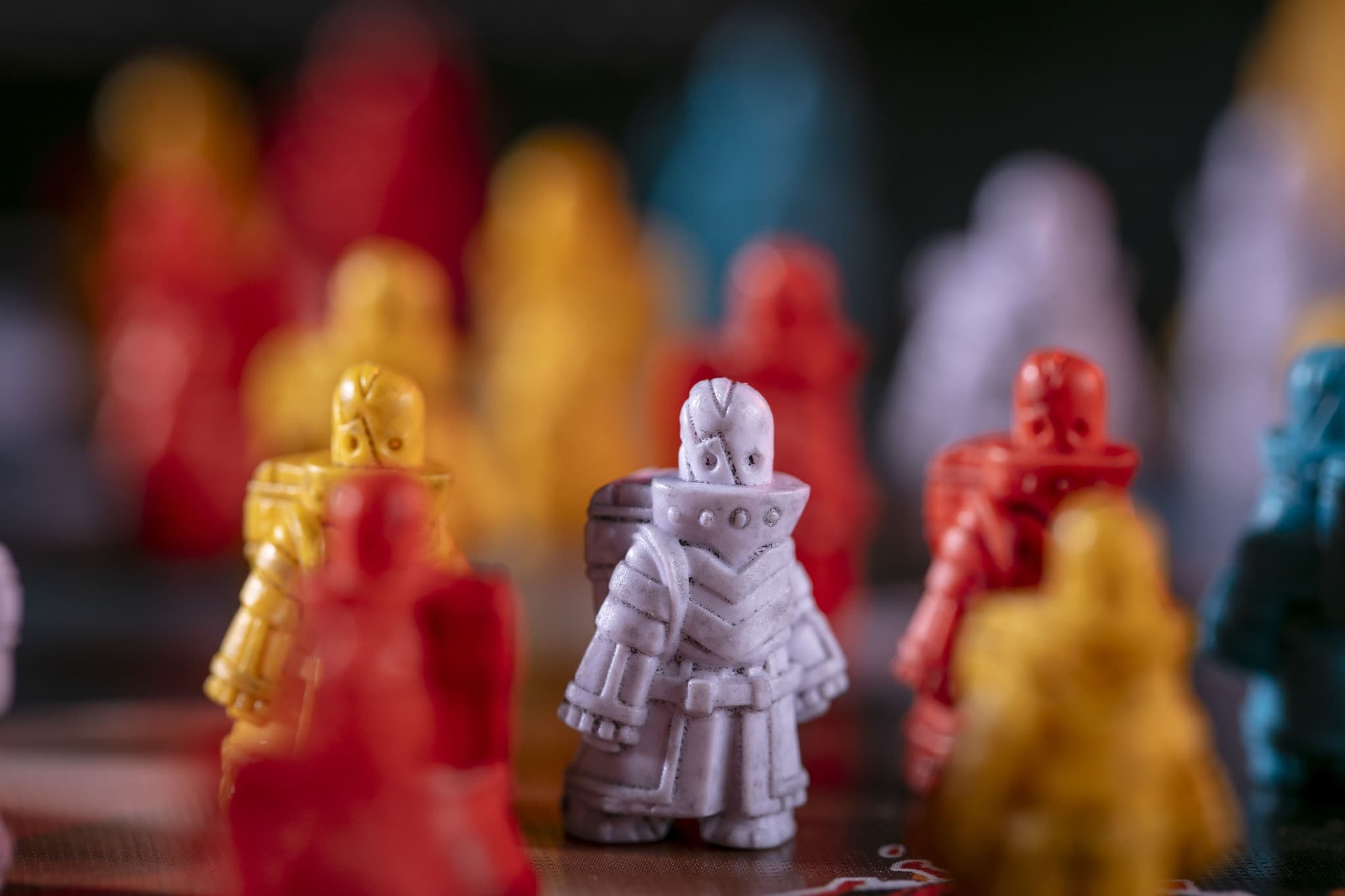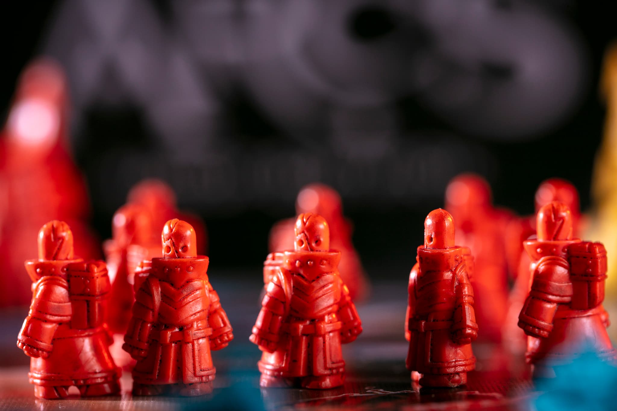 Фигурки окрашены в тёмные оттенки специальной краской в технике «проливки», что помогает создать тени и выделить мельчайшие детали и текстуры. Такой подход создаёт эффект глубины, делая каждую миниатюру более выразительной. Визуальные акценты на гранях и рельефах подчёркивают уникальные особенности дизайна, усиливая погружение в игровой процесс и делая фигурки более удобными для восприятия во время партии.