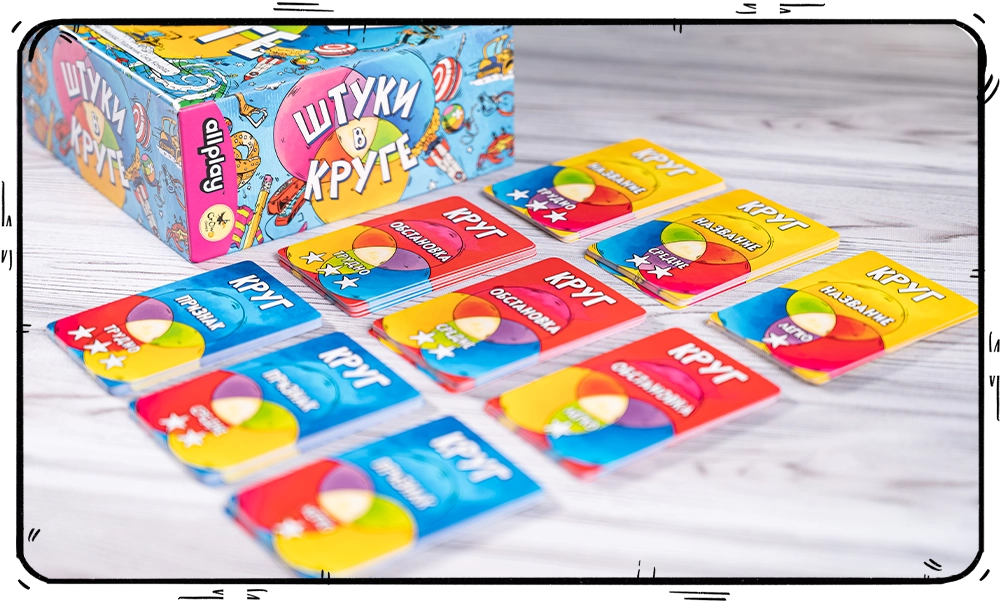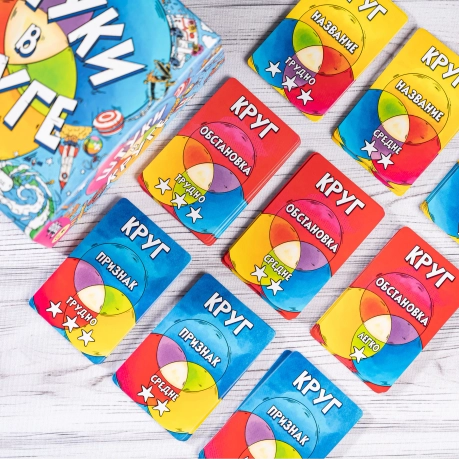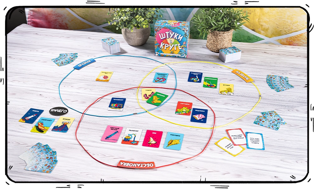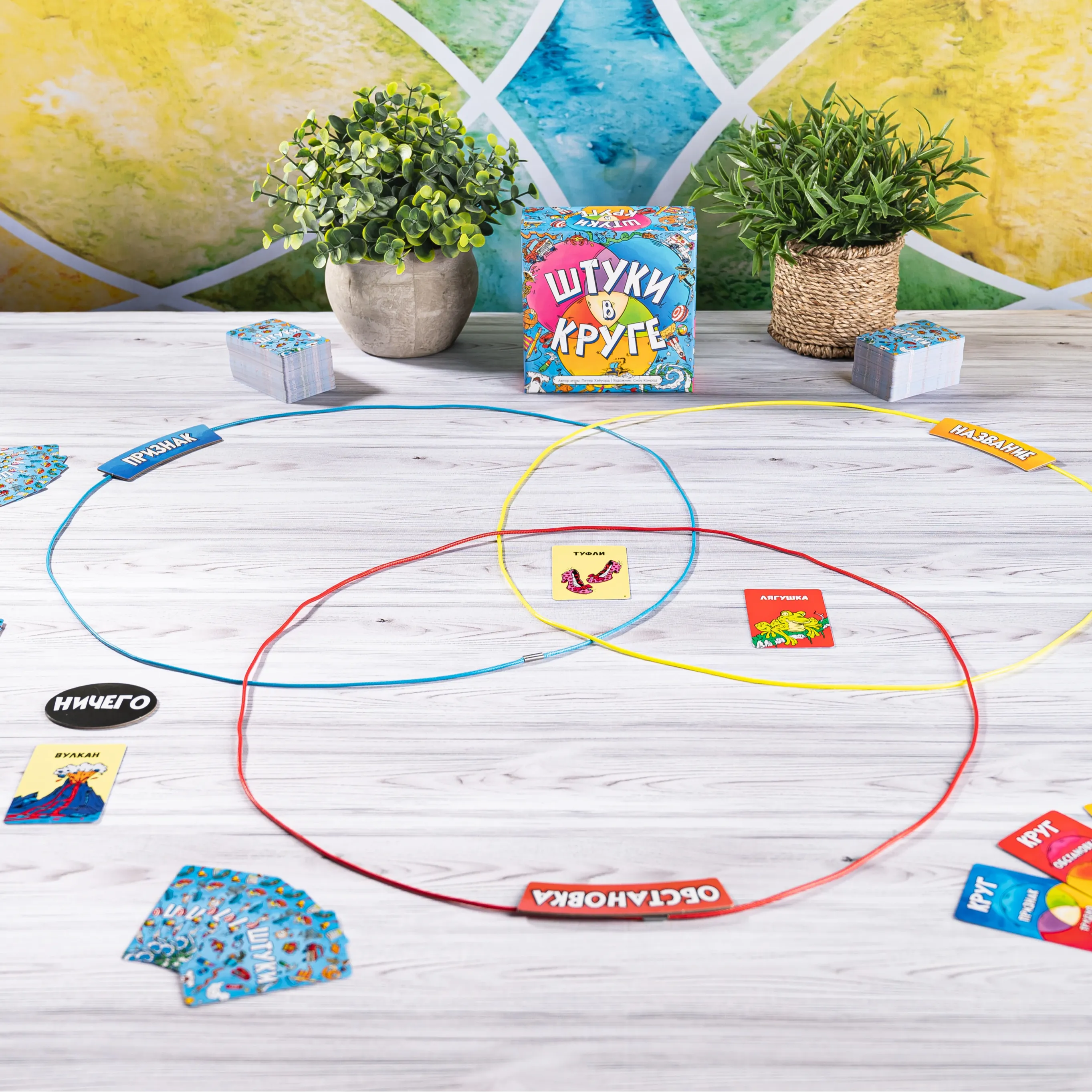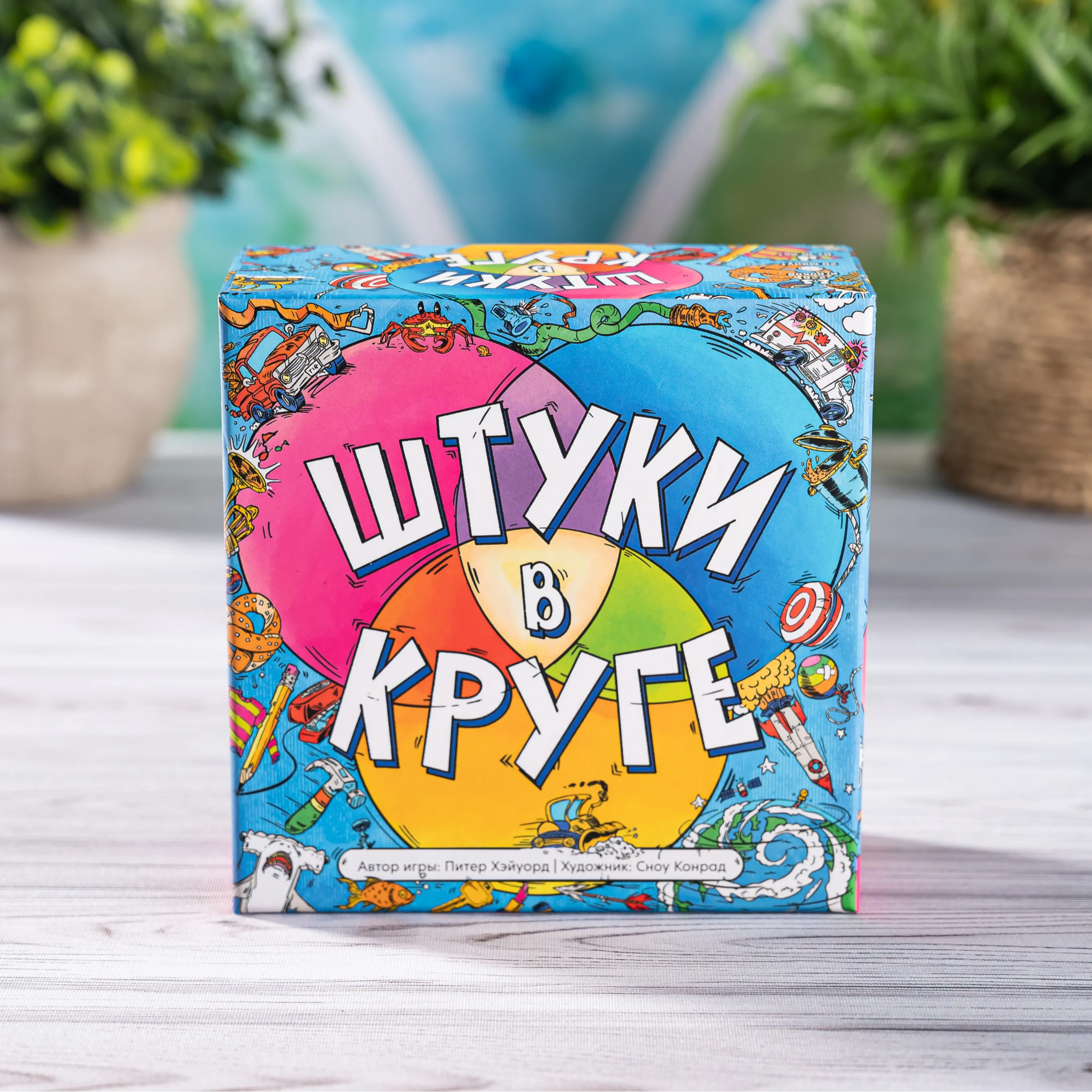 «Штуки в круге» — это игра для вечеринок, в которой вам нужно будет разгадать секретные правила пересекающихся кругов. Каждый круг — скрытый принцип, известный только одному игроку. Он выкладывает несколько карт-примеров, а ваша задача — понять логику и правильно размещать свои штуки.