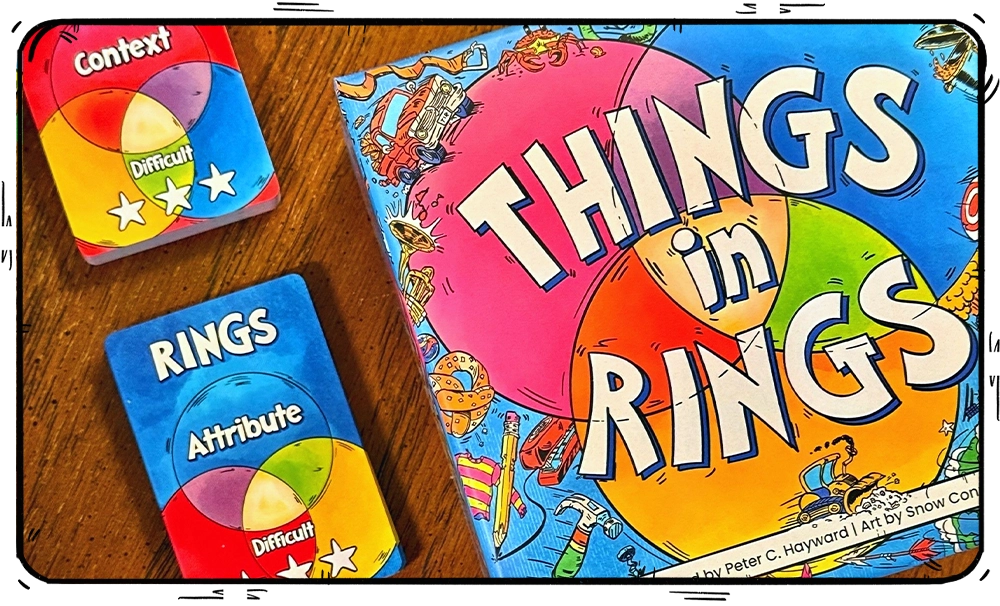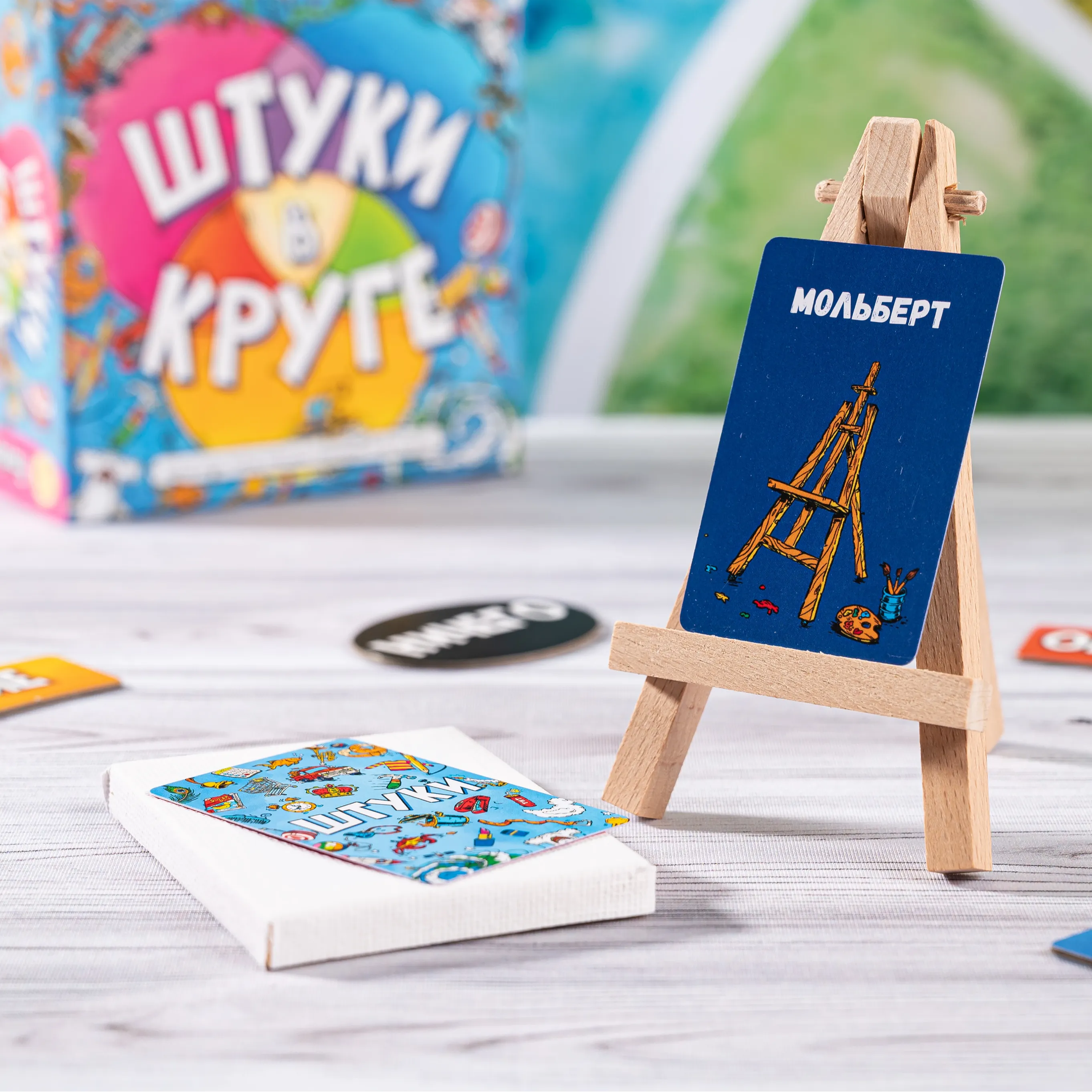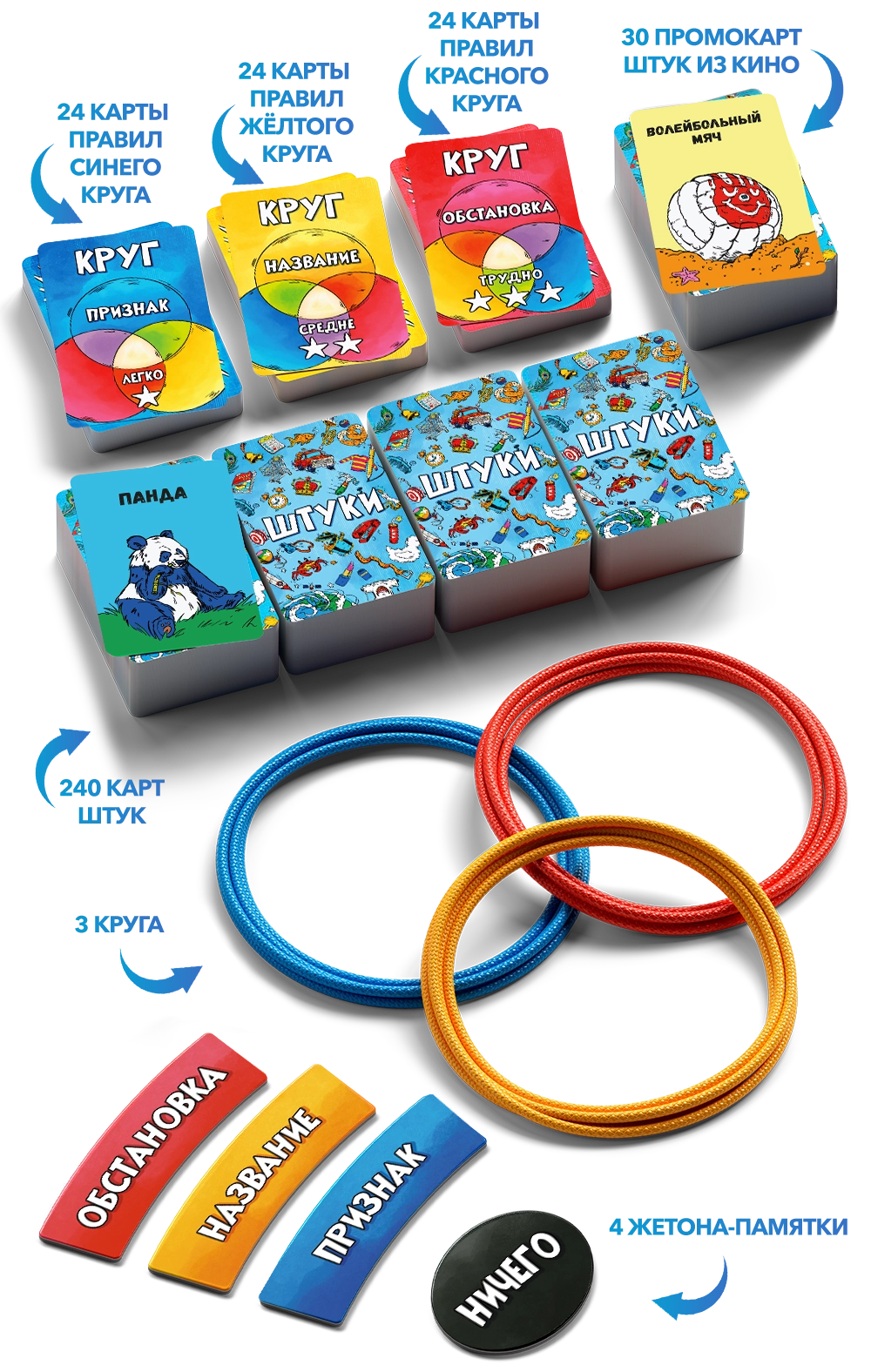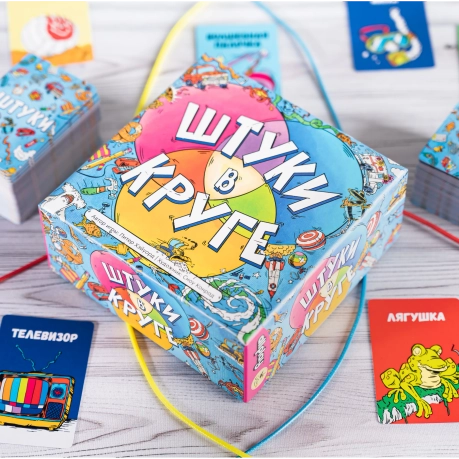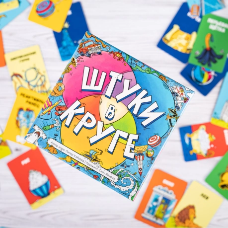 «Штуки в круге» — это игра для вечеринок, в которой вам нужно будет разгадать секретные правила пересекающихся кругов. Каждый круг — скрытый принцип, известный только одному игроку. Он выкладывает несколько карт-примеров, а ваша задача — понять логику и правильно размещать свои штуки.