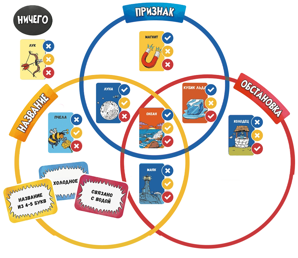 Мастер вытягивает по одной карте правила для каждого круга и выкладывает в круги три карты штук, чтобы показать, как эти правила работают. Каждая штука может оказаться в одном круге или в пересечении сразу нескольких.