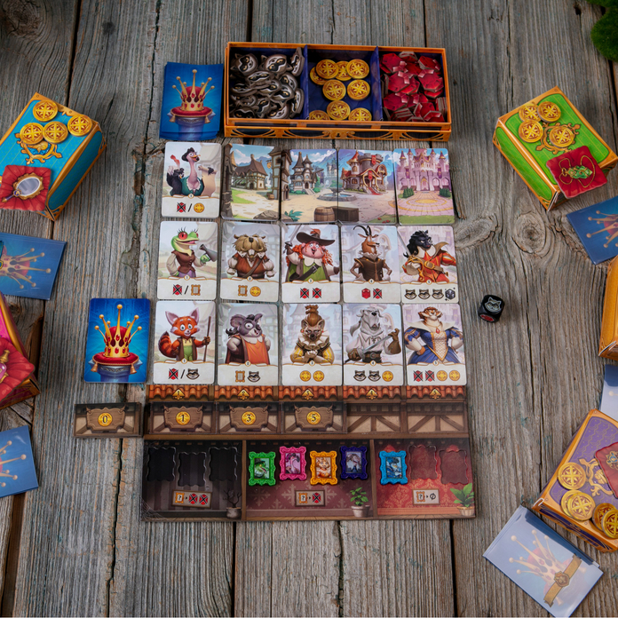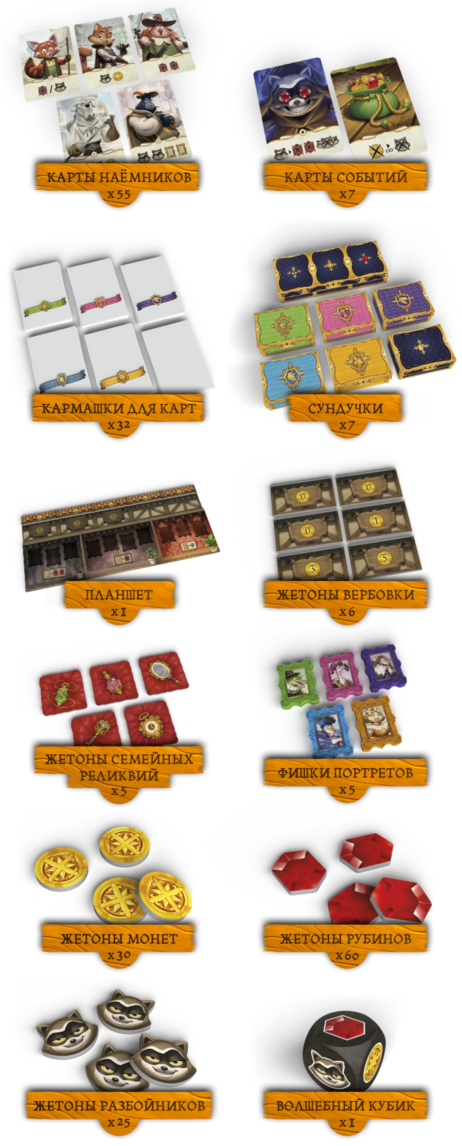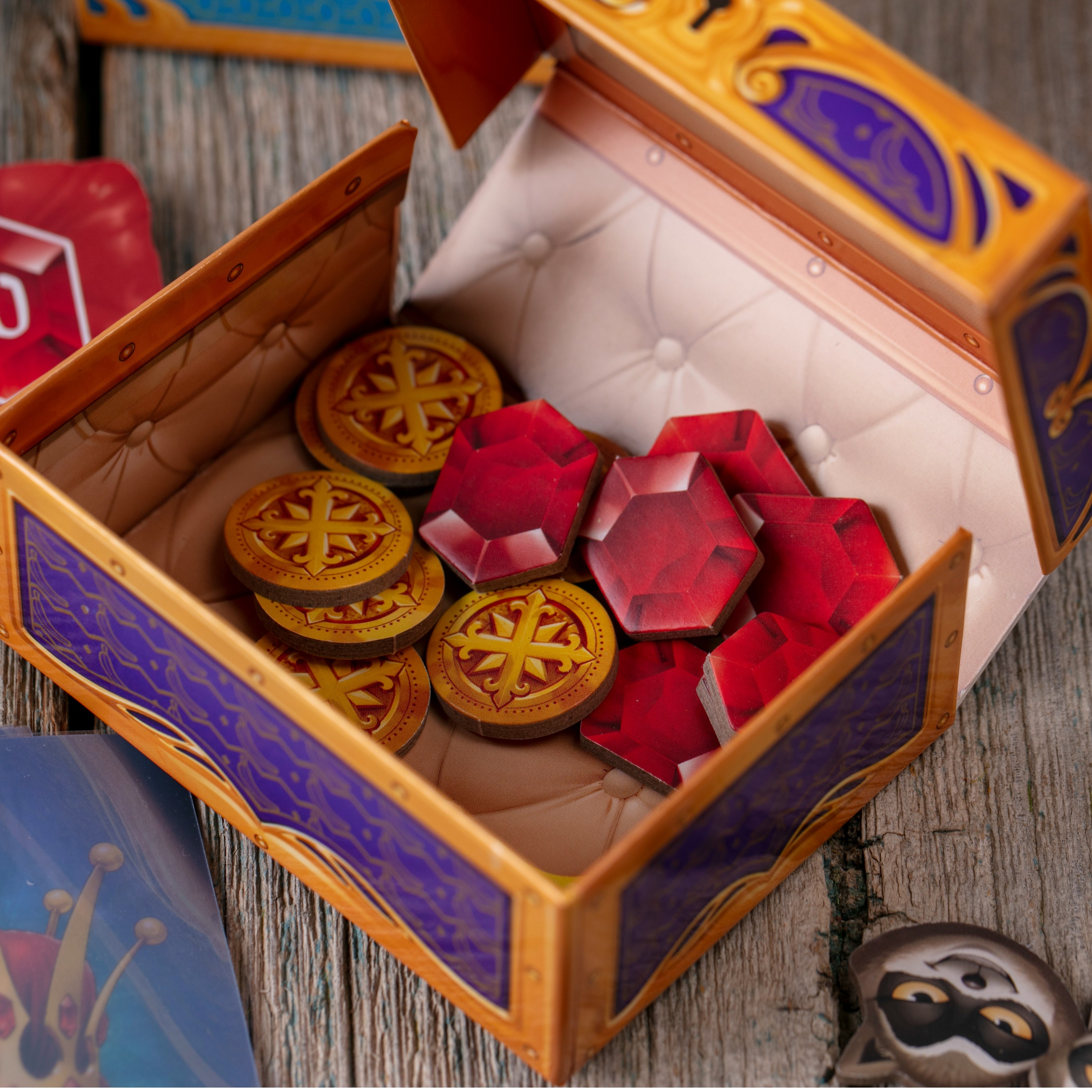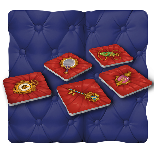 Каждый игрок начинает с двадцатью рубинами: десять в жетонах и десять в виде семейной реликвии — фамильного сокровища, передаваемого из поколения в поколение. Это не просто украшение, а сердце вашего дома, залог престижа и надежды на корону.