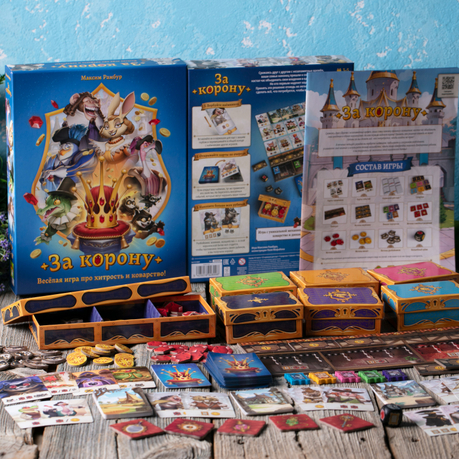 «За корону!» — замечательная игра для компании от 3 до 5 игроков с необычной механикой. Как вы, наверное, уже догадались, здесь исход партии решают интриги.